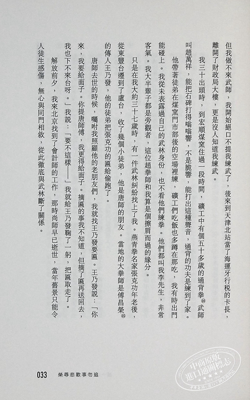李仲軒先生以七十餘年武學實踐,講述他所師承的民國年間三位形意拳大師唐維祿、尚雲祥和薛顛的言行、造詣,以及二十世紀三四十年代武林中人的生活實情、習武者特有的思維意識和為我中華所獨有的身體訓練法門。秘傳與絕技之外,更有生活理念、生命感悟的餘音。