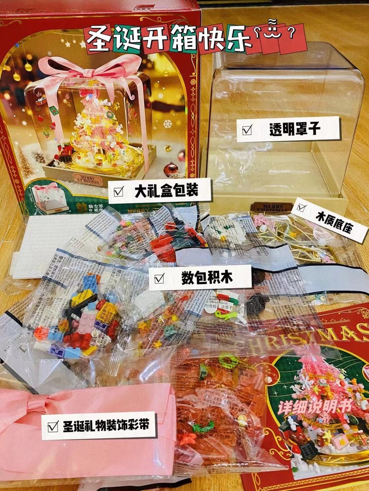 而且设计很用心!包装很漂亮! ✅超大礼盒包装!送礼yyds! ✅一体式无切割亚克力罩子,美观不积灰 ✅木质底座移动方便 ✅每一颗都晶莹剔透!拼搭过程都超级治愈解压! 这款积木水晶圣诞树也太仙气了! 今年的礼物就得不一样的“surprise”