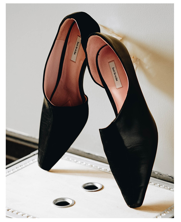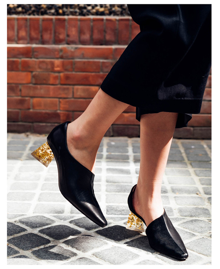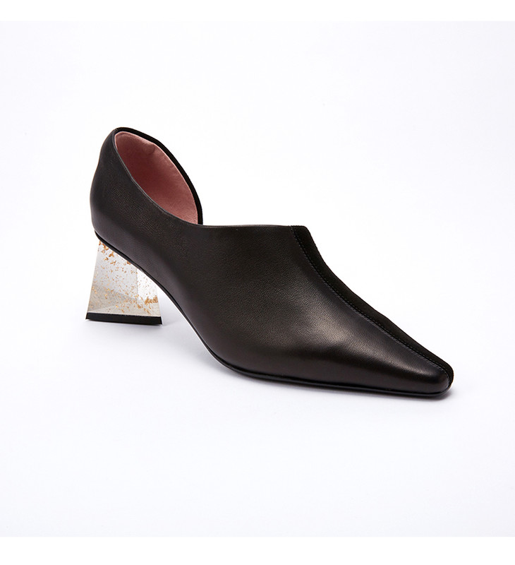 lost in echo方头银箔跟不对称单鞋 黑色浅口牛皮粗跟高跟女鞋