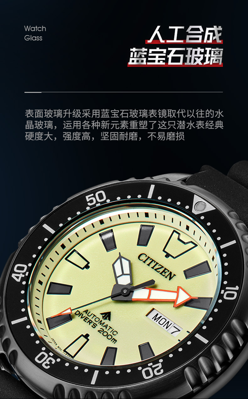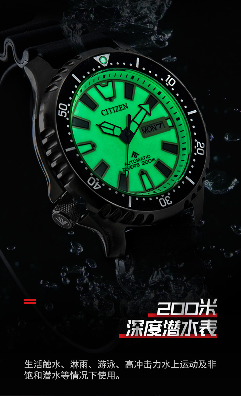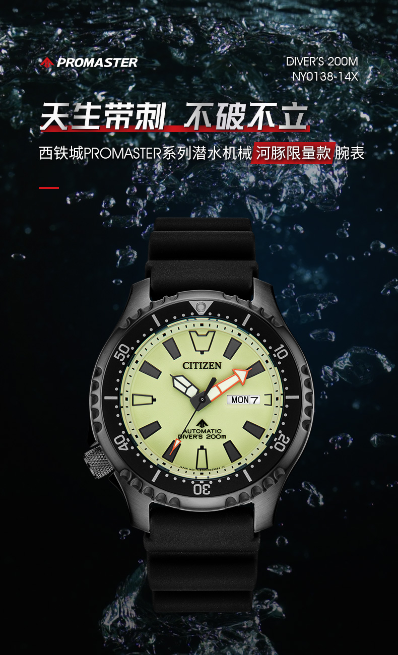 西铁城日本官方正品不锈钢覆BIP河豚二代PU橡胶表带200米潜水星期日历机械表NY0138-14XB