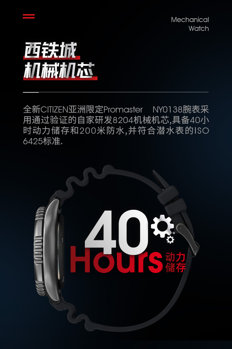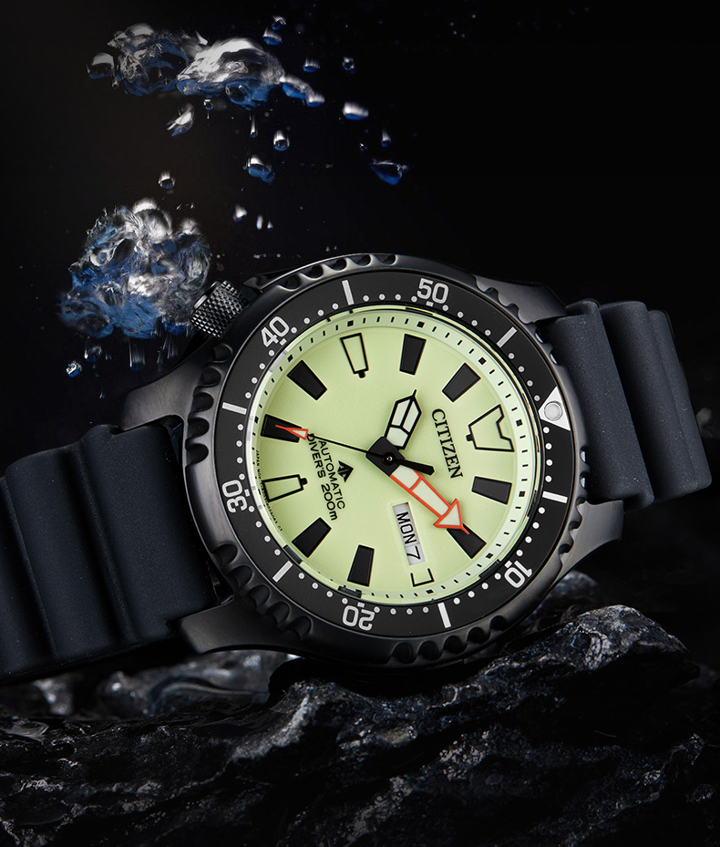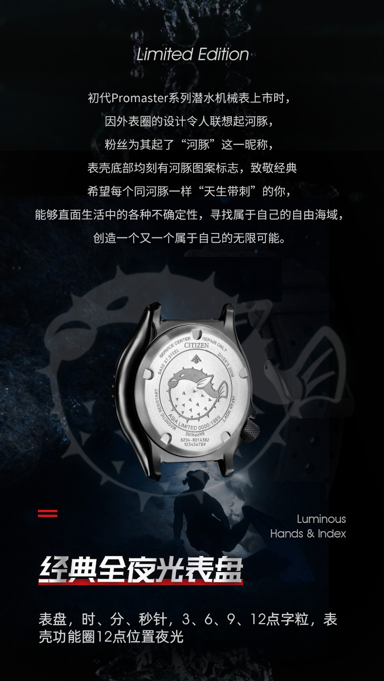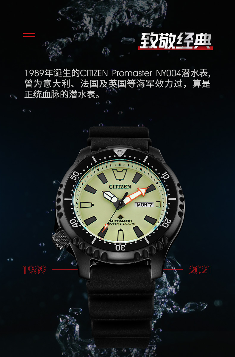 西铁城日本官方正品不锈钢覆BIP河豚二代PU橡胶表带200米潜水星期日历机械表NY0138-14XB