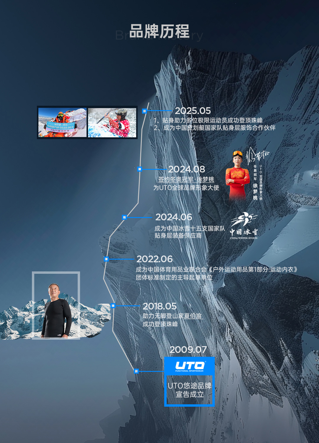 UTO悠途潜心于贴身运动装备的研发、设计和生产。从纤维到组织,从设计到工艺,在无缝贴身运动装备领域,树立国内标杆。 UTO着力于品牌互联网化,不断采集大量运动数据,为跑步、健身、滑雪等不同类型的运动爱