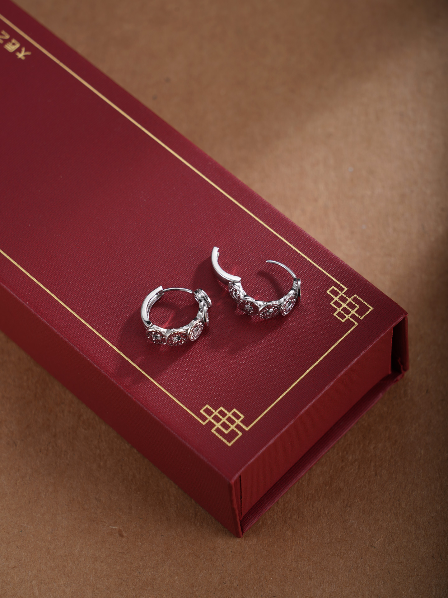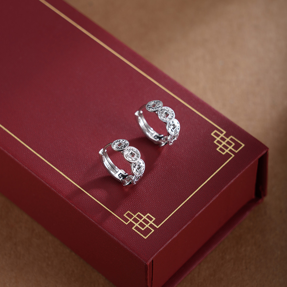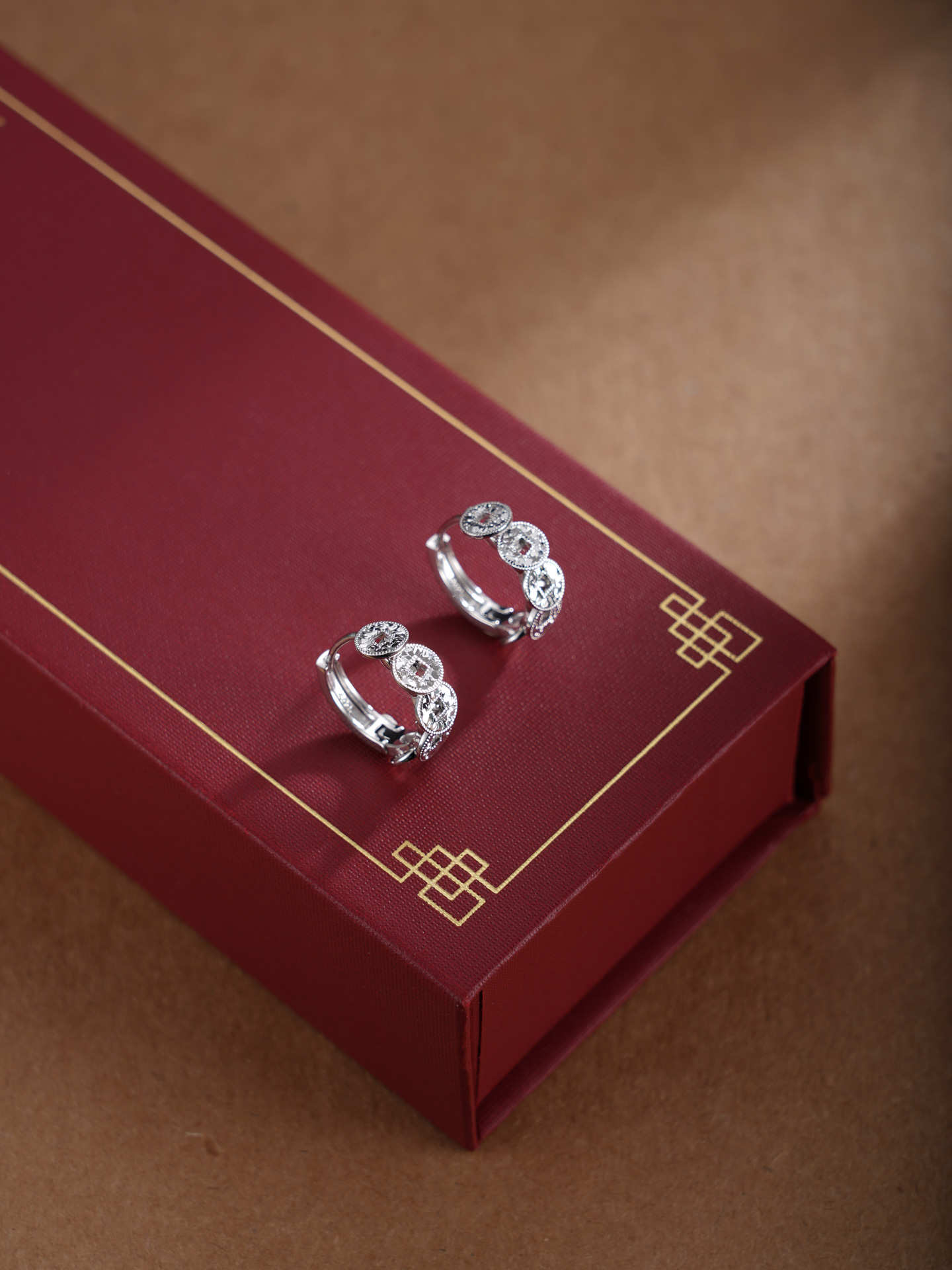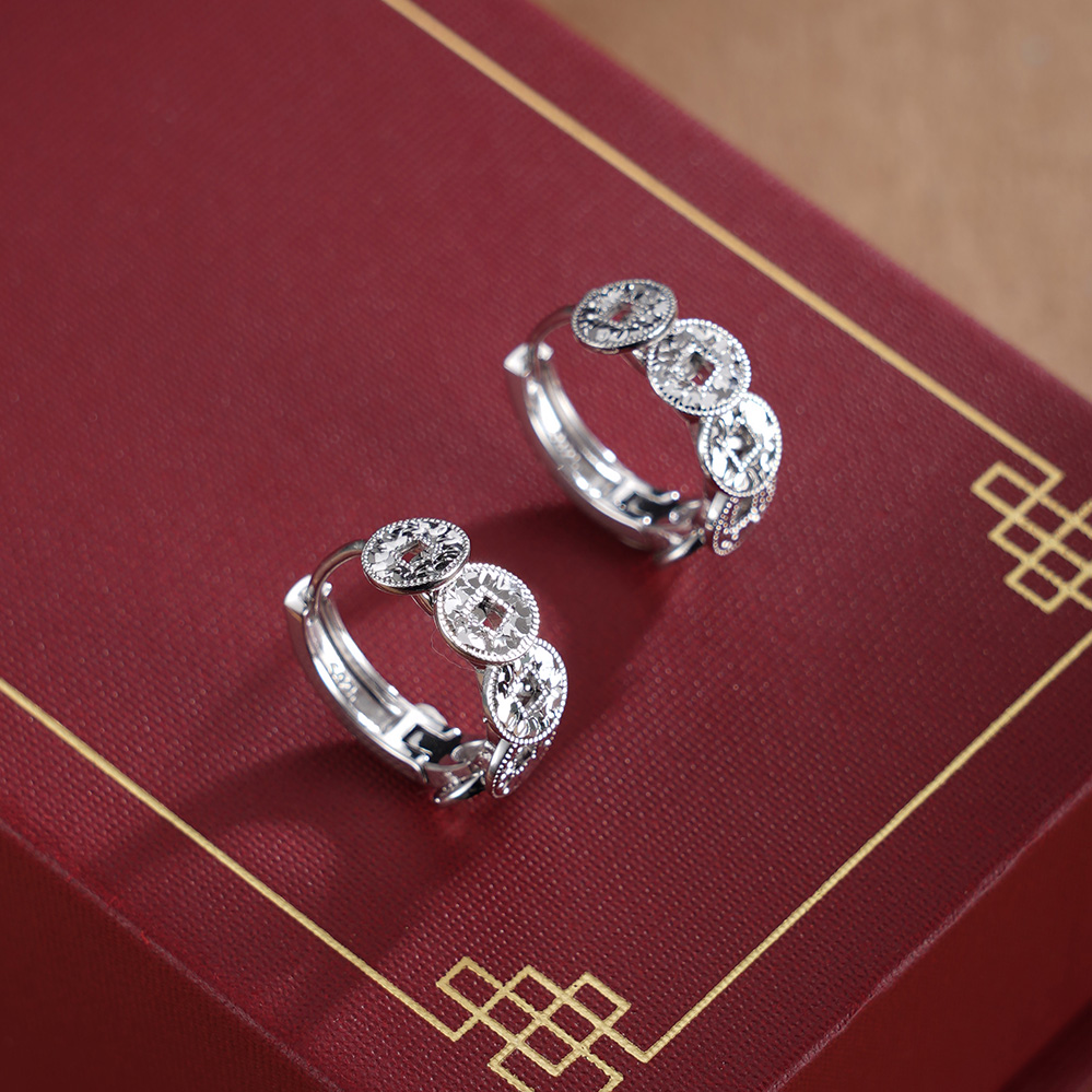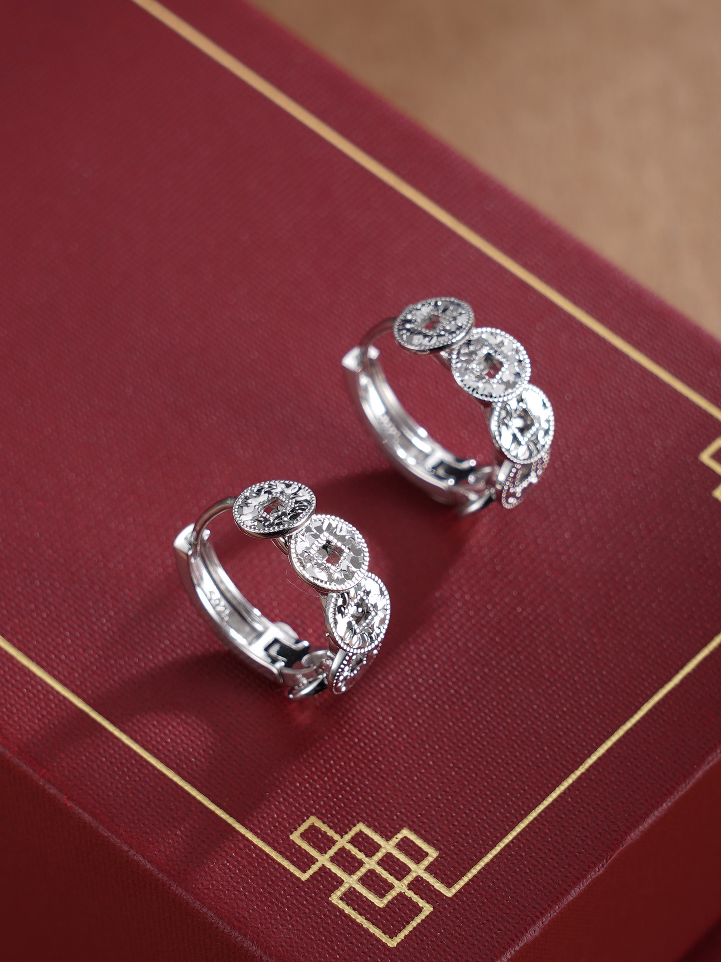 【寓意】:以纯银勾勒五枚铜钱耳扣环环相扣,象征得东西南北中五路财神庇佑,五路通达,财源广进如活水长流,福运相随。