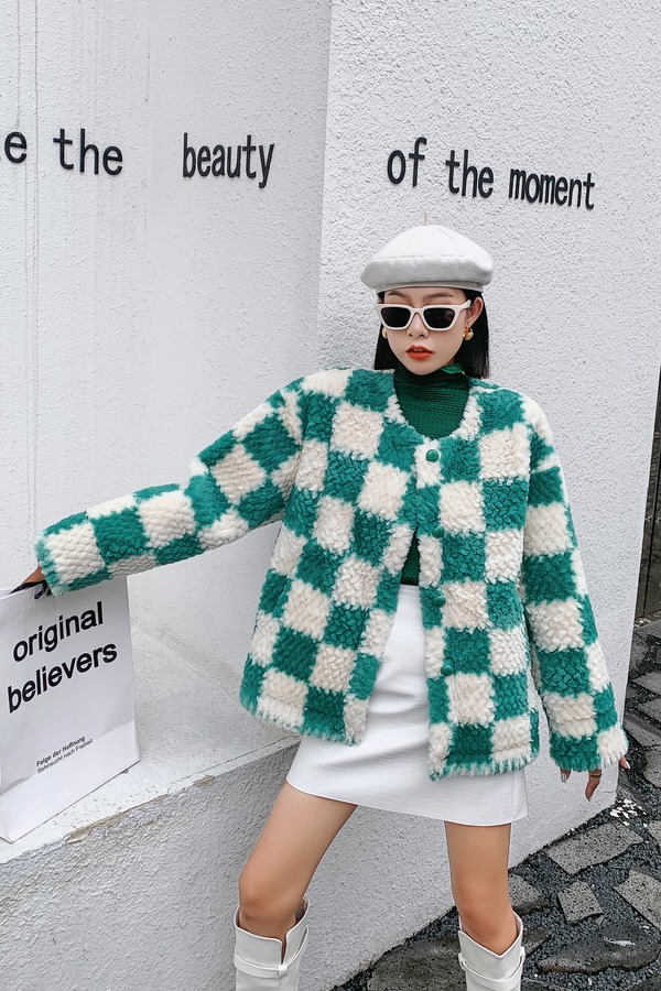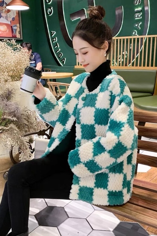 ANSUABEL 棋盘格羊羔绒毛外套 14936