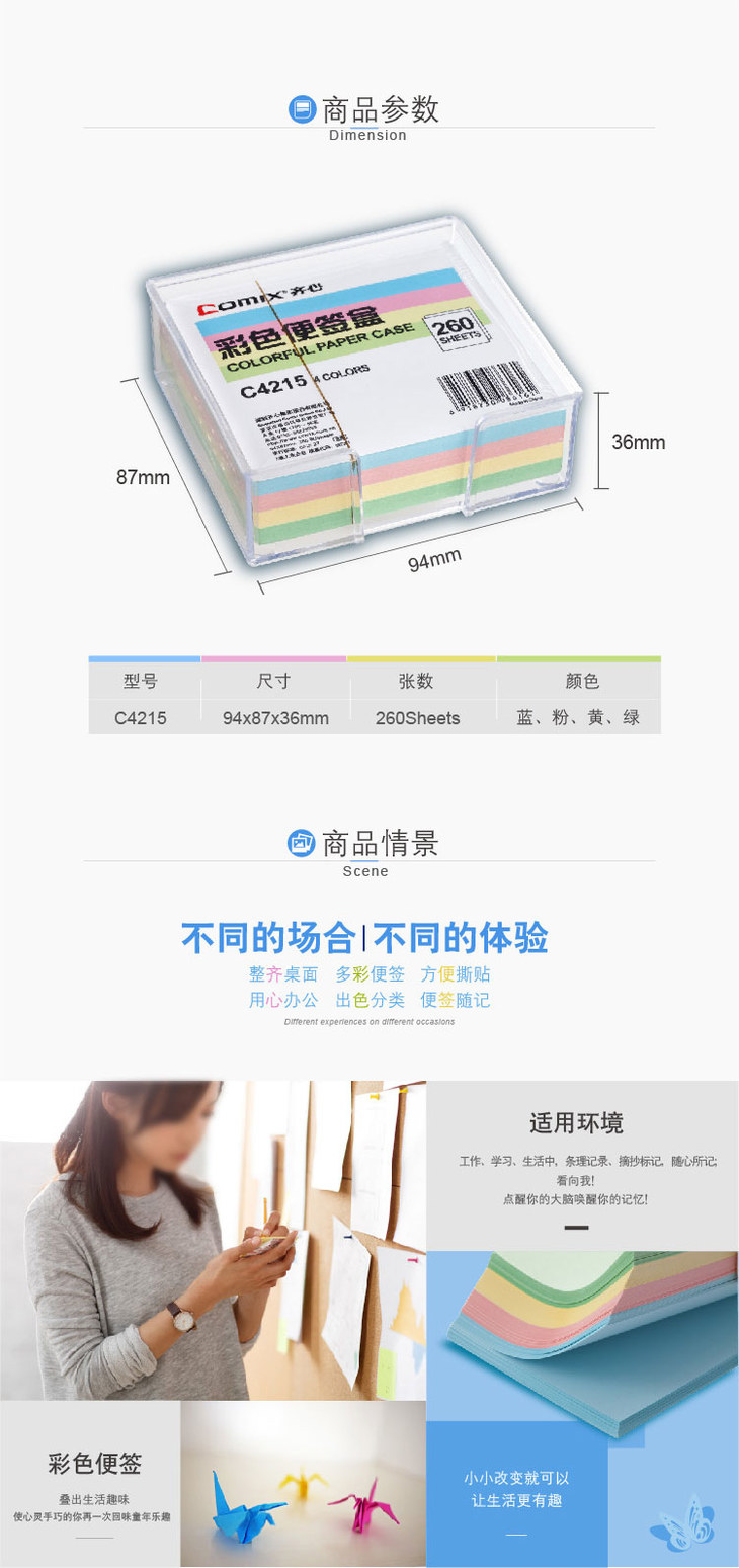 齐心C4215彩色便签盒配纸94*87mm透明