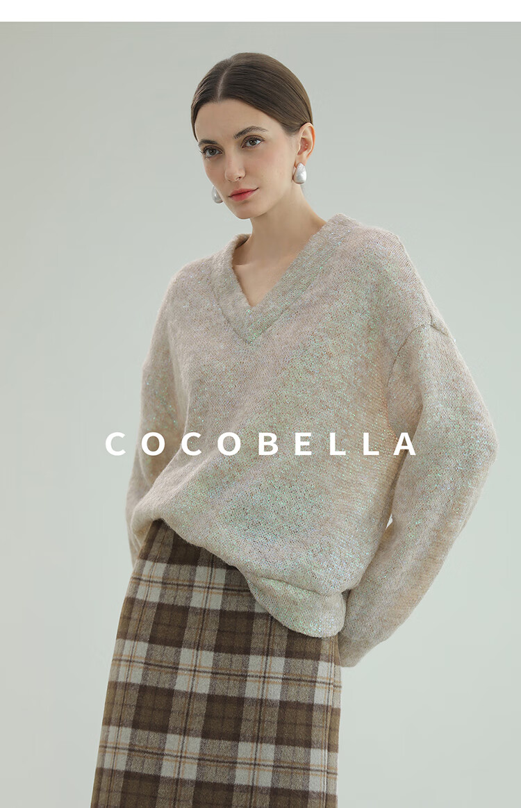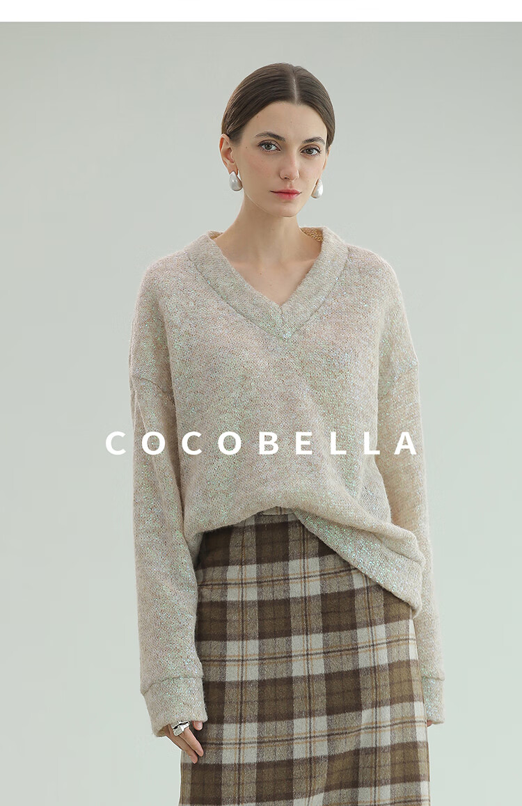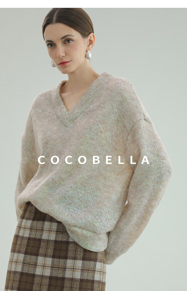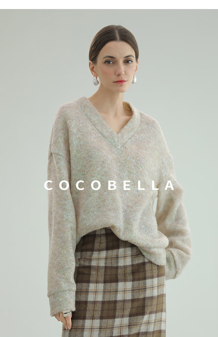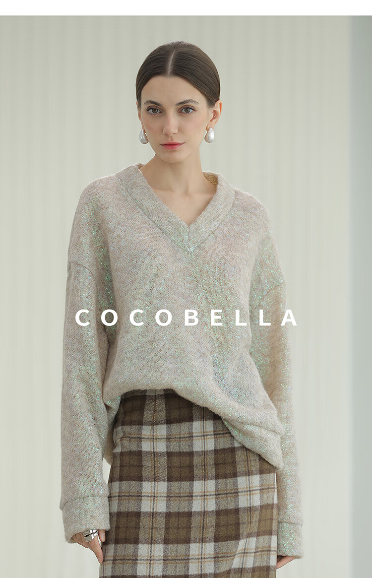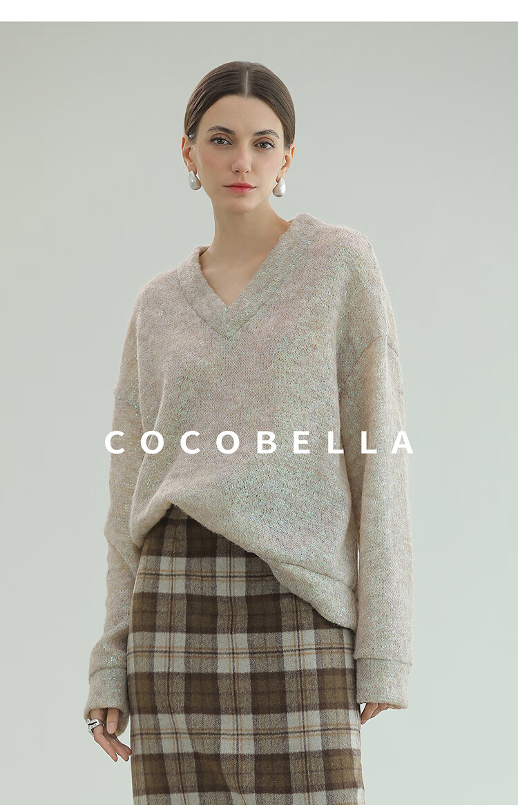 COCOBELLA手工幻彩亮片V领通勤毛衣25秋冬保暖女针织衫MZ3206