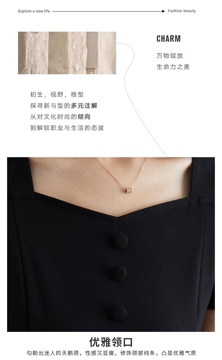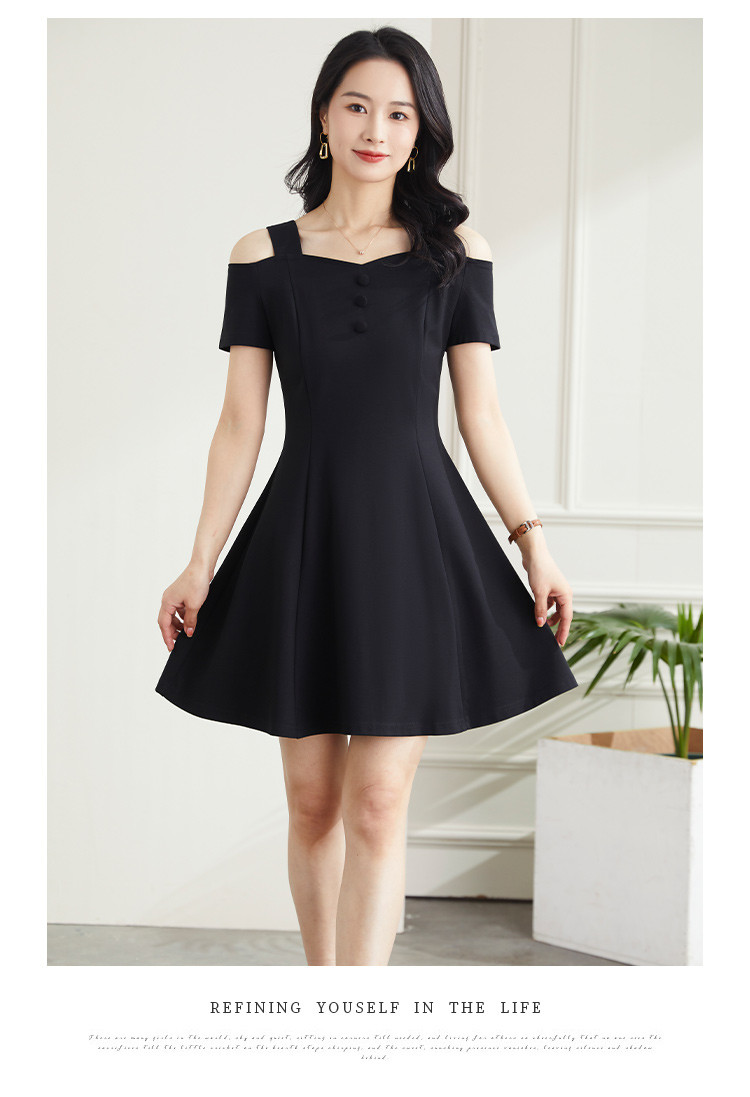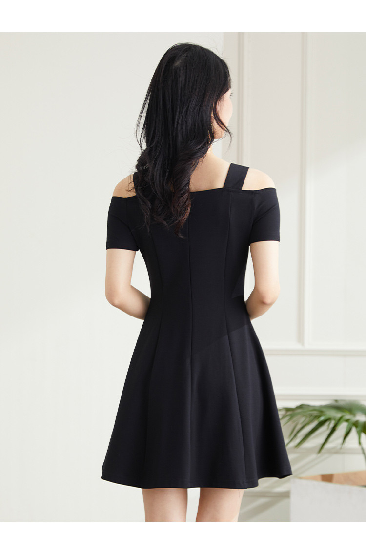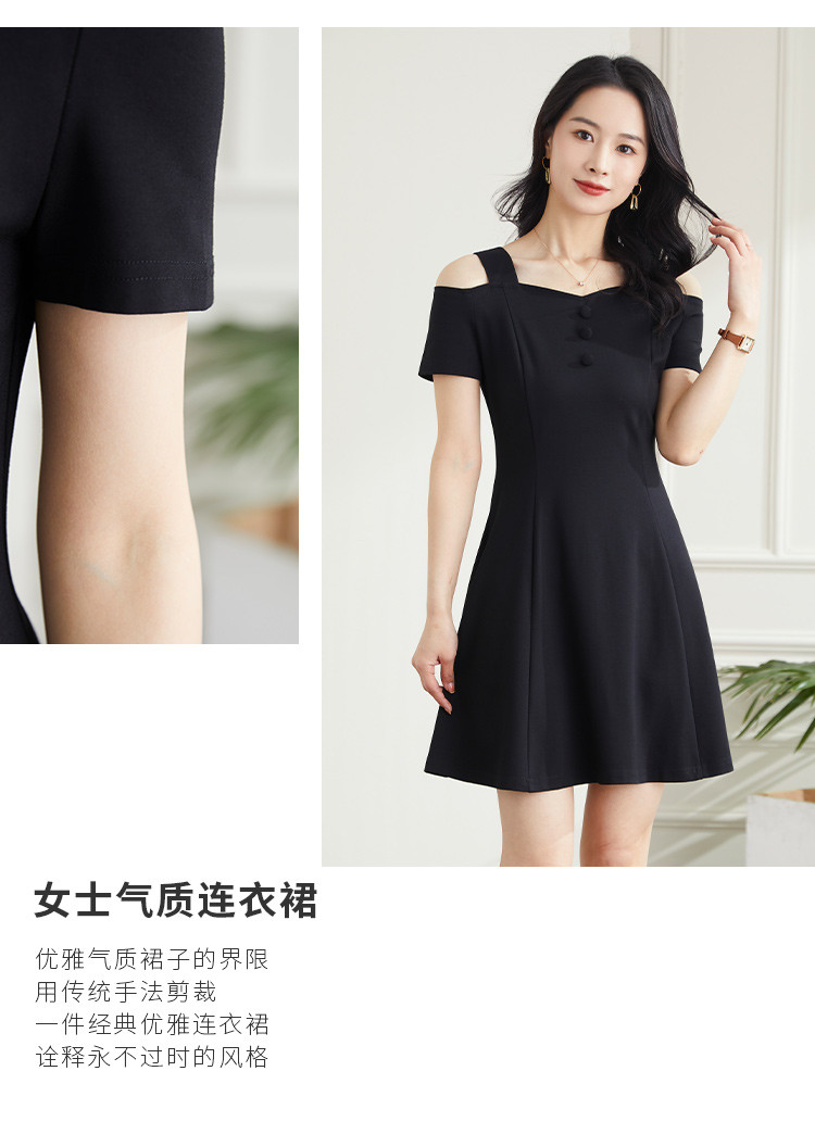 罗蒙夏季短袖连衣裙女士时尚优雅通勤日常百搭短袖露肩小黑裙女