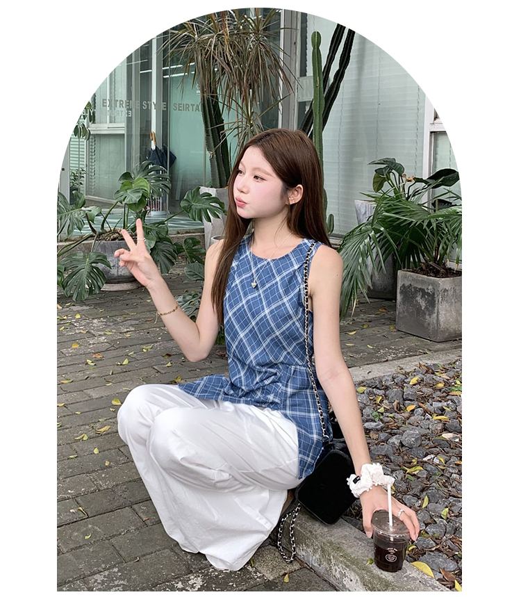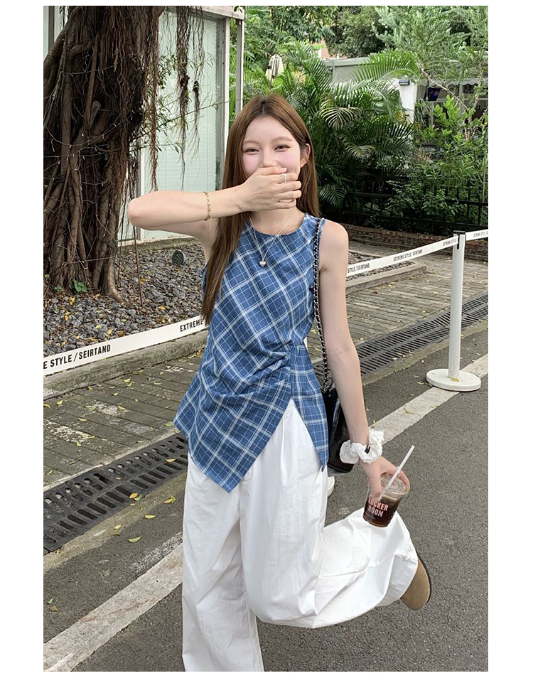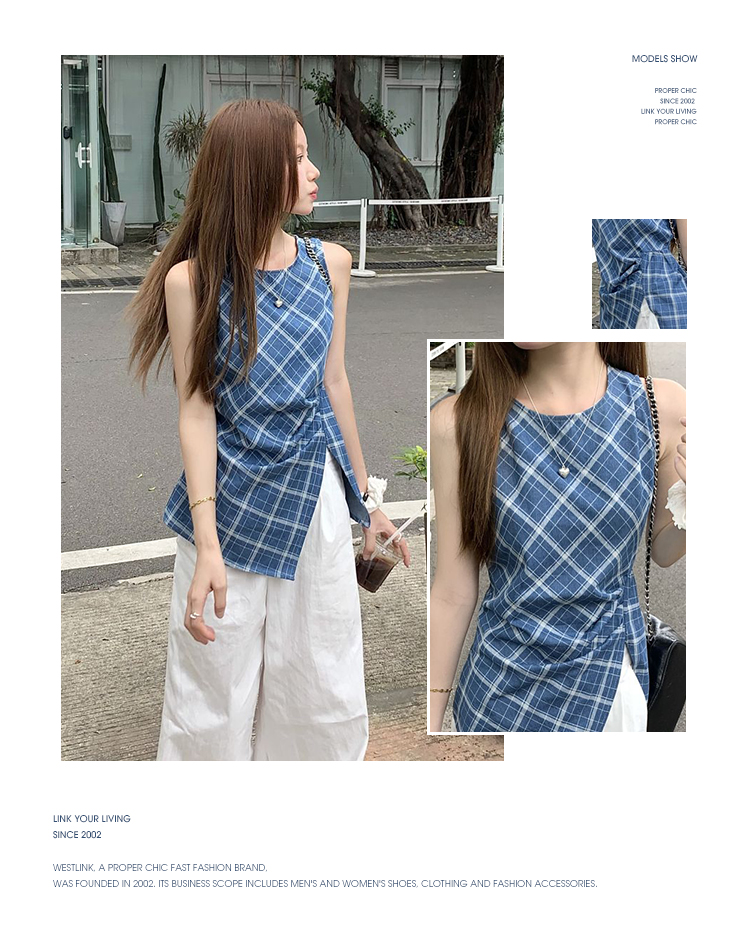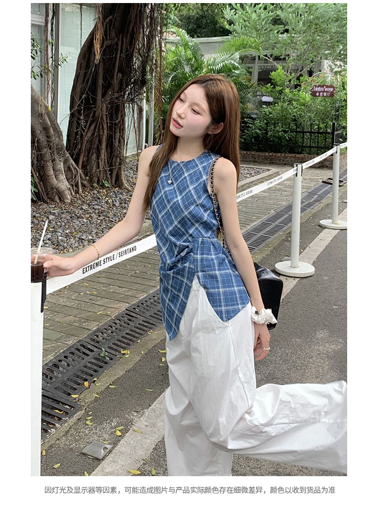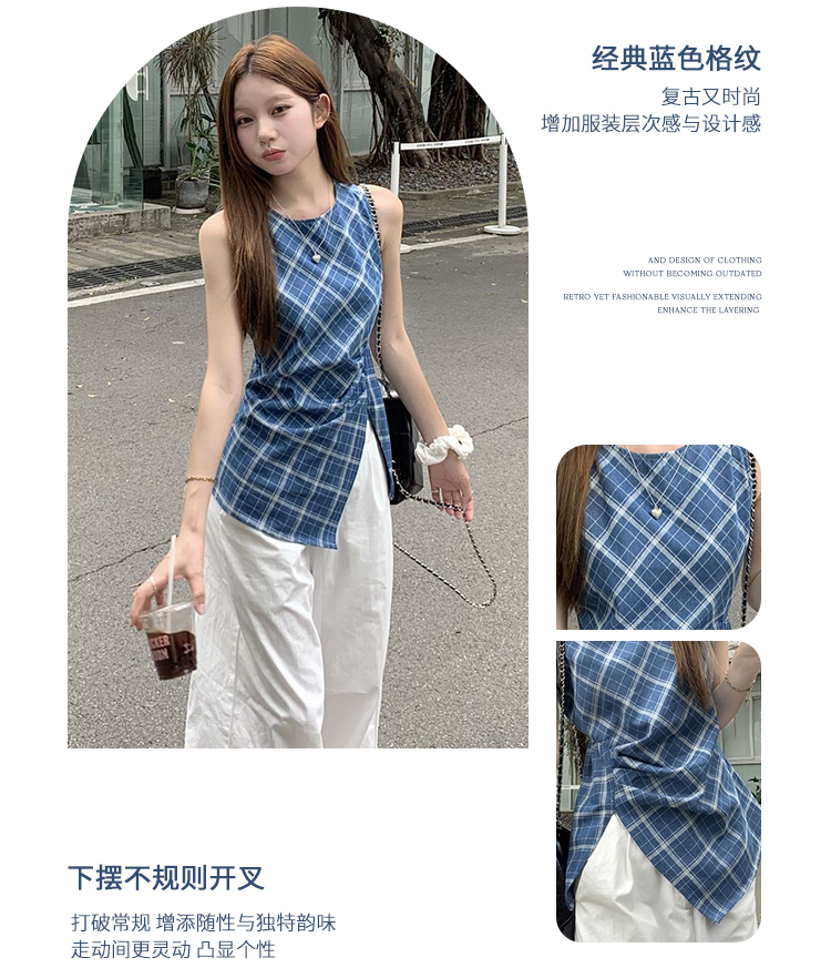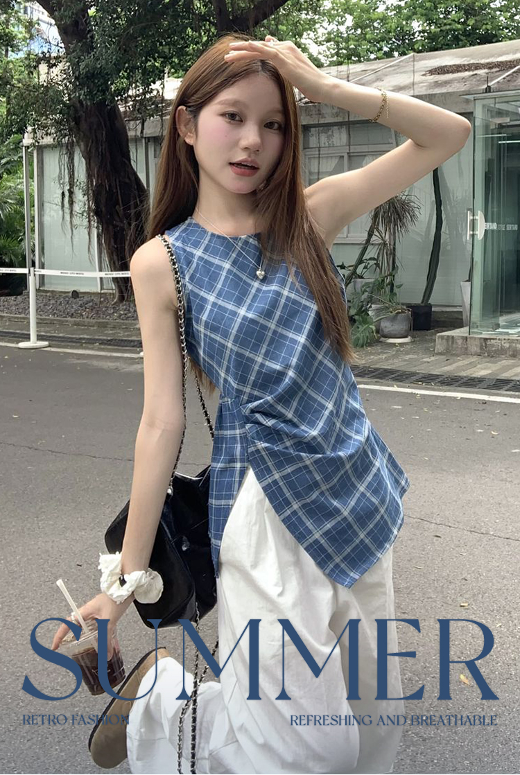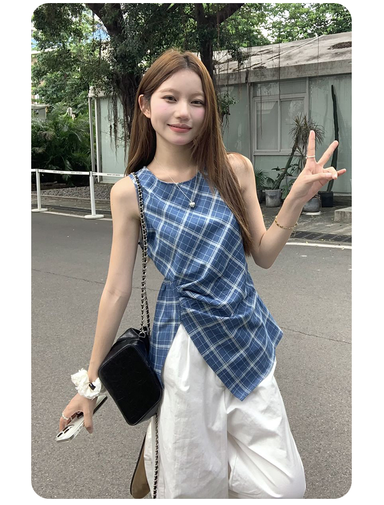 西遇格子无袖上衣女夏季新款不规则下摆设计感蓝色收腰衬衣SS050546