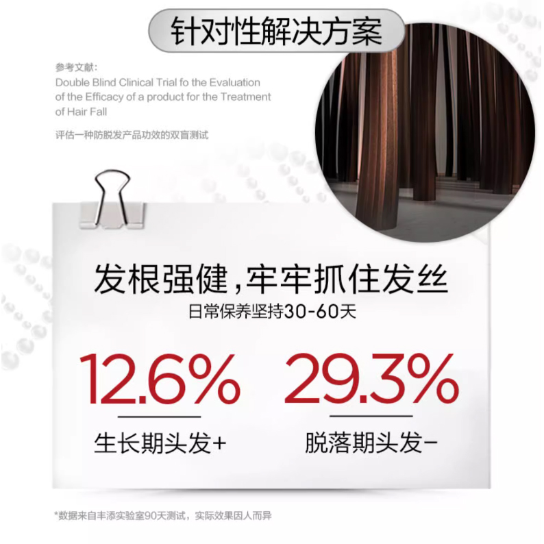 因为对防脱效果很有信心,丰添干脆将实验数据直接印在了产品包装上,可以看到: