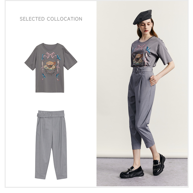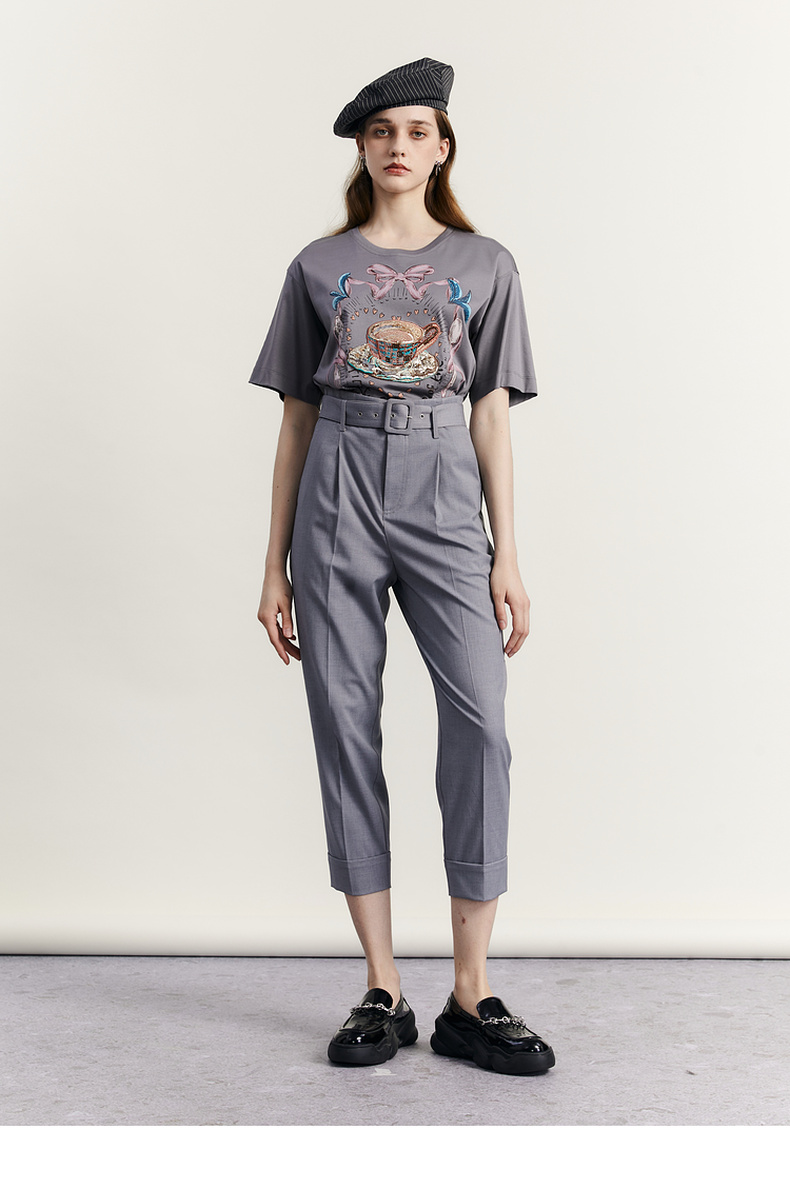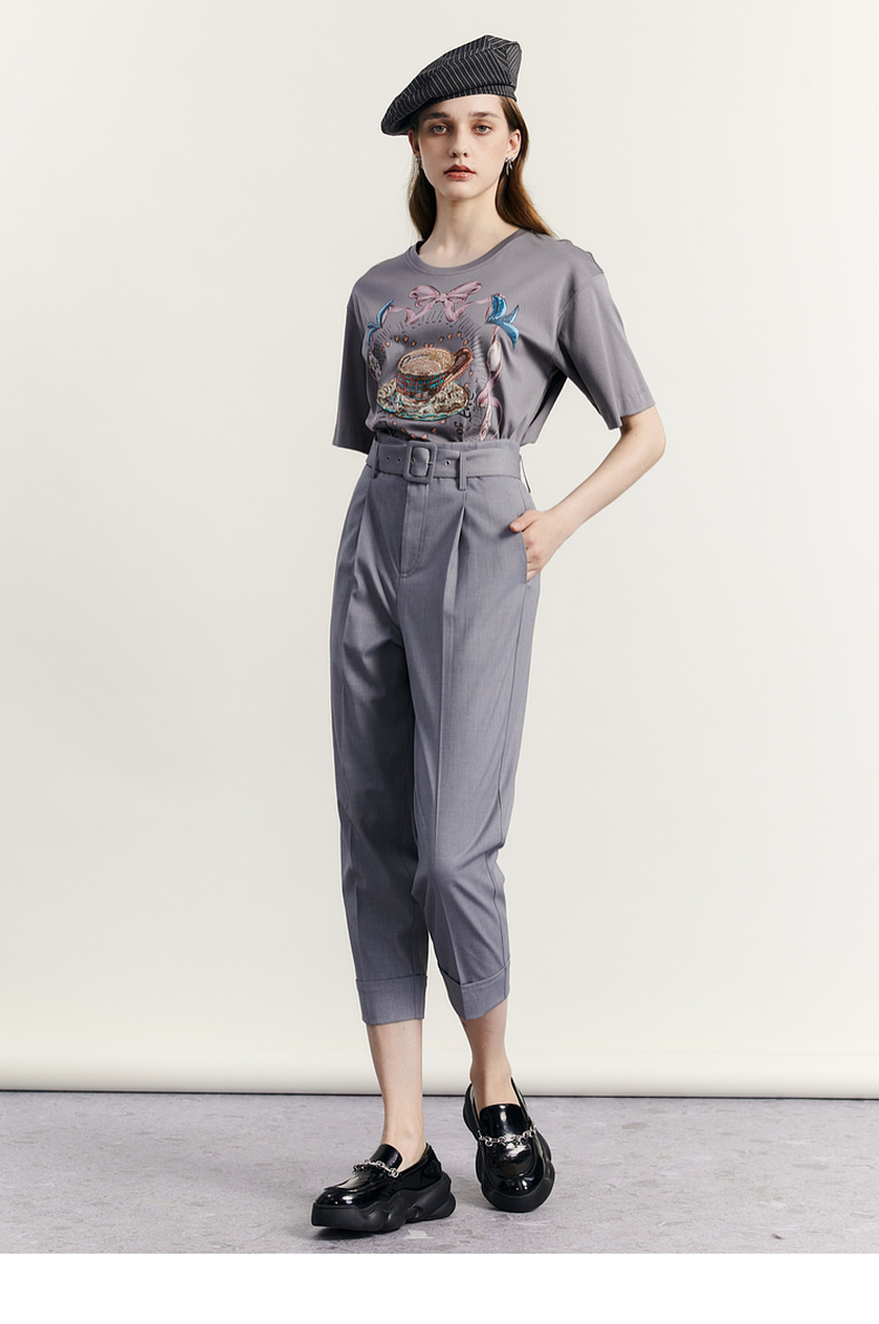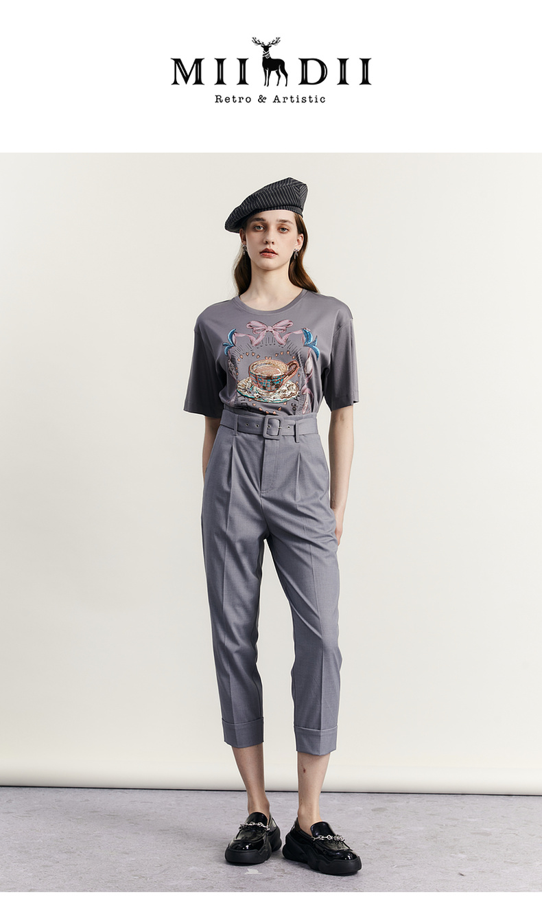 谜底休闲裤女2023秋新款复古高腰宽松萝卜九分裤配腰带233MK1138