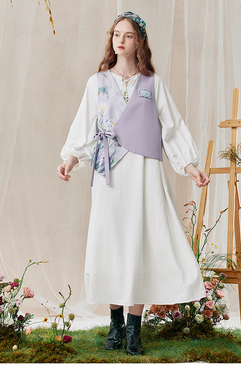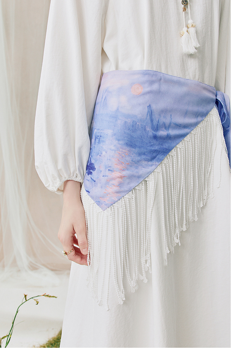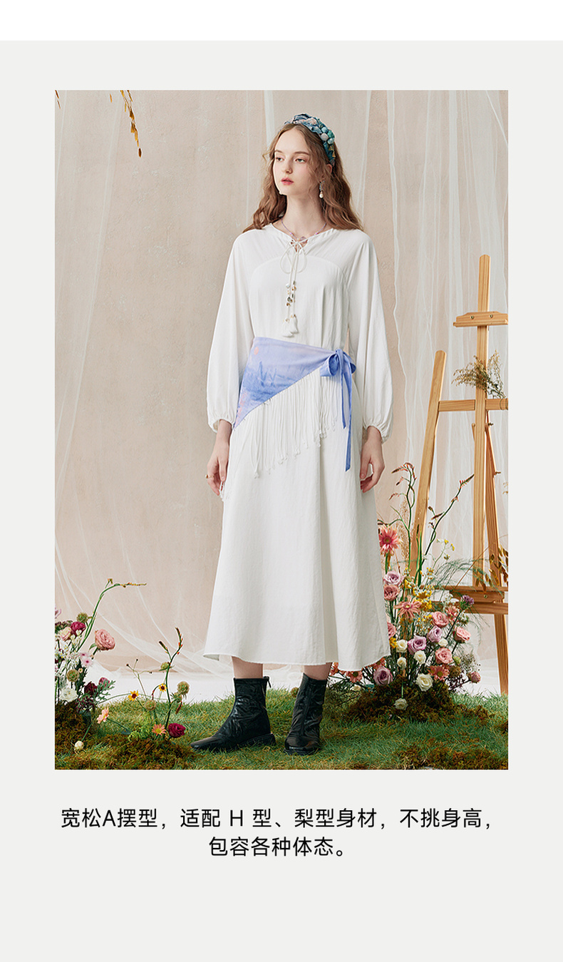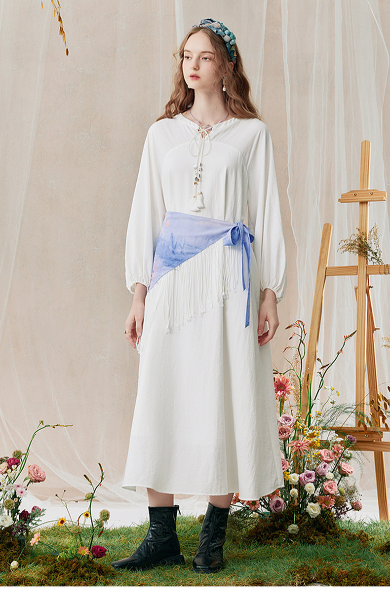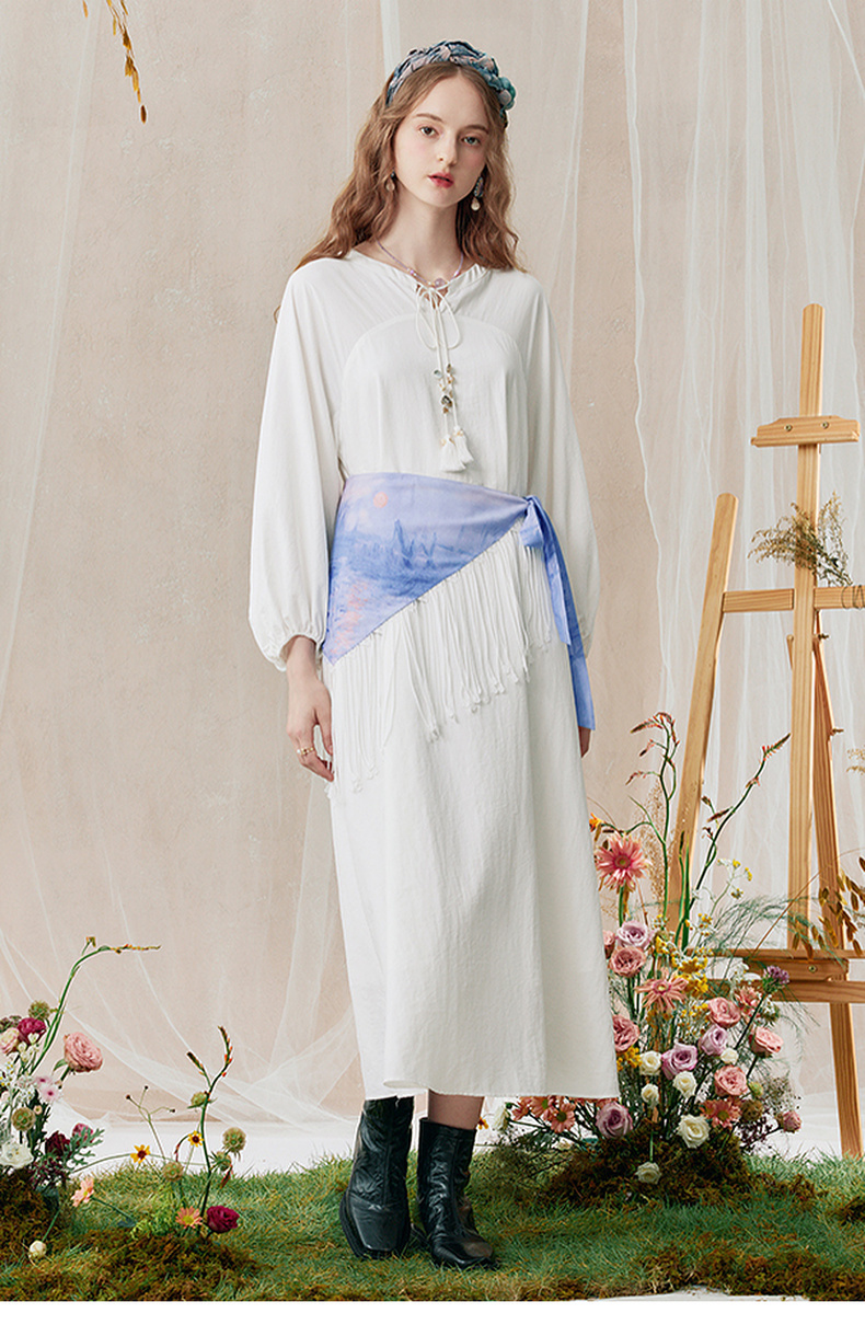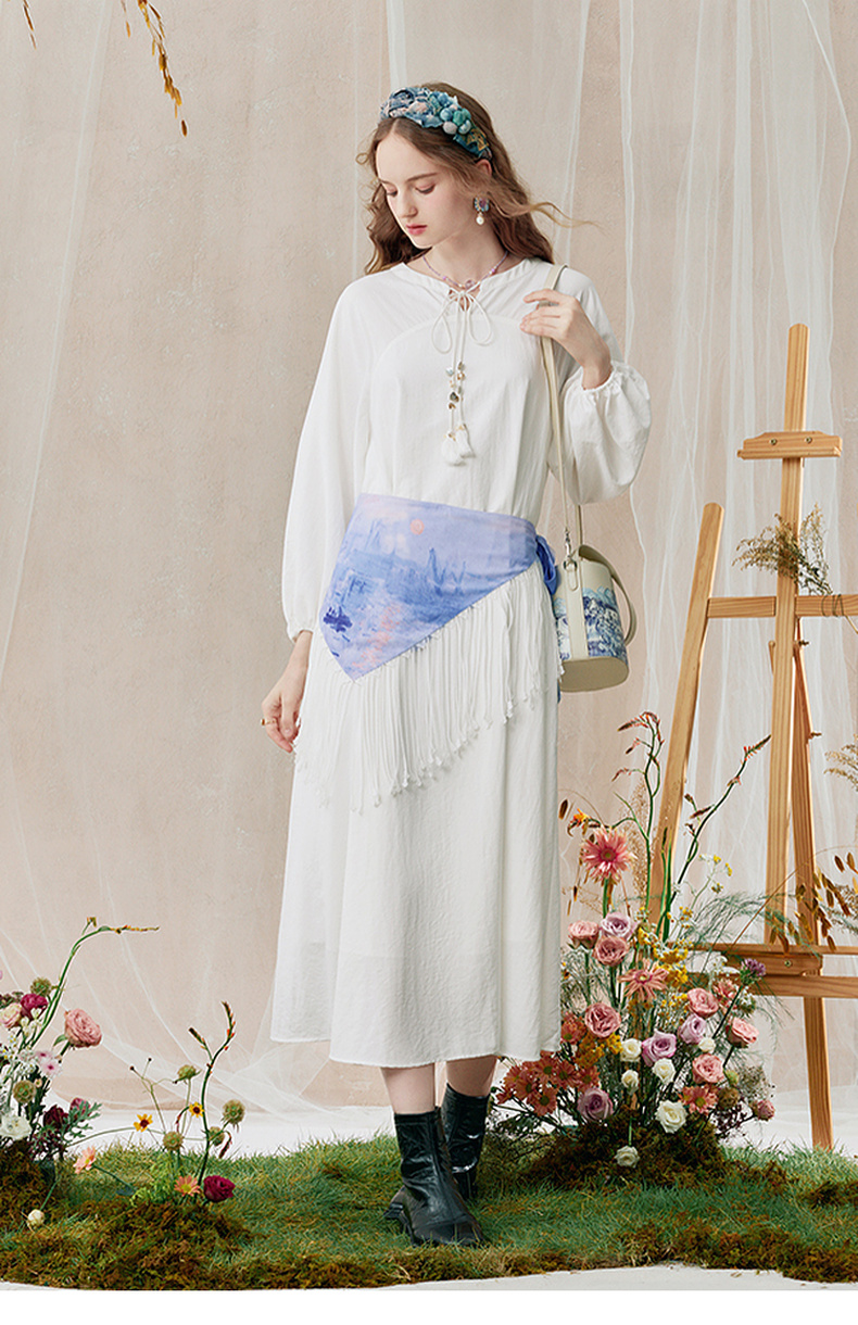 两三事 弦月霞光 2025秋季新款时尚印花流苏腰封灯笼袖连衣裙