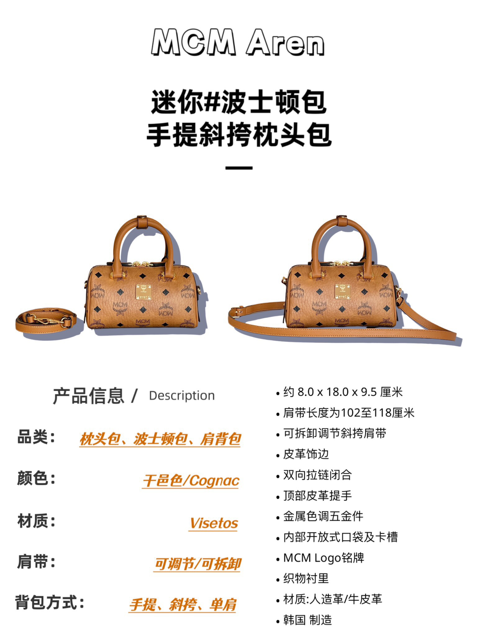 这款mini波士顿包对经典风格进行了全新演绎 采用经典Visetos材料制成,表达了向MCM根植于旅行理念的致敬。其外型让人联想起周末旅行包,采用干净利落的线条设计,并配有方便开启的加长拉链。做工精细,一丝不苟,顶部提手由手工进行缠绕、针缝和边缘上漆。