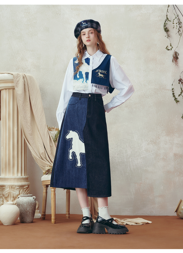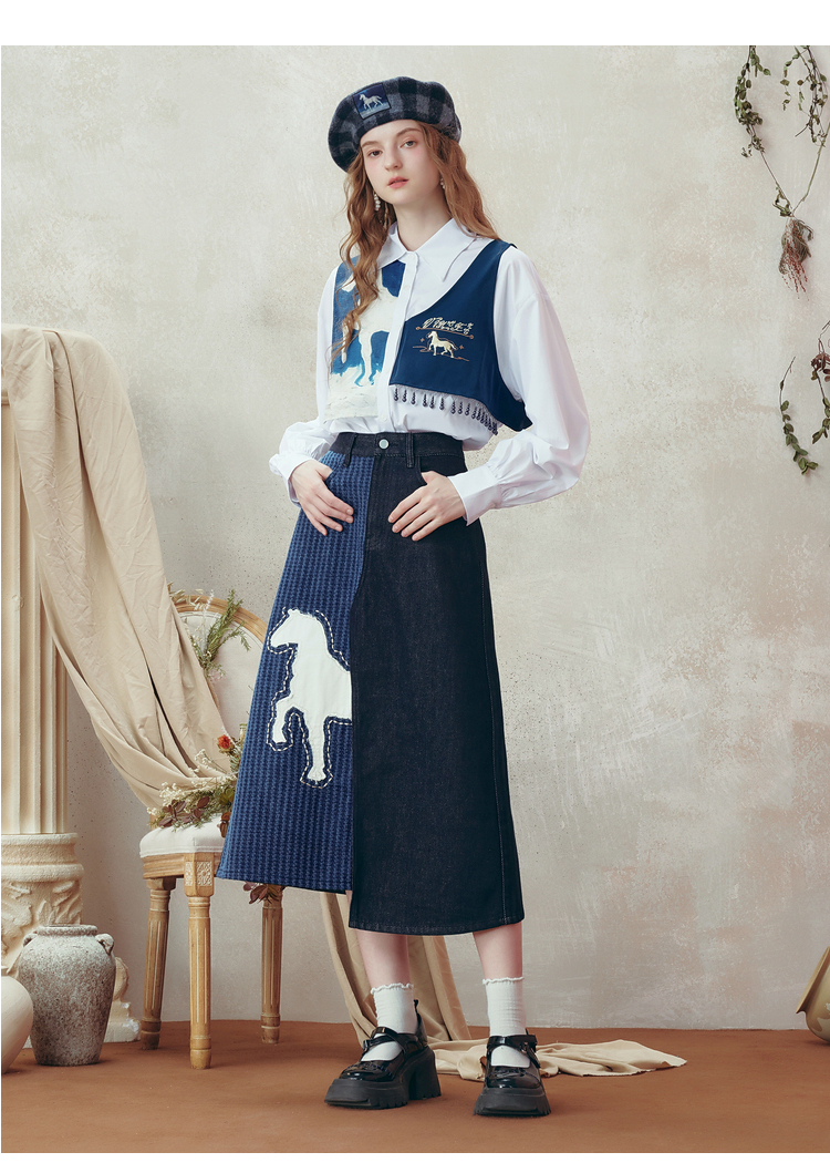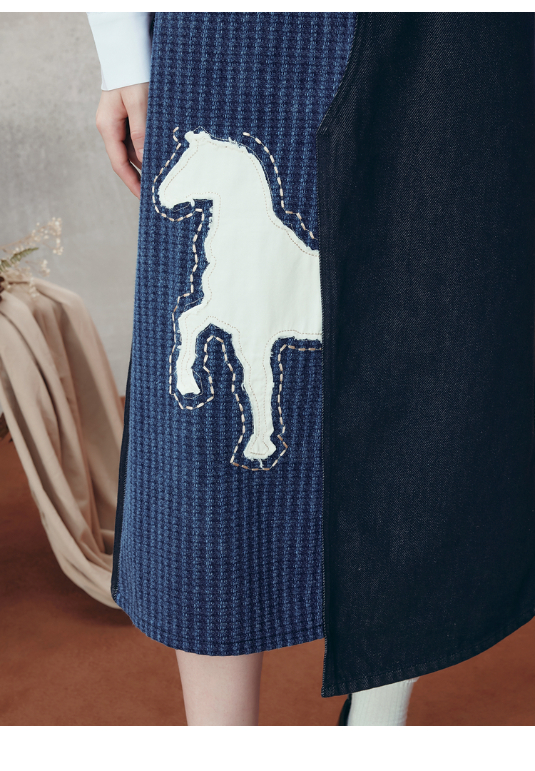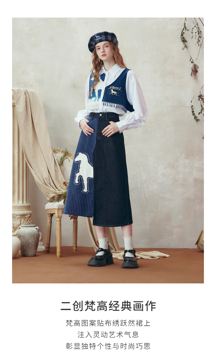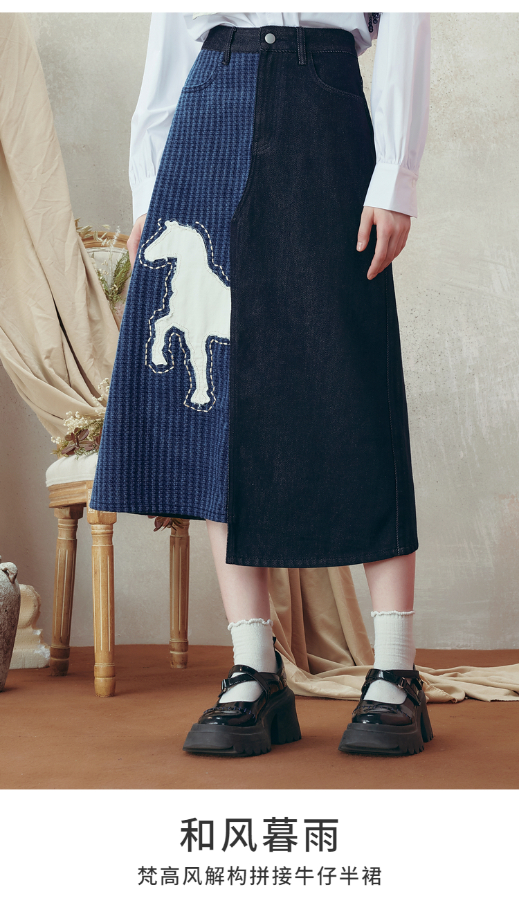 两三事梵高文艺 和风暮雨 2025冬季新款动物贴布绣拼布牛仔半身裙