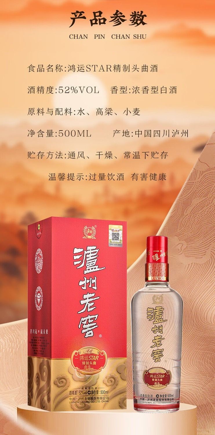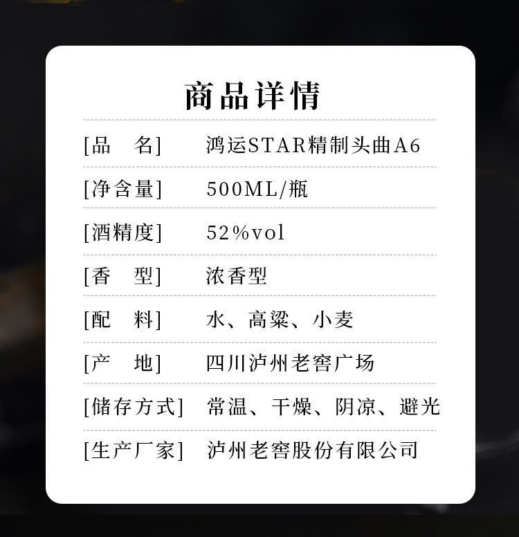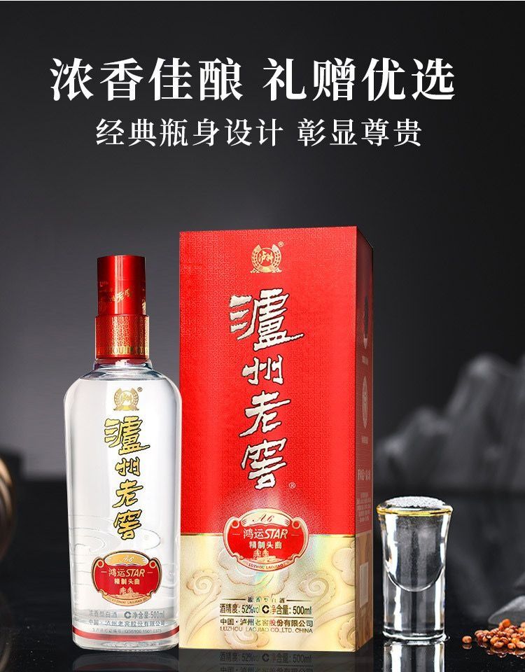 泸州老窖鸿运STAR精制头曲A6 52度浓香型白酒 整箱500ml*6瓶包邮