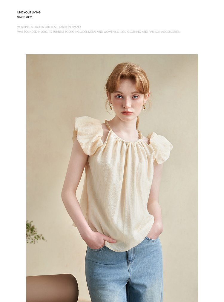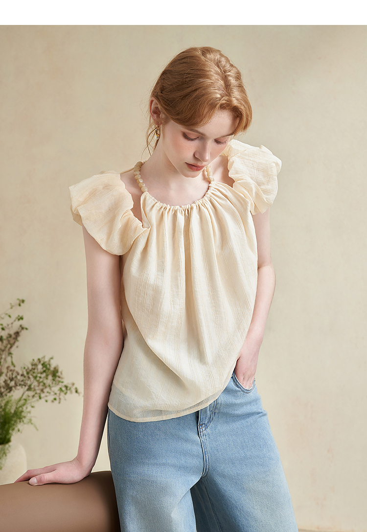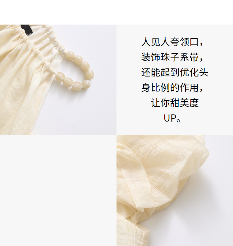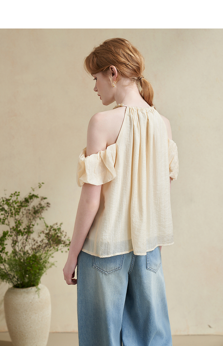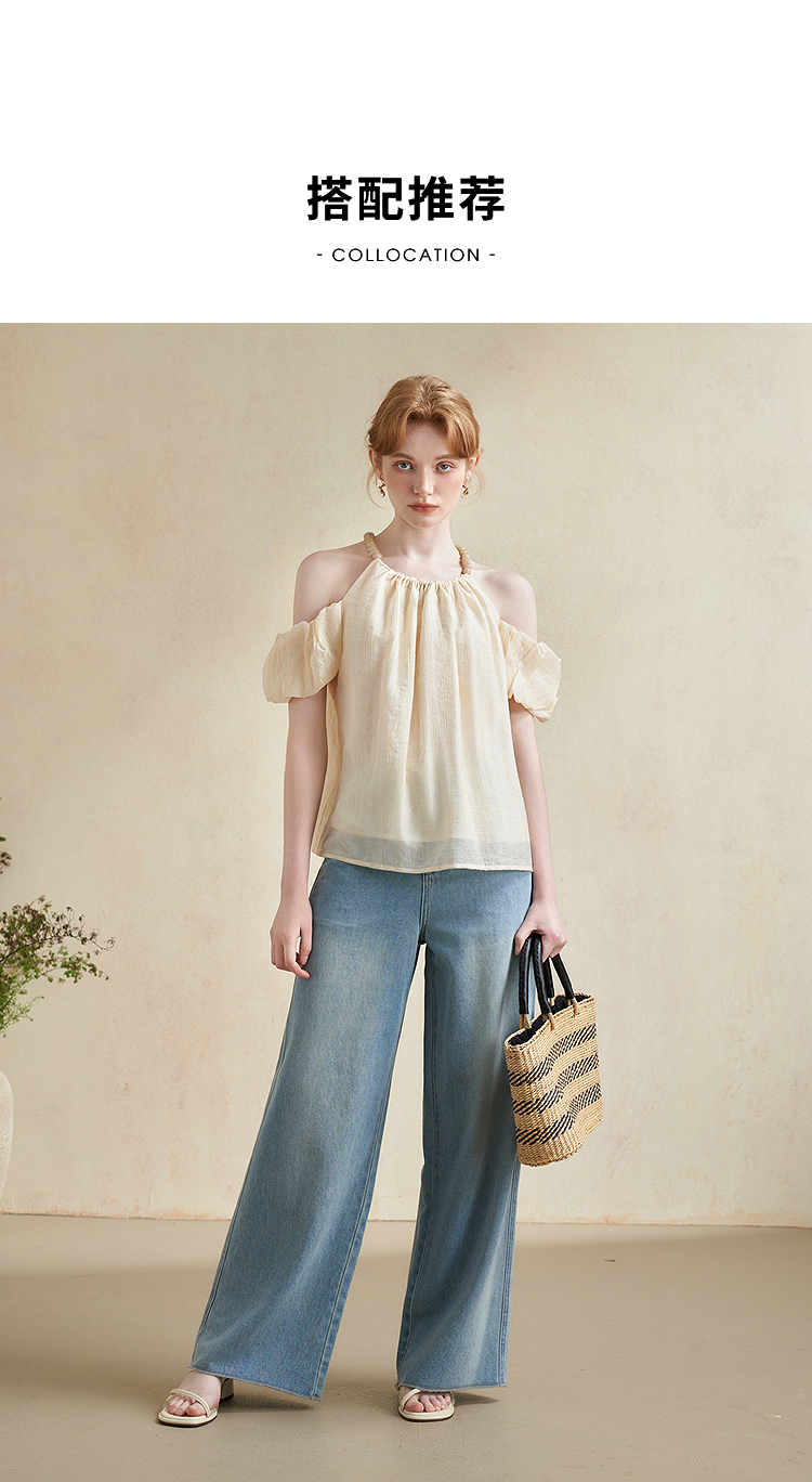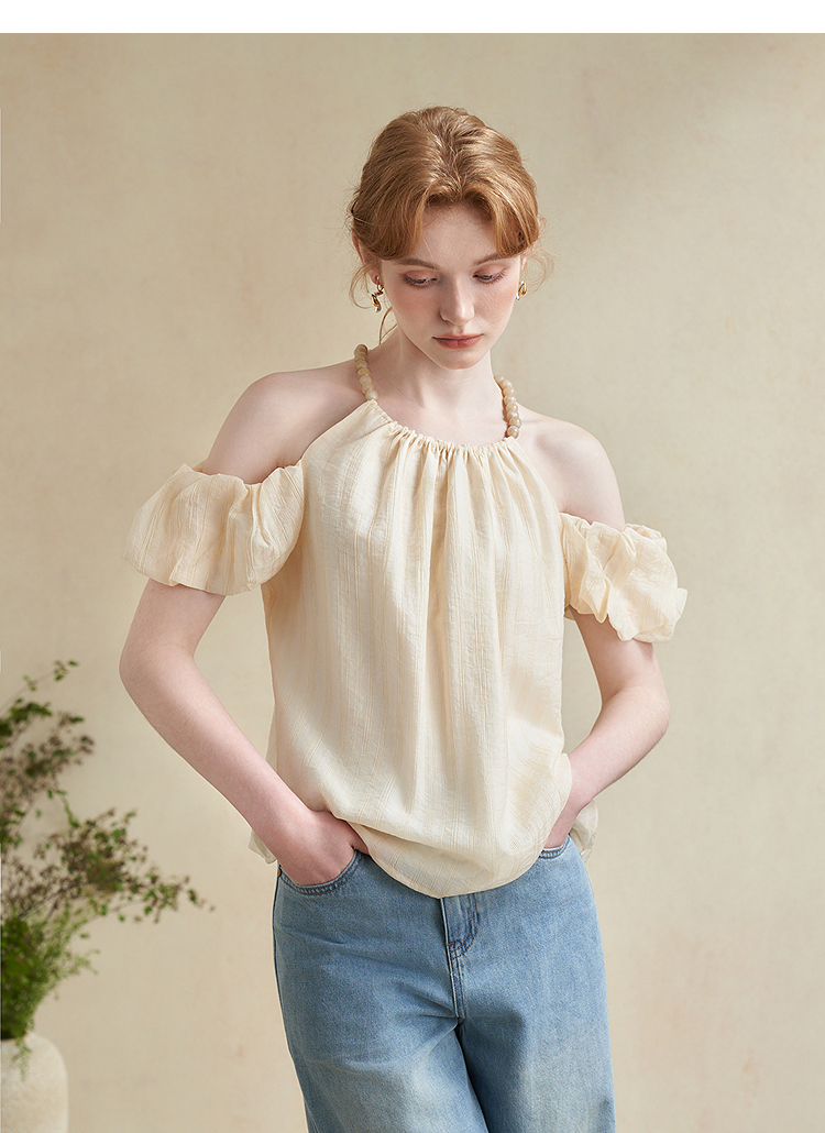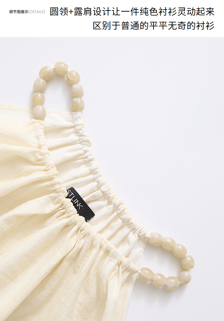 【凉爽天丝】法式复古串珠一字肩挂脖衬衣女夏季宽松衬衫LXD50892