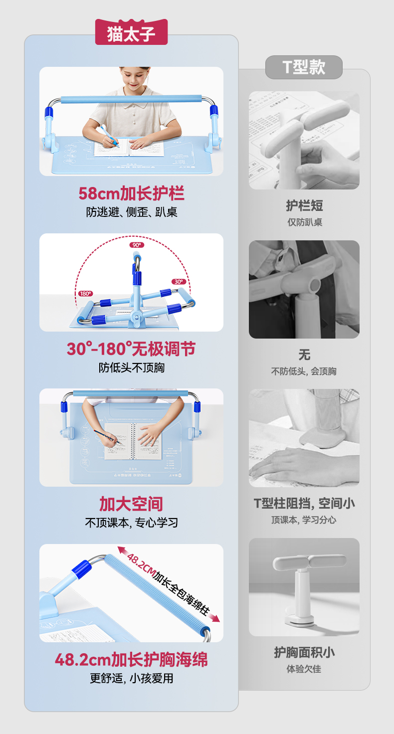 猫太子护栏桌面坐姿矫正器加长杆防近视写字架小学生写作业写字防低头防驼背神器儿童视力纠正姿势支架书桌款