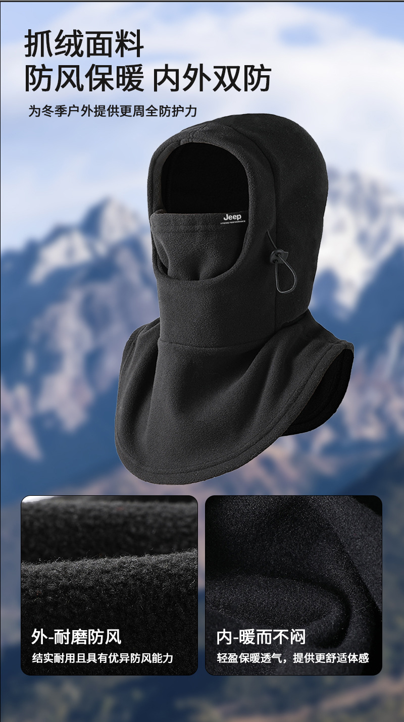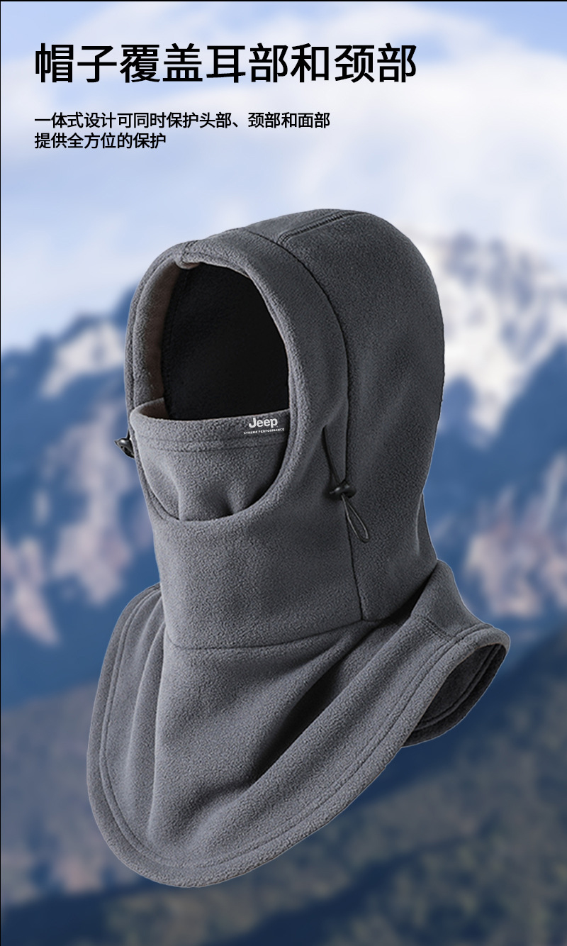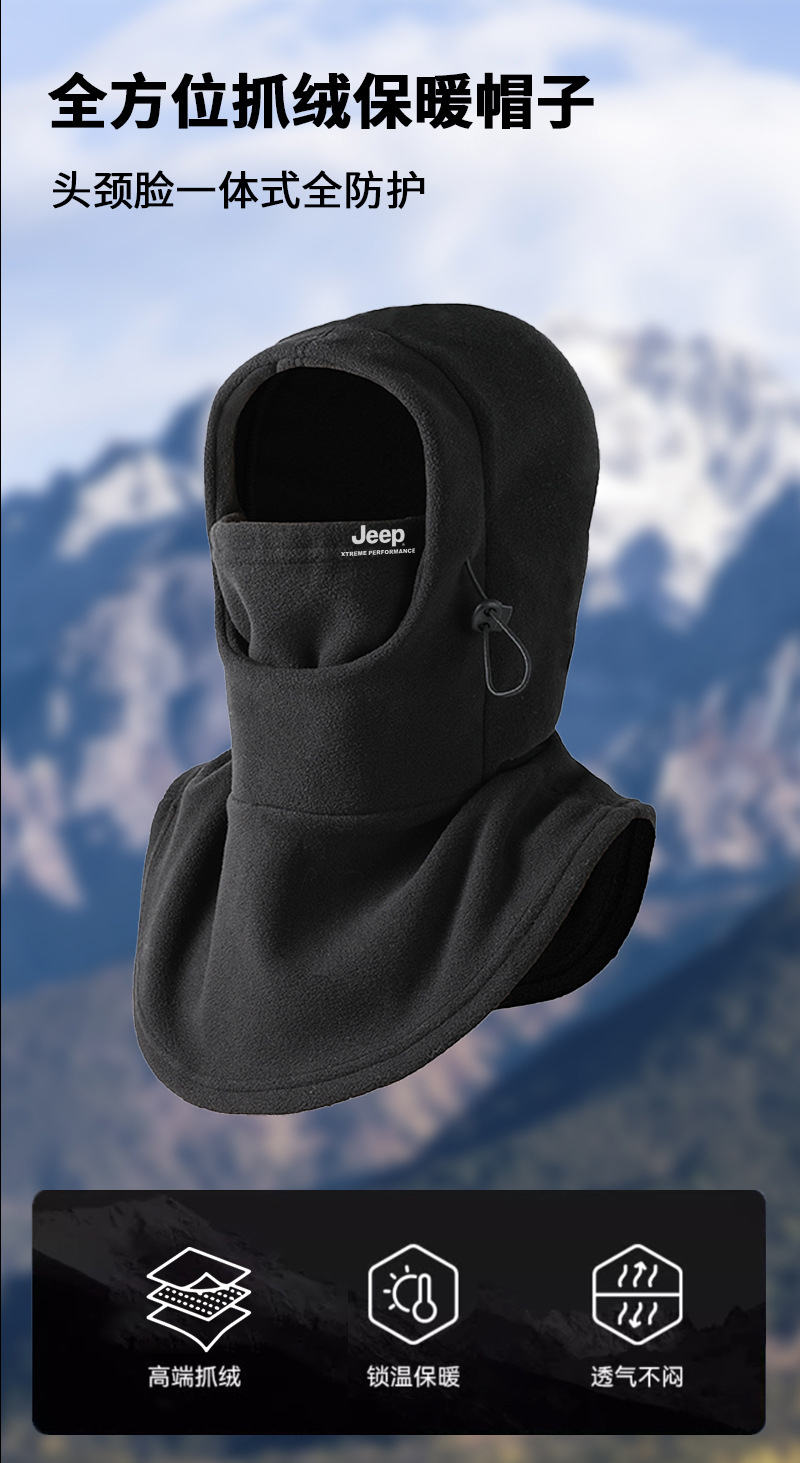 JEEP户外秋冬加厚全方位抓绒保暖登山徒步帽子高强防风抗寒耐磨透气包头帽