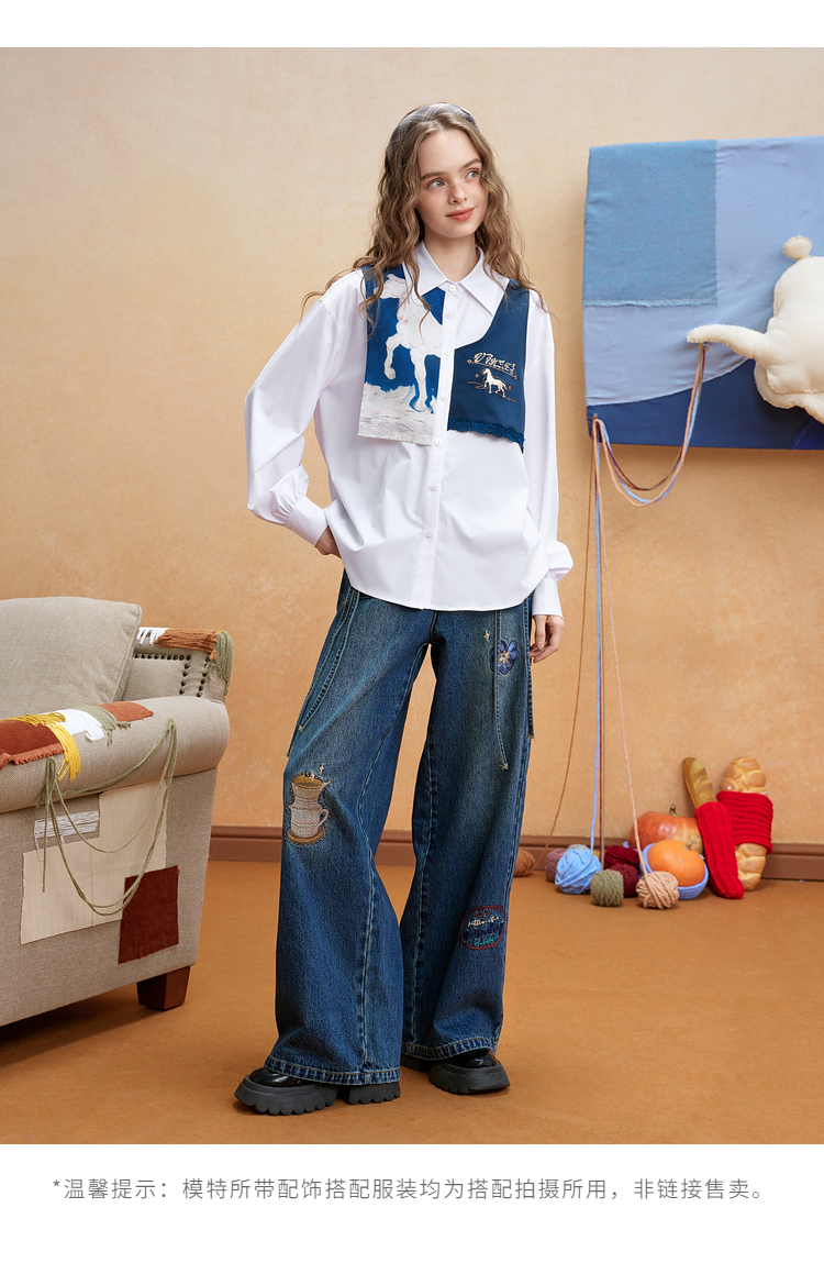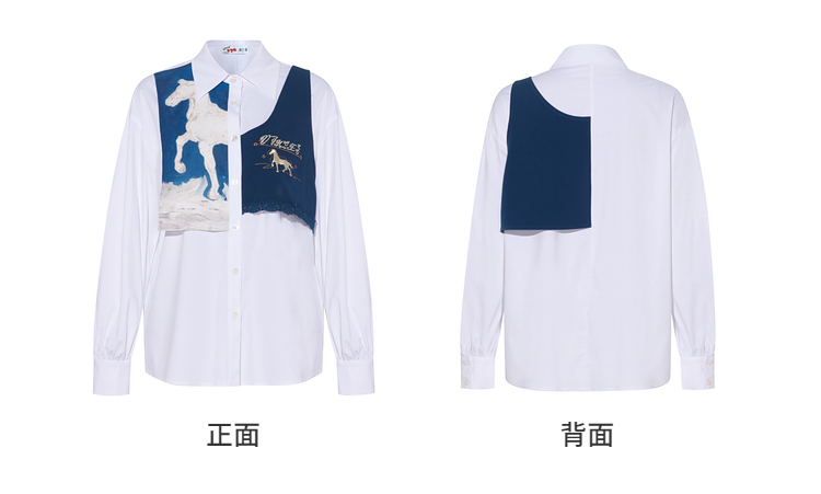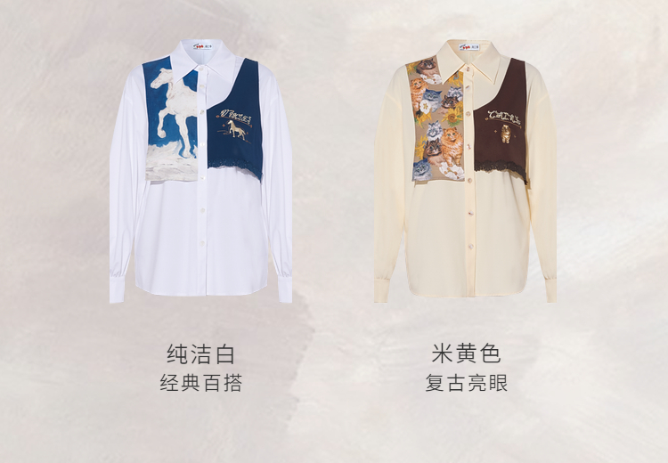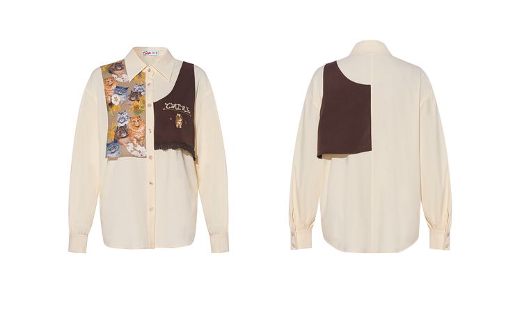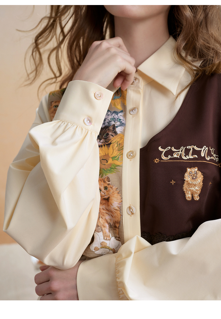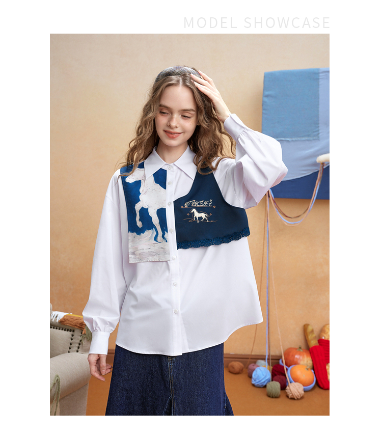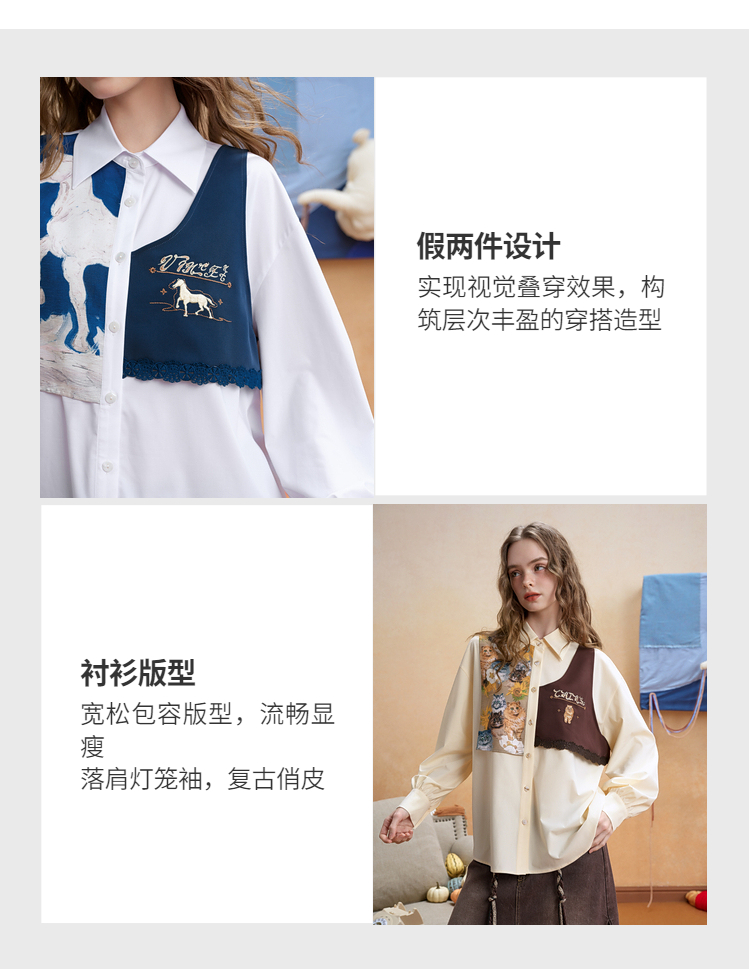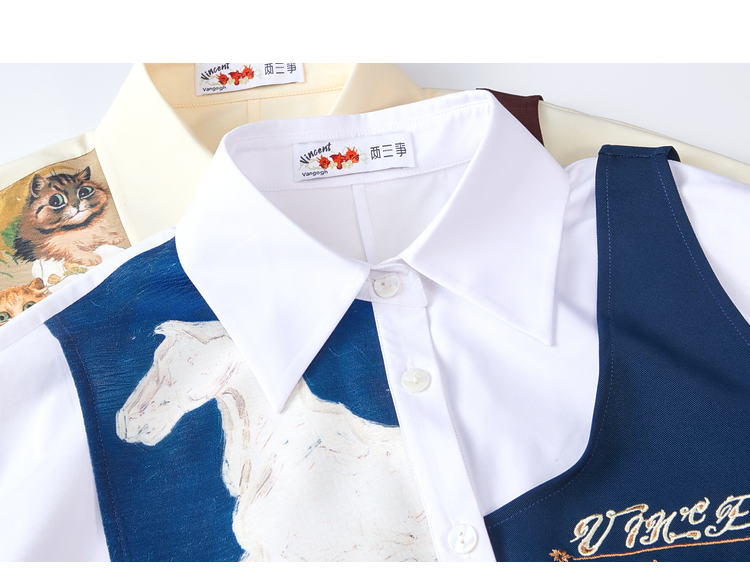 两三事梵高艺术 狩猎禁区 秋季新款印花布拼接假两件长袖衬衫