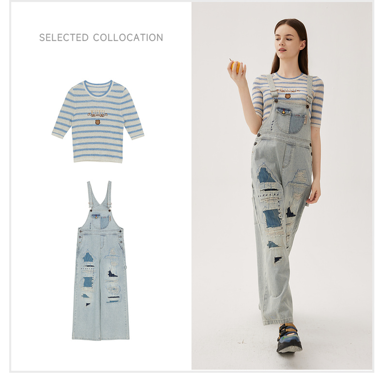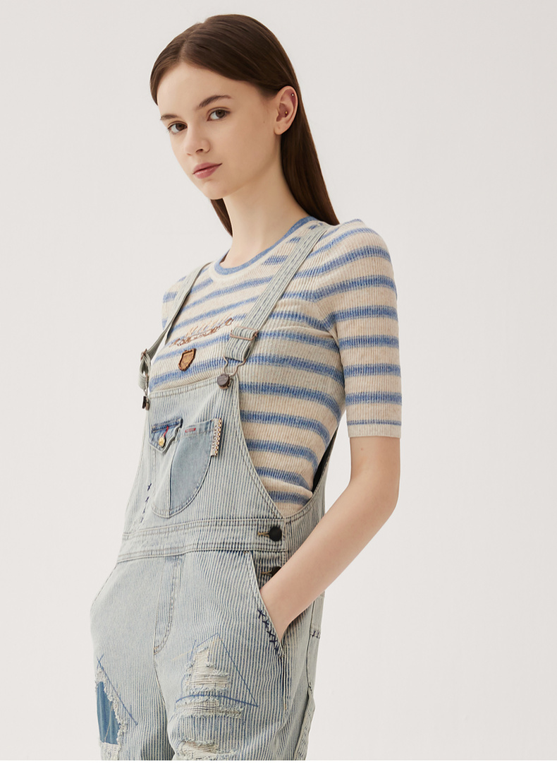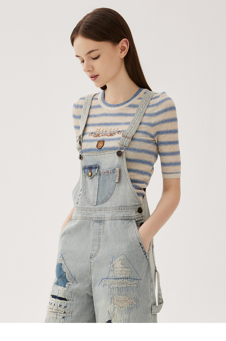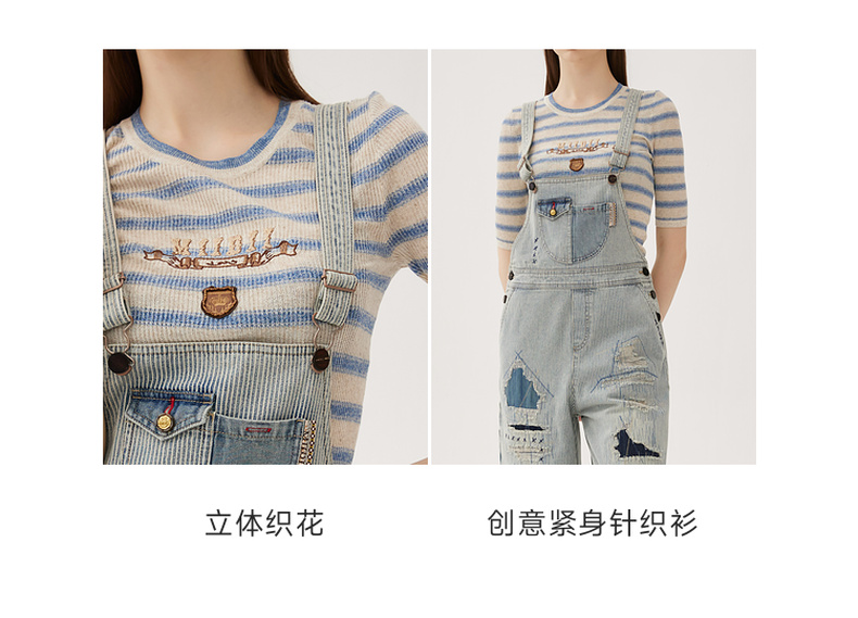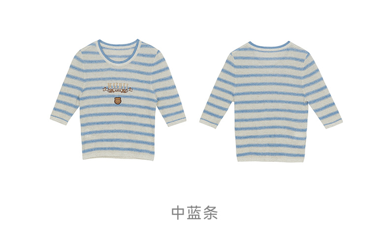 谜底套头针织衫短袖女2024秋款学院风条纹圆领短款上衣243MZ1263