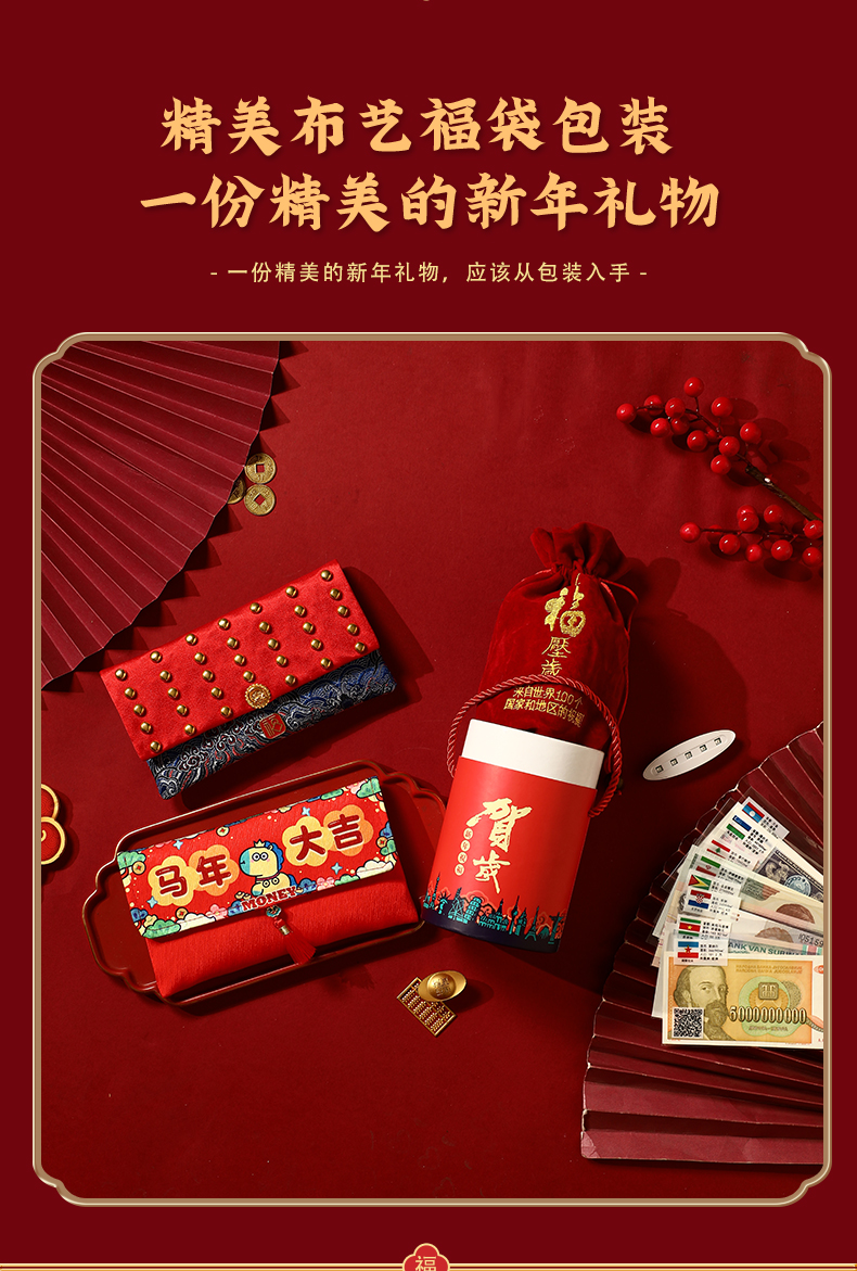 【2026年马年大吉创意国外纪念币红包】 扫码看世界 50国100张 100国100张 宫墙包 马年大吉包 买纸币红包就赠:1张面值纸币+马年金属彩钞+防伪灯