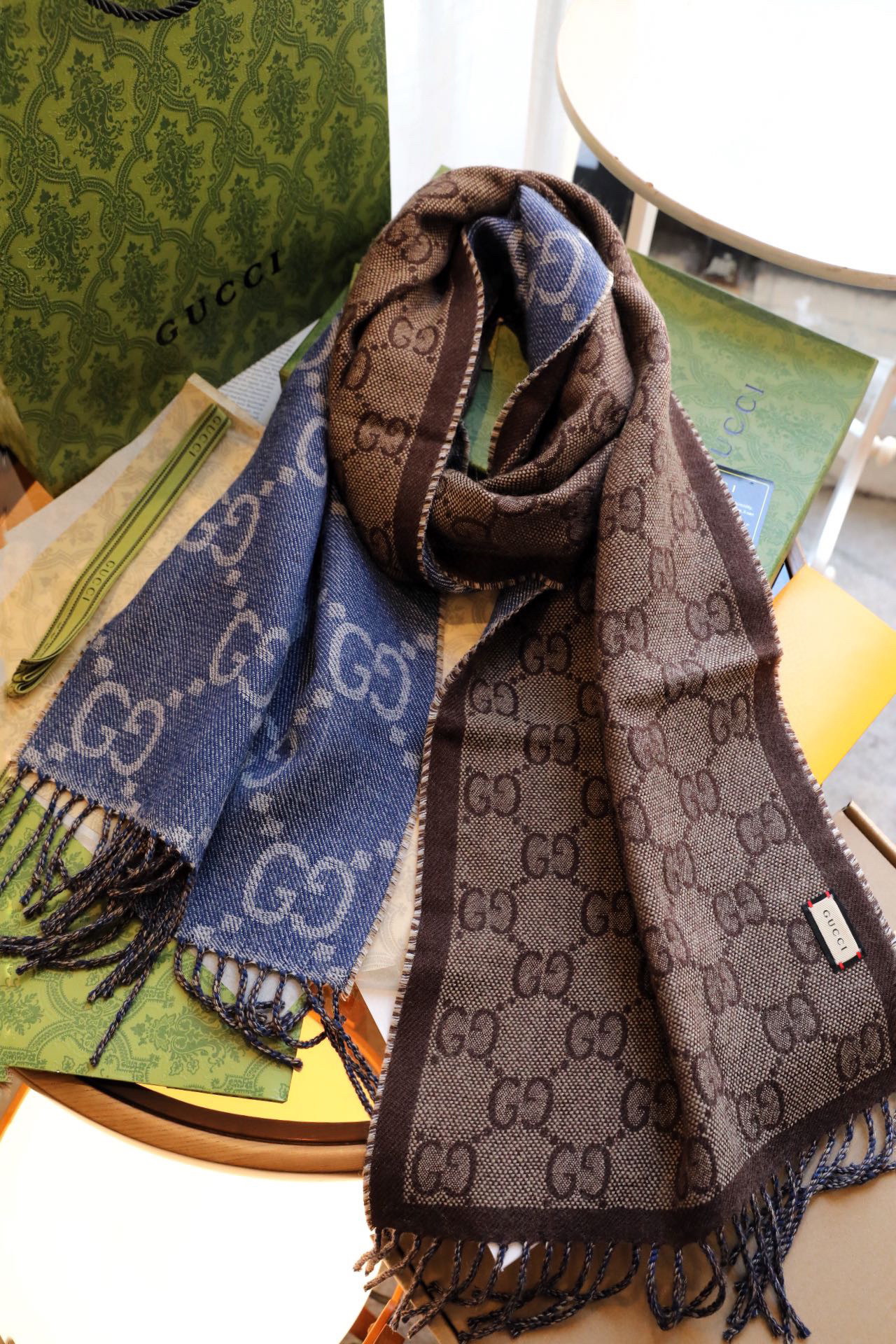 含礼盒包邮,这款柔软的提花羊毛围巾正反两面都饰有GG图案,灵动而又不失俏皮。双G字母交织图案源自20世纪70年代,由品牌创始人Guccio Gucci的姓名首字母演化而来。围巾采用蓝色与浅棕色对比色调,典雅的海军蓝色流苏令整款设计倍添魅力。