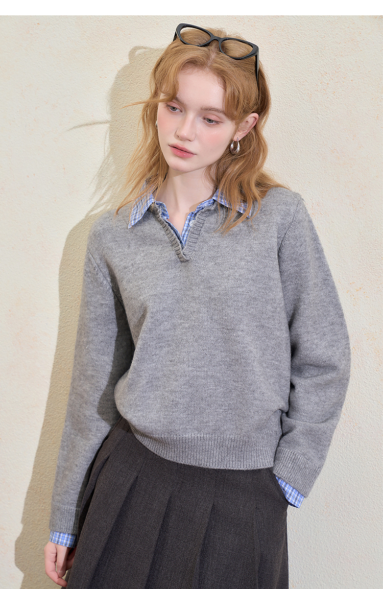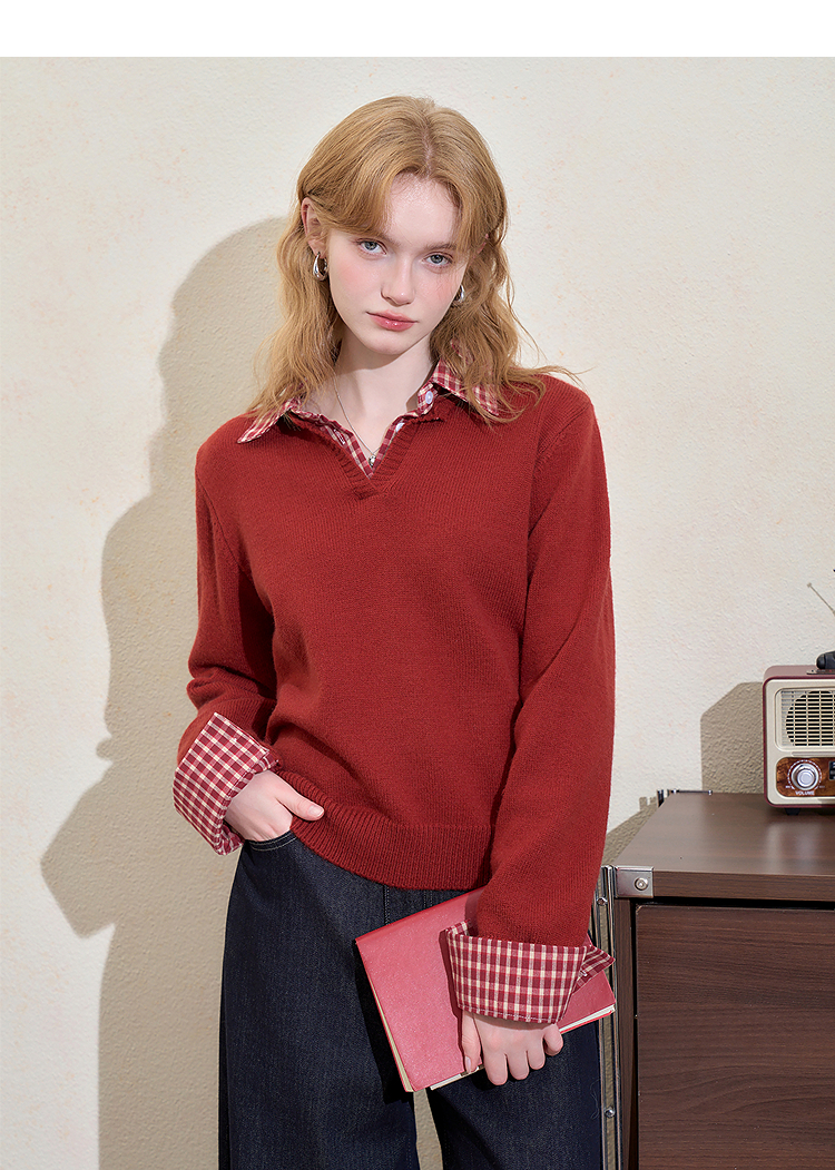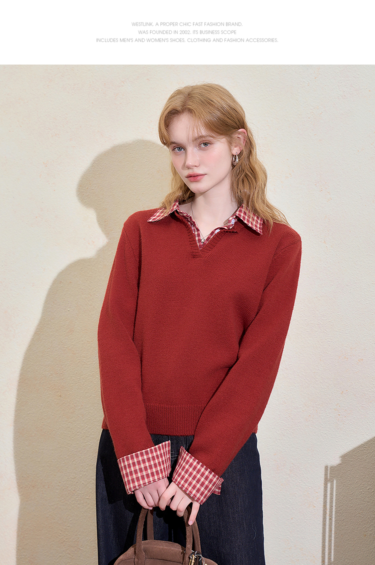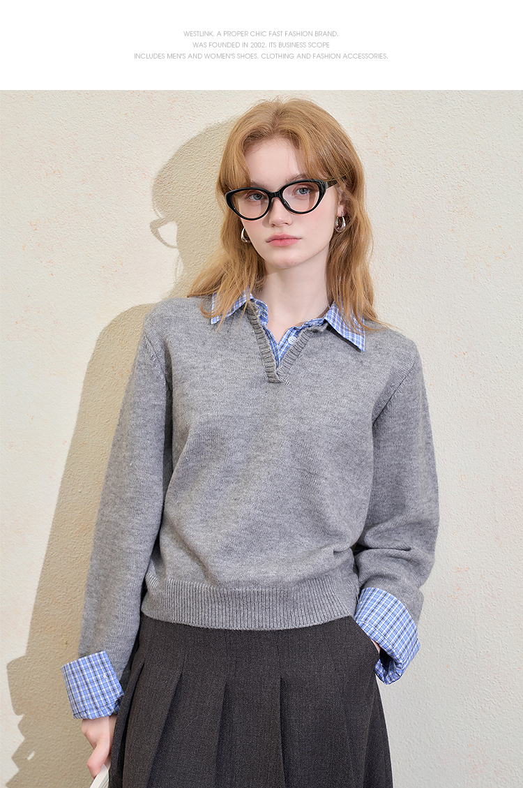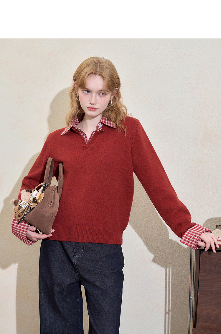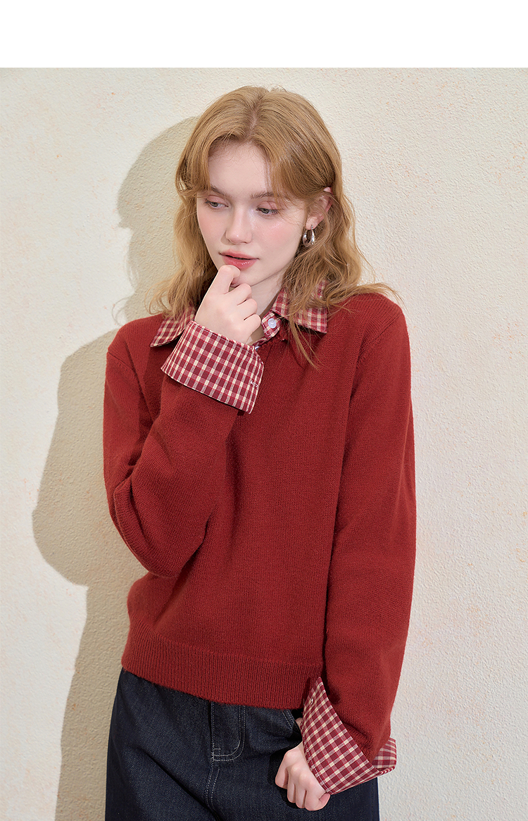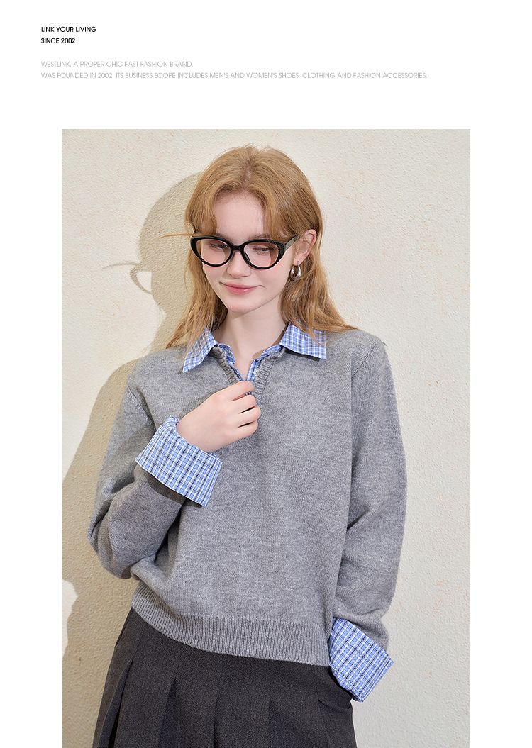 西遇假两件格纹拼接套头毛衣女冬季新款气质百搭翻领针织衫H0055301