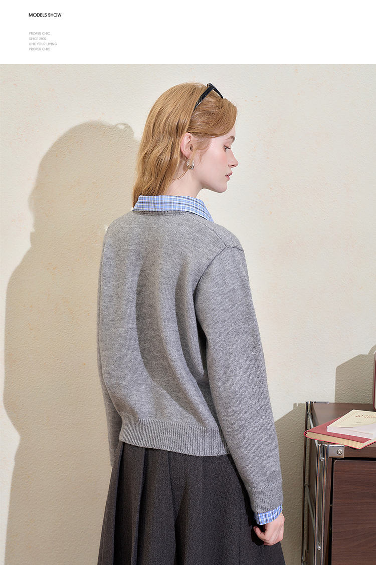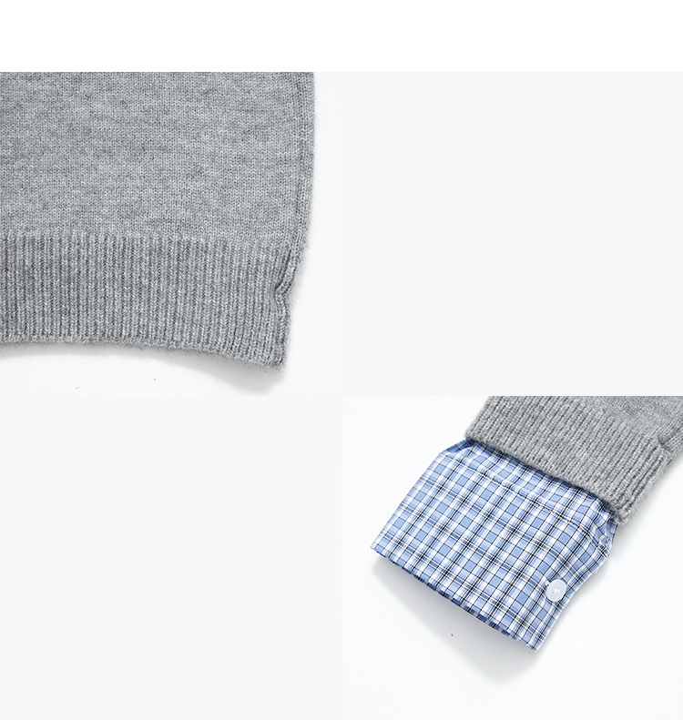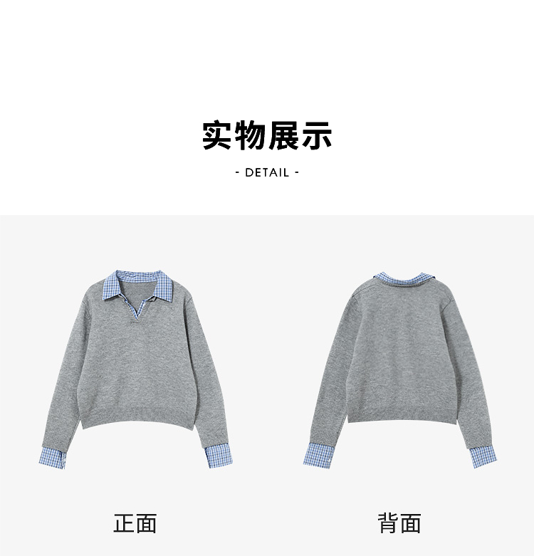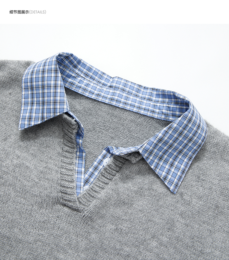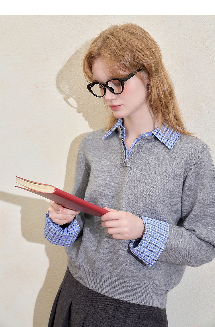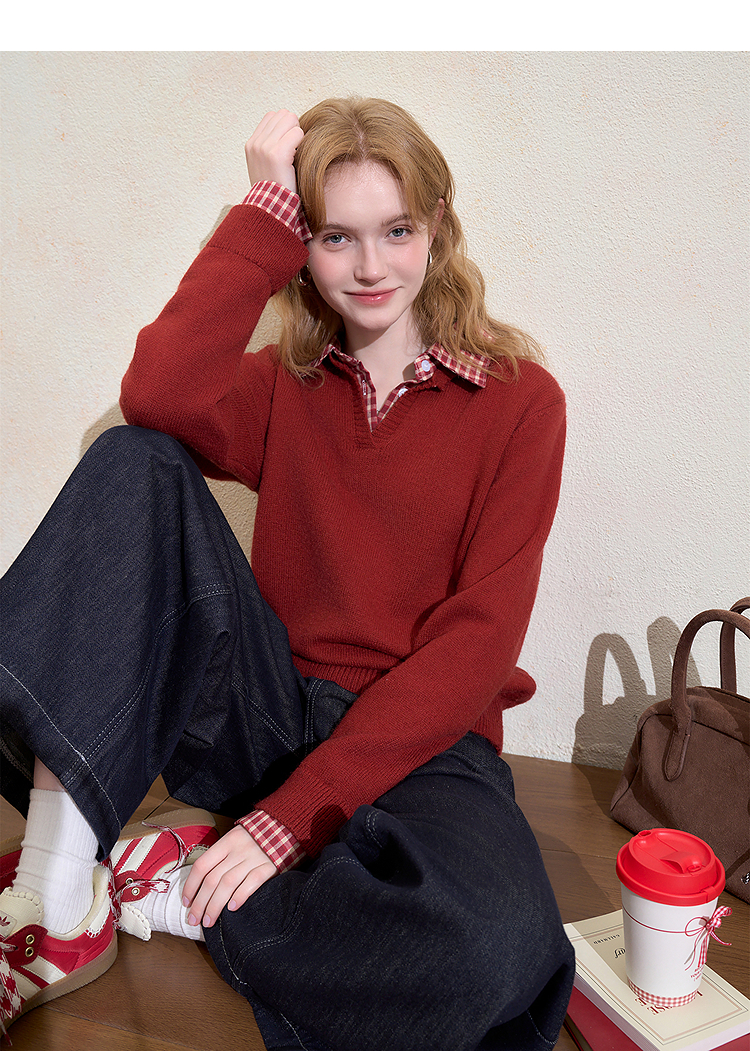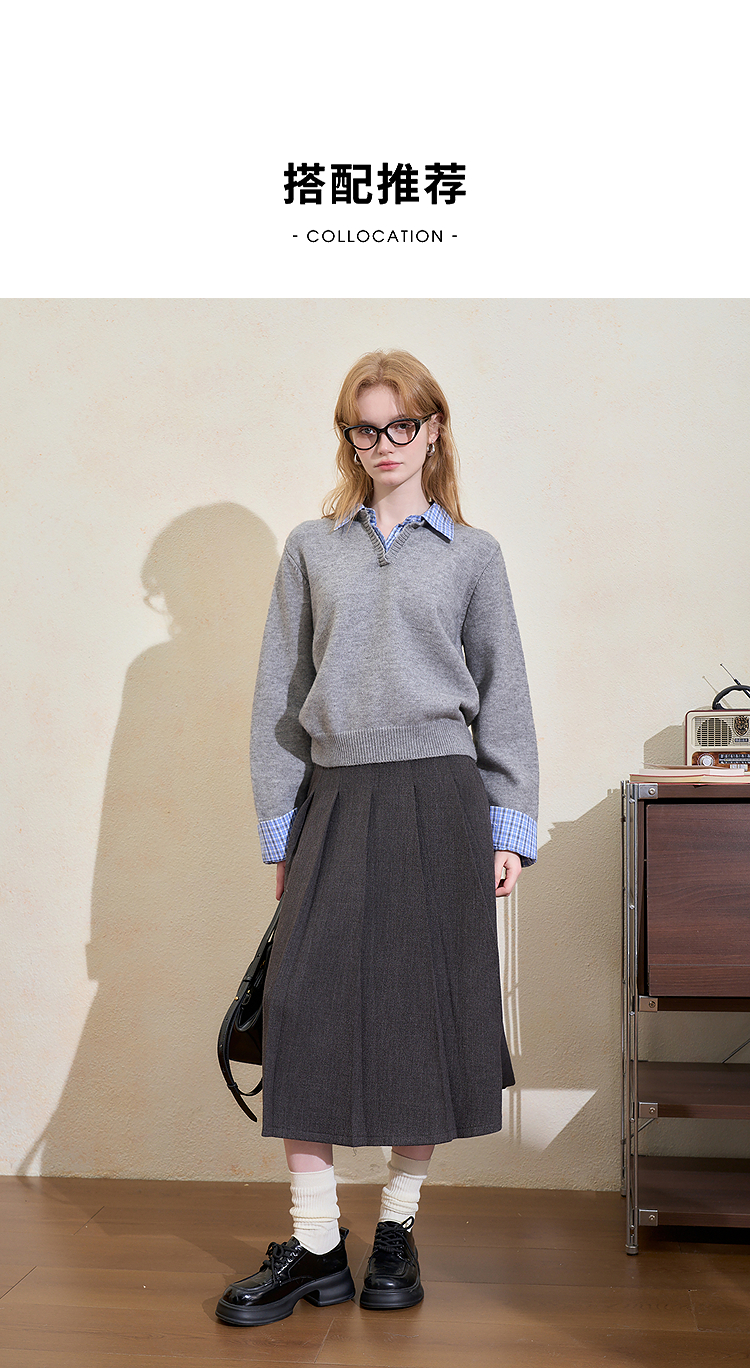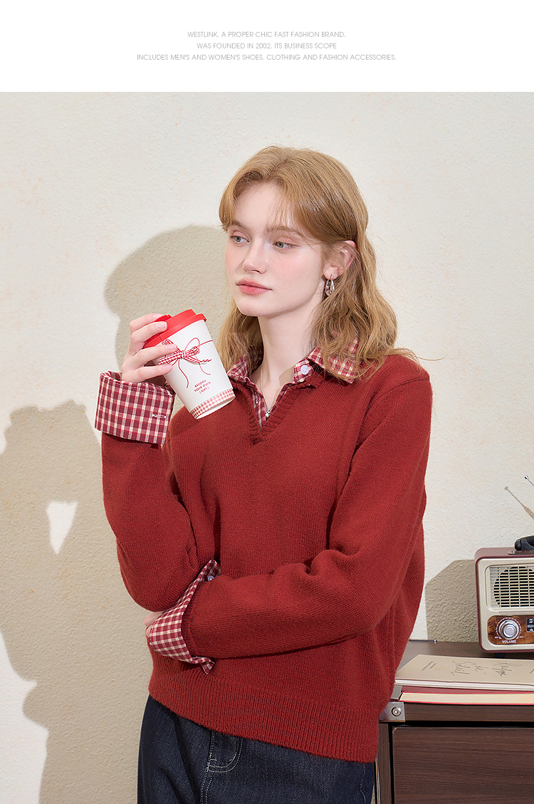 西遇假两件格纹拼接套头毛衣女冬季新款气质百搭翻领针织衫H0055301