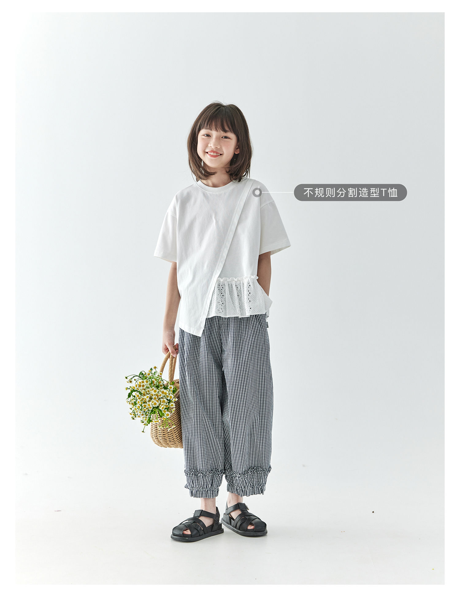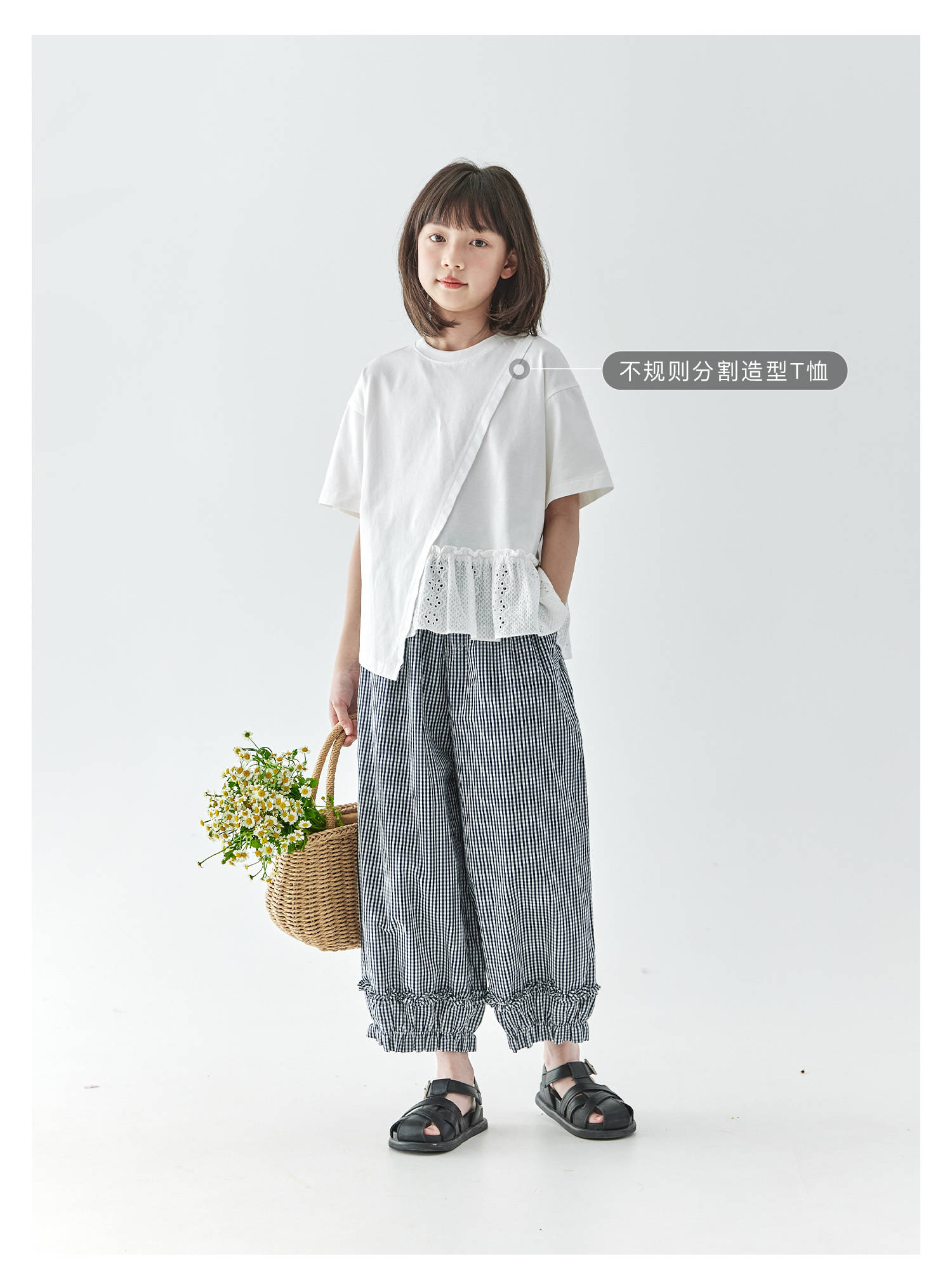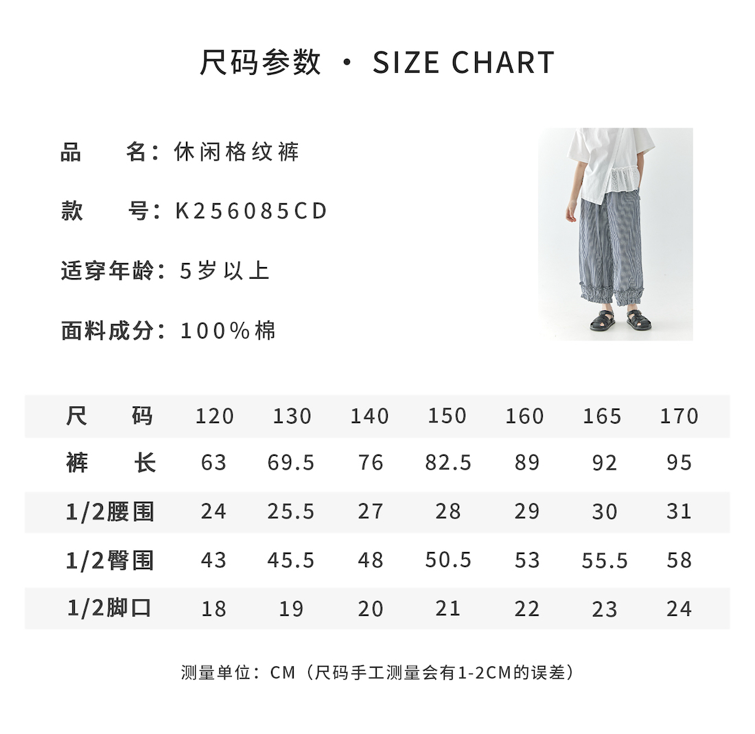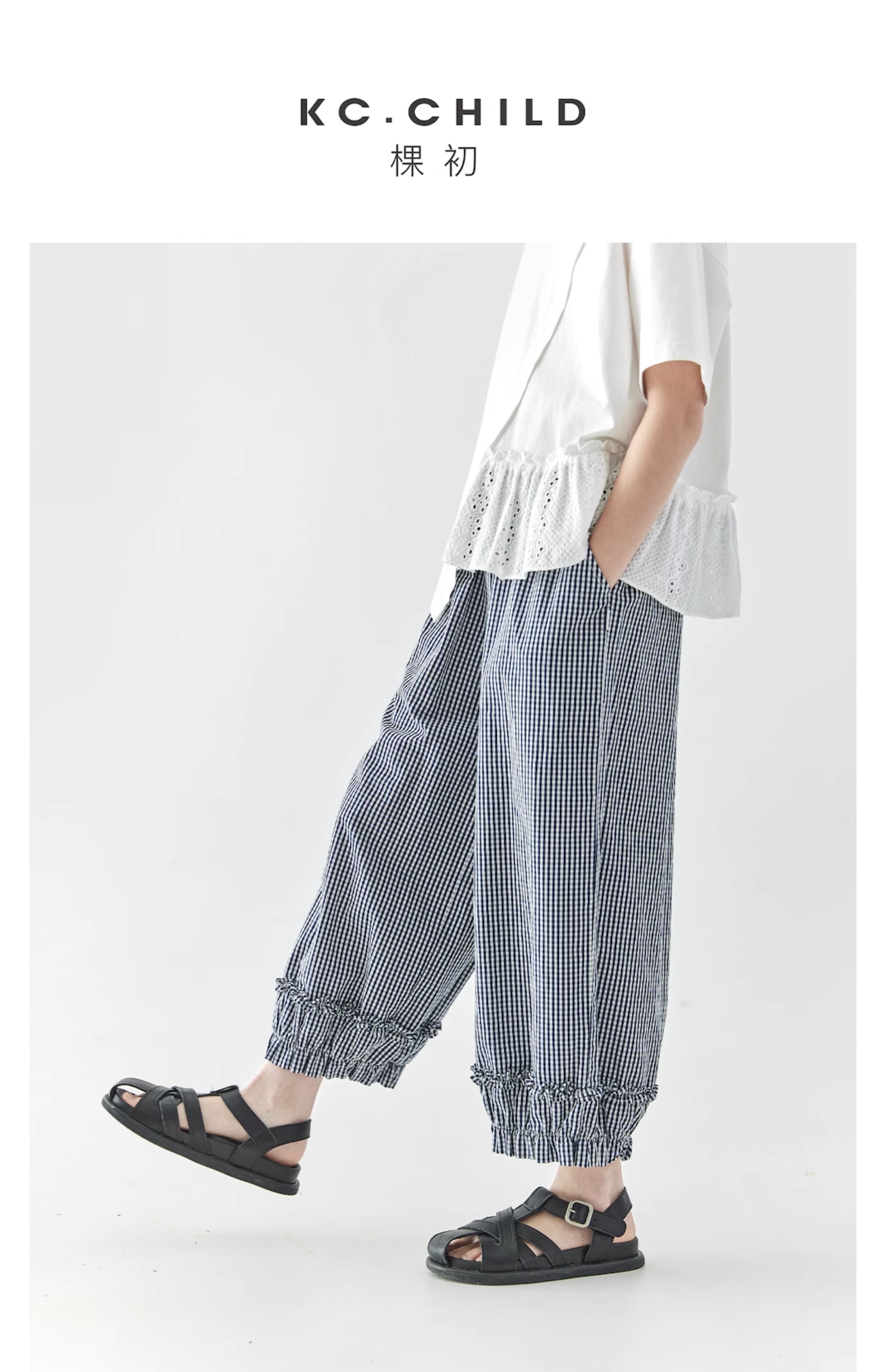 棵初2025夏季新款亲子中大女童格纹休闲裤纯棉荷叶边宽松裤