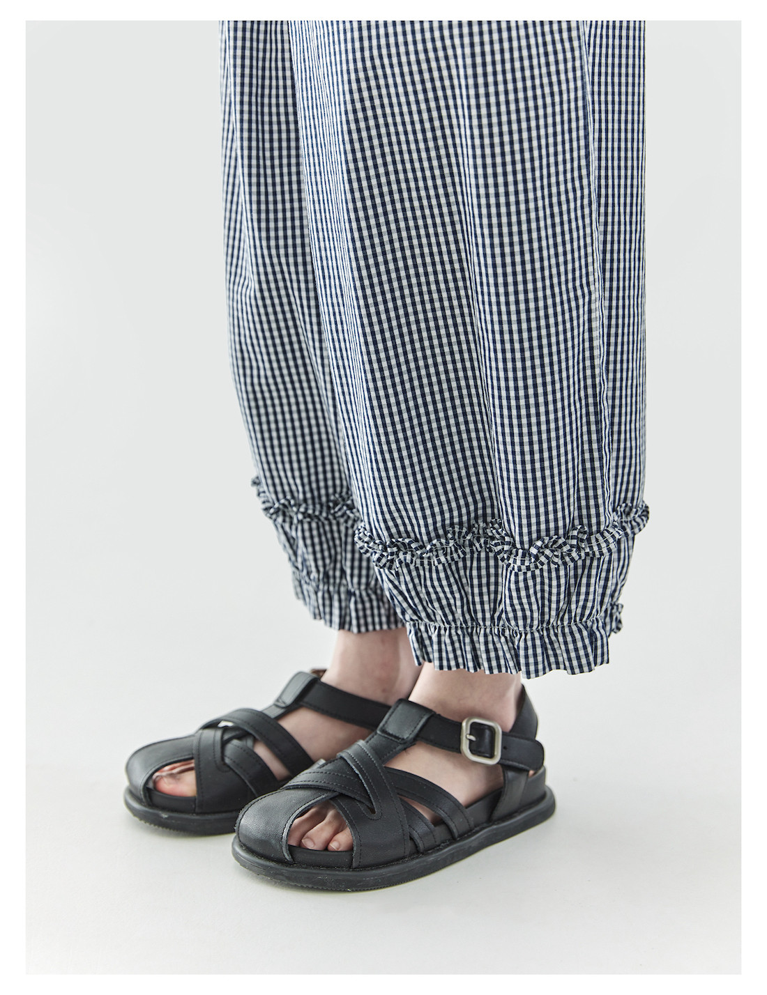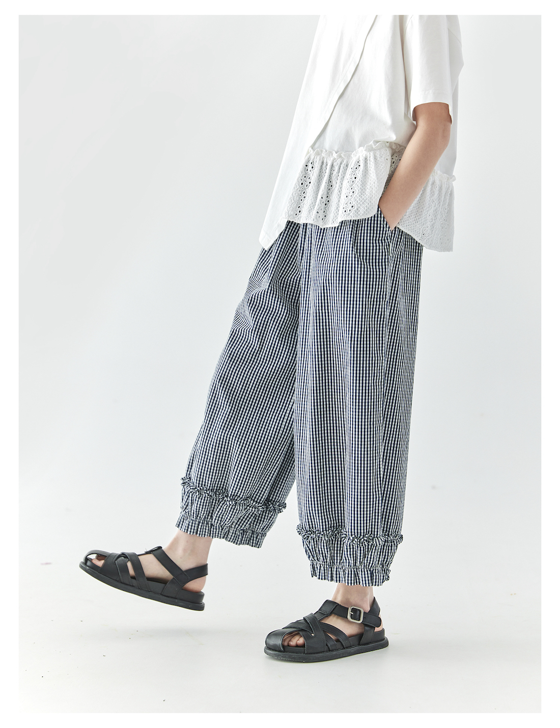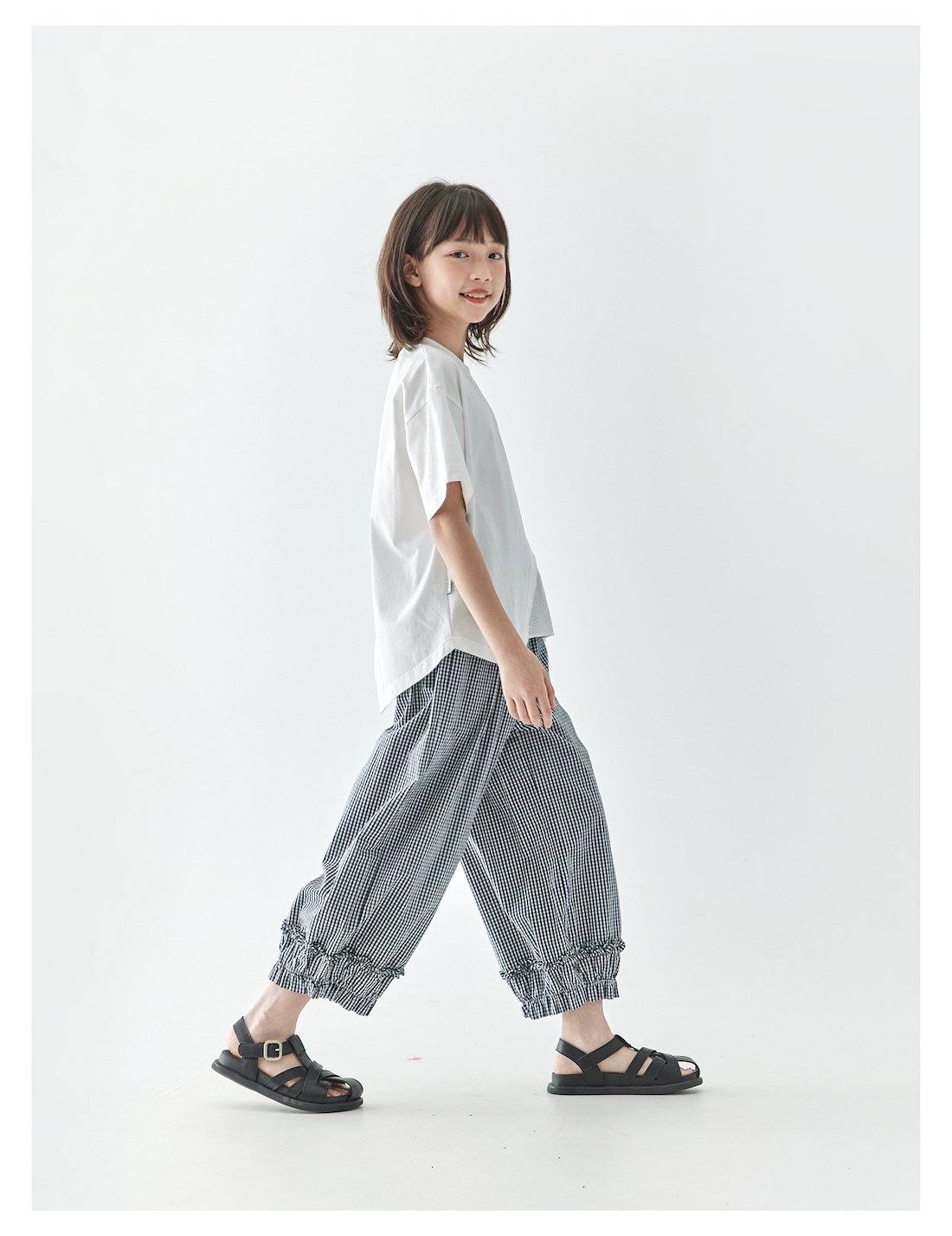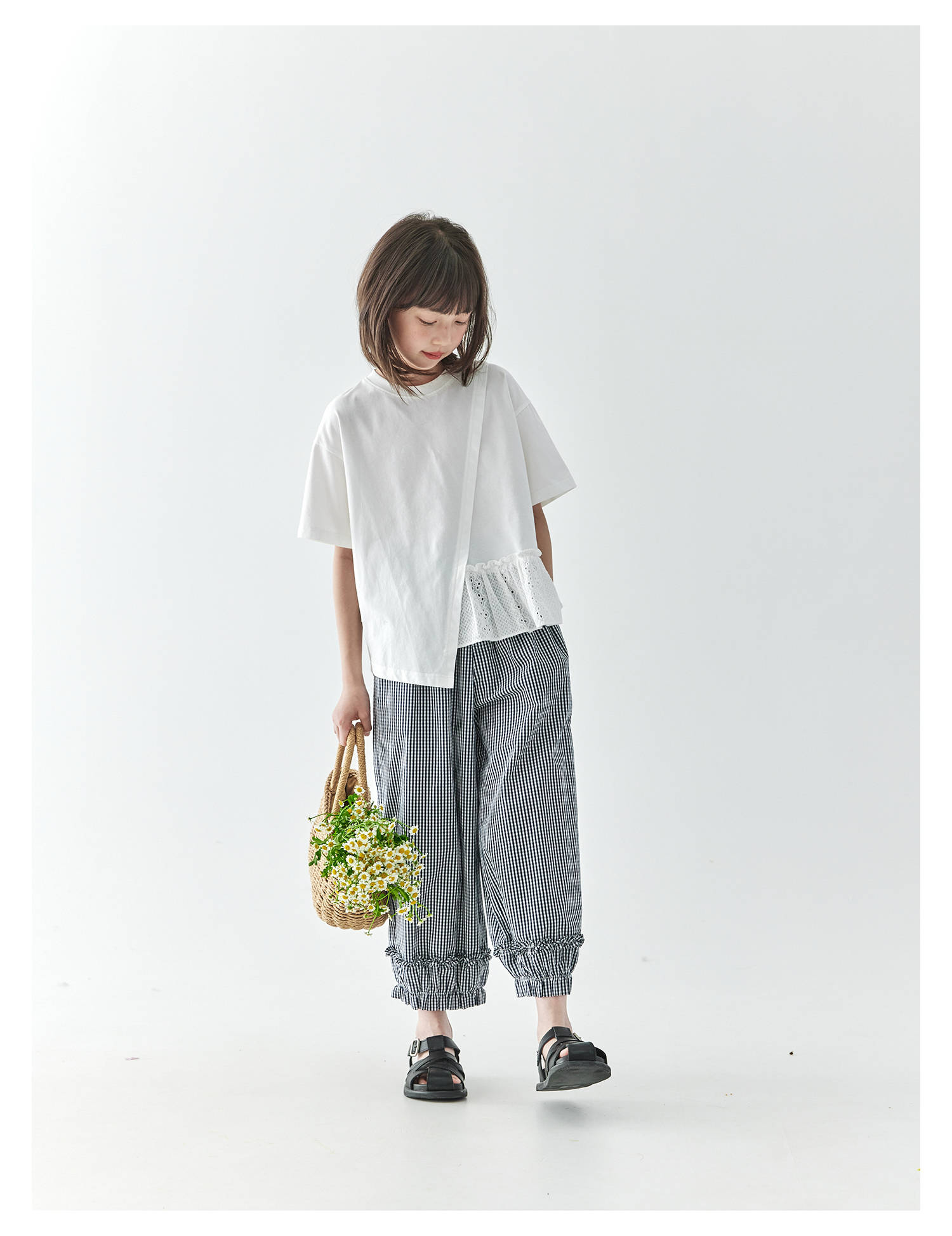 棵初2025夏季新款亲子中大女童格纹休闲裤纯棉荷叶边宽松裤