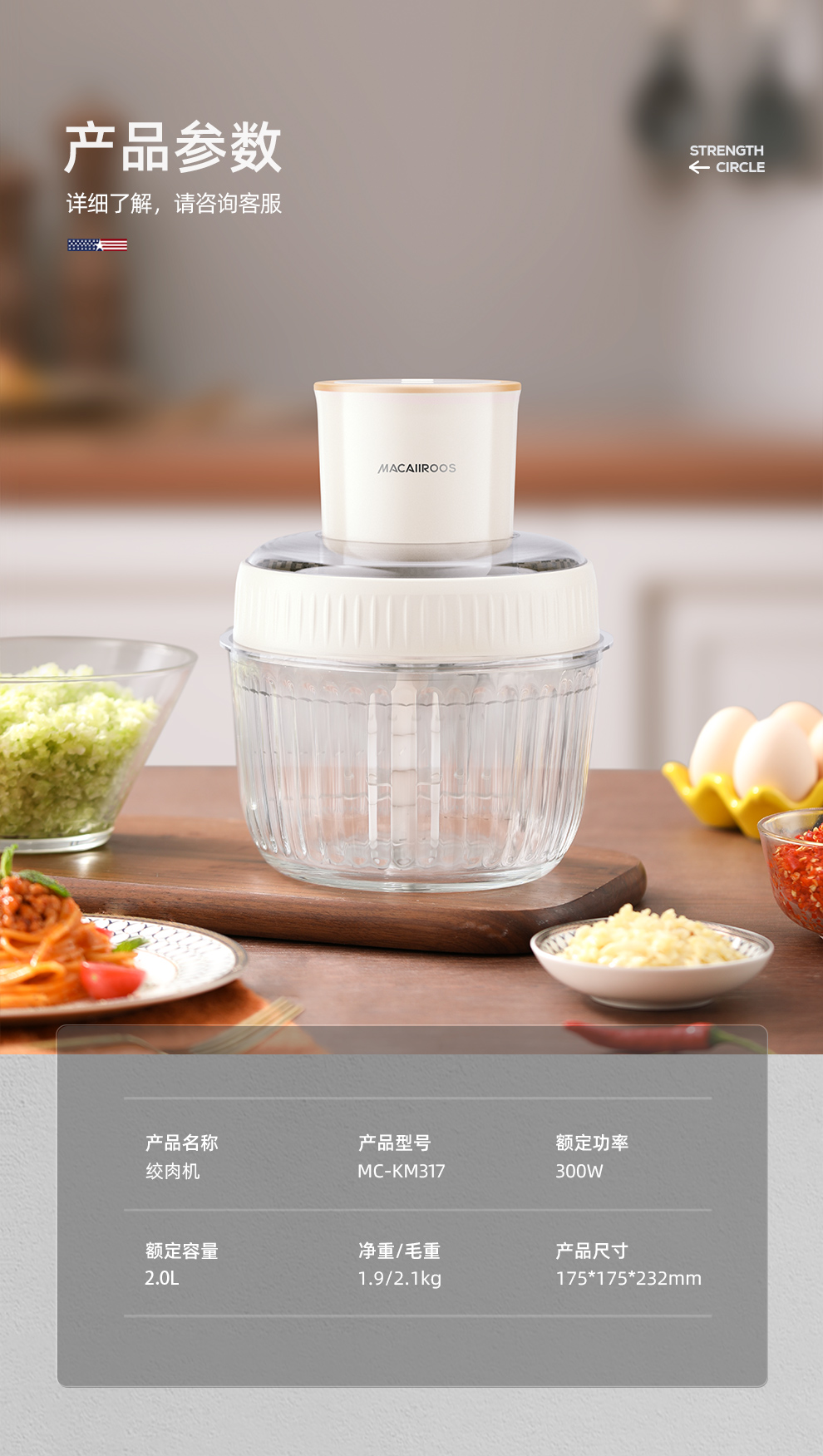 【小家电】迈卡罗MACAIIROOS绞肉机家用绞馅机2升玻璃杯身搅拌机 MC-KM317 HF