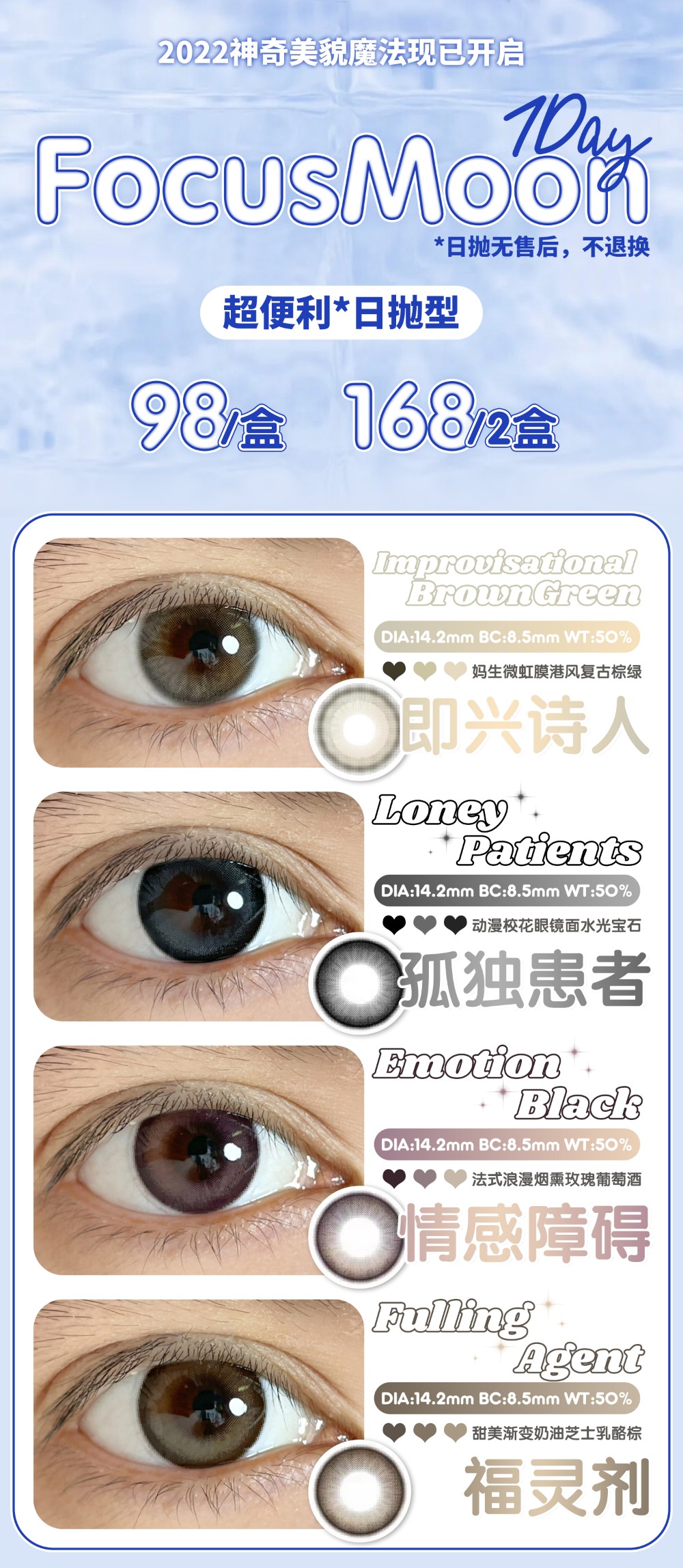 【日抛】FOCUSMOON日抛 98/盒 168/2盒 非离子材质(0-800度)