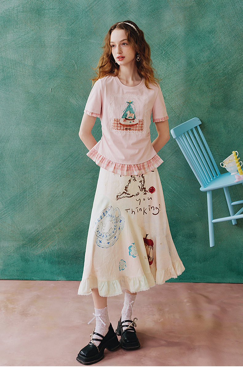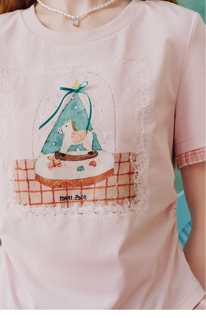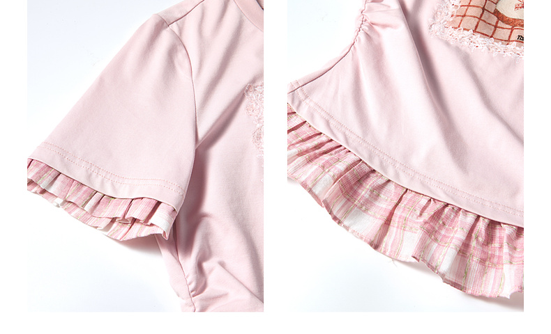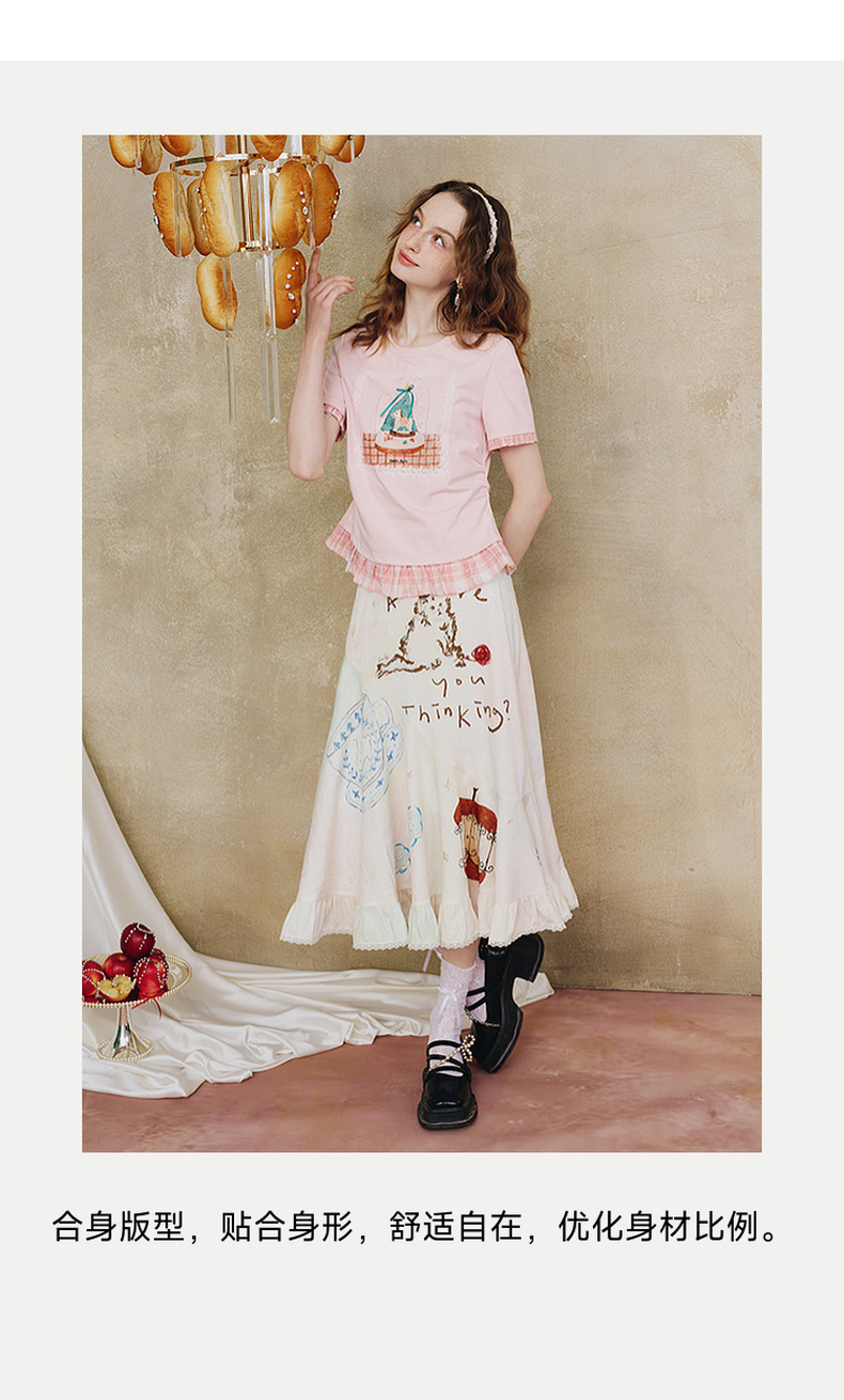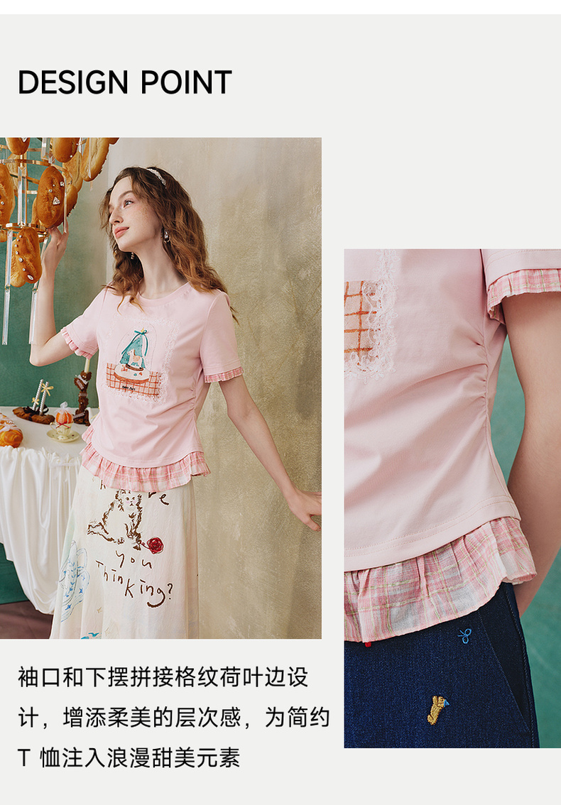 两三事甜乡梦马2025夏新款格子荷叶边印花短袖t恤女宽松