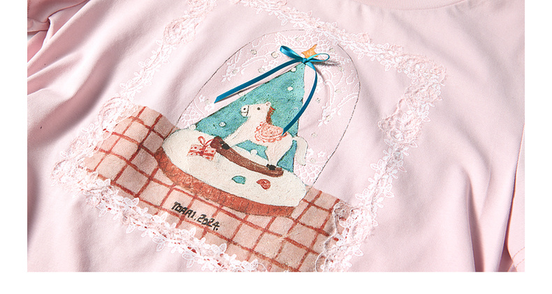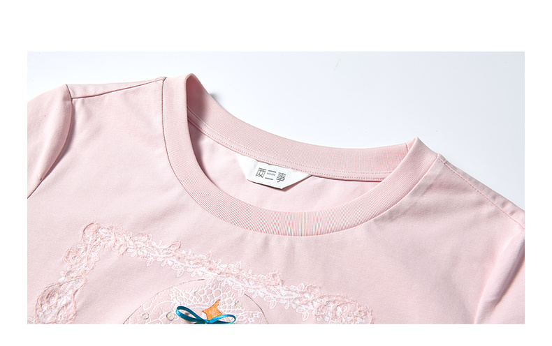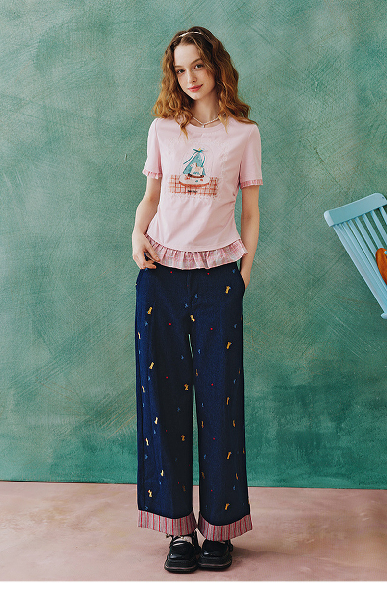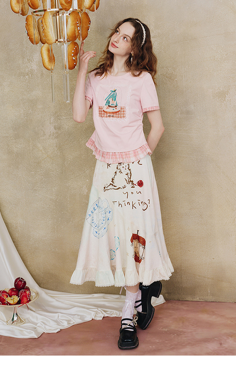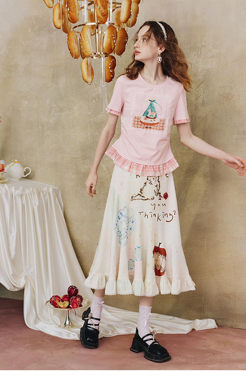 两三事甜乡梦马2025夏新款格子荷叶边印花短袖t恤女宽松