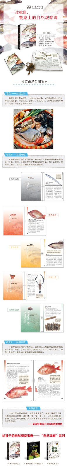 这本《菜市场鱼图鉴》立足于常见水产、生鲜, 囊括了几乎所有常见的淡水鱼、海水鱼、虾、蟹、螺、贝,以及头足类,能够大程度上帮助普通大众了解自己餐桌舌尖上的美食背后的科学文化信息。