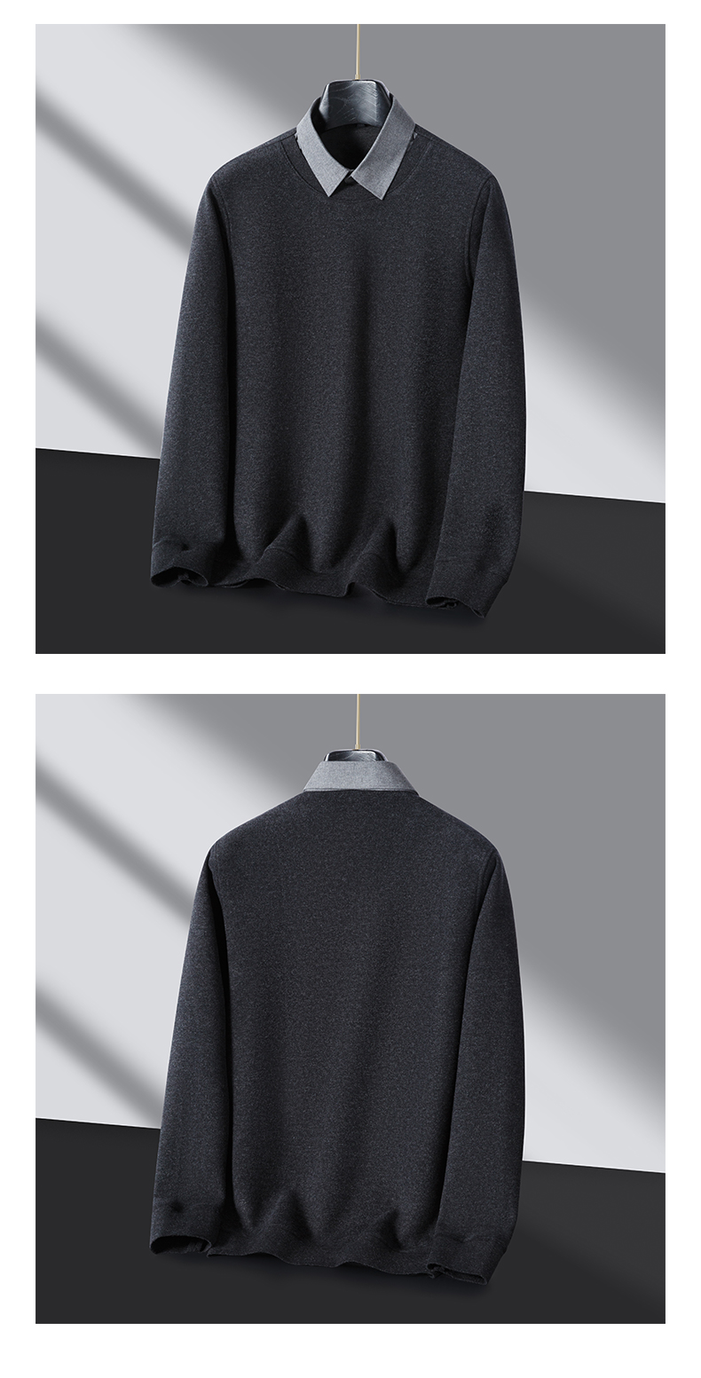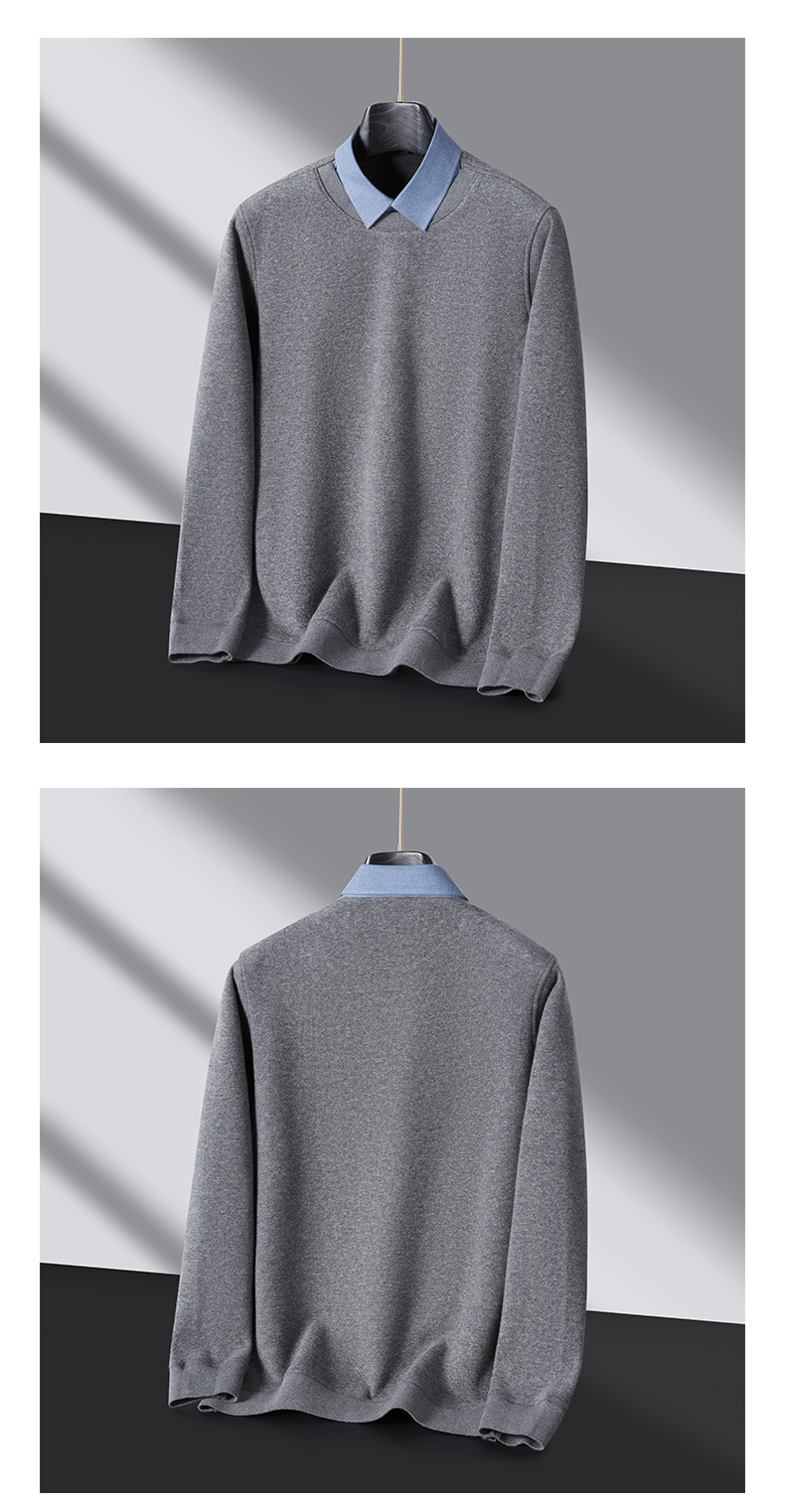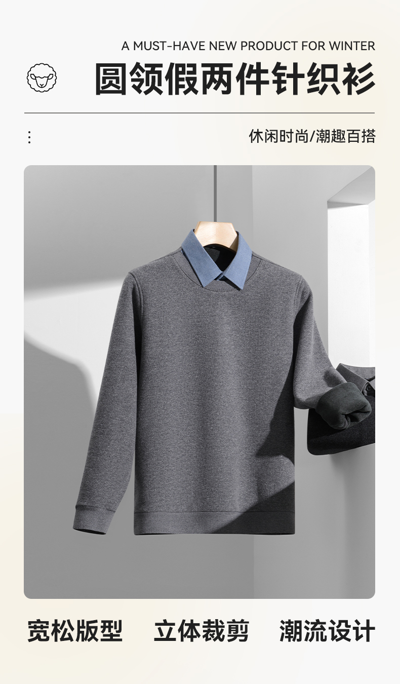 【含绵羊毛】罗蒙男士秋冬圆领假两件针织衫休闲通勤男加绒保暖针织毛衣