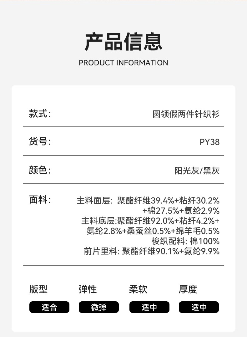 里层:92%聚酯纤维 4.2%粘纤 2.8%氨纶 0.5%绵羊毛 0.5%桑蚕丝