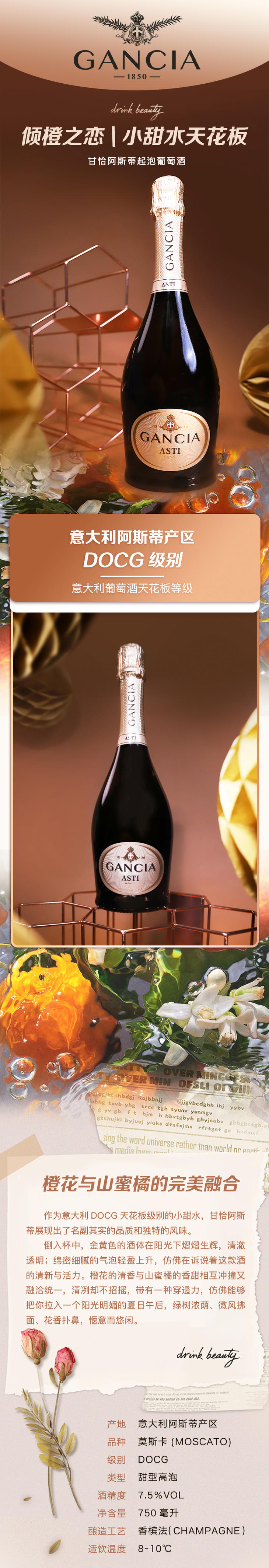 【臻选好酒】甘恰阿斯蒂起泡白葡萄酒纸箱装750ml*6(全国) 一箱起发