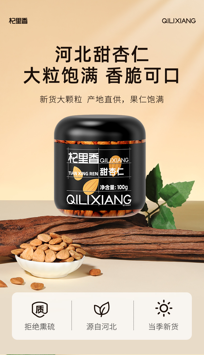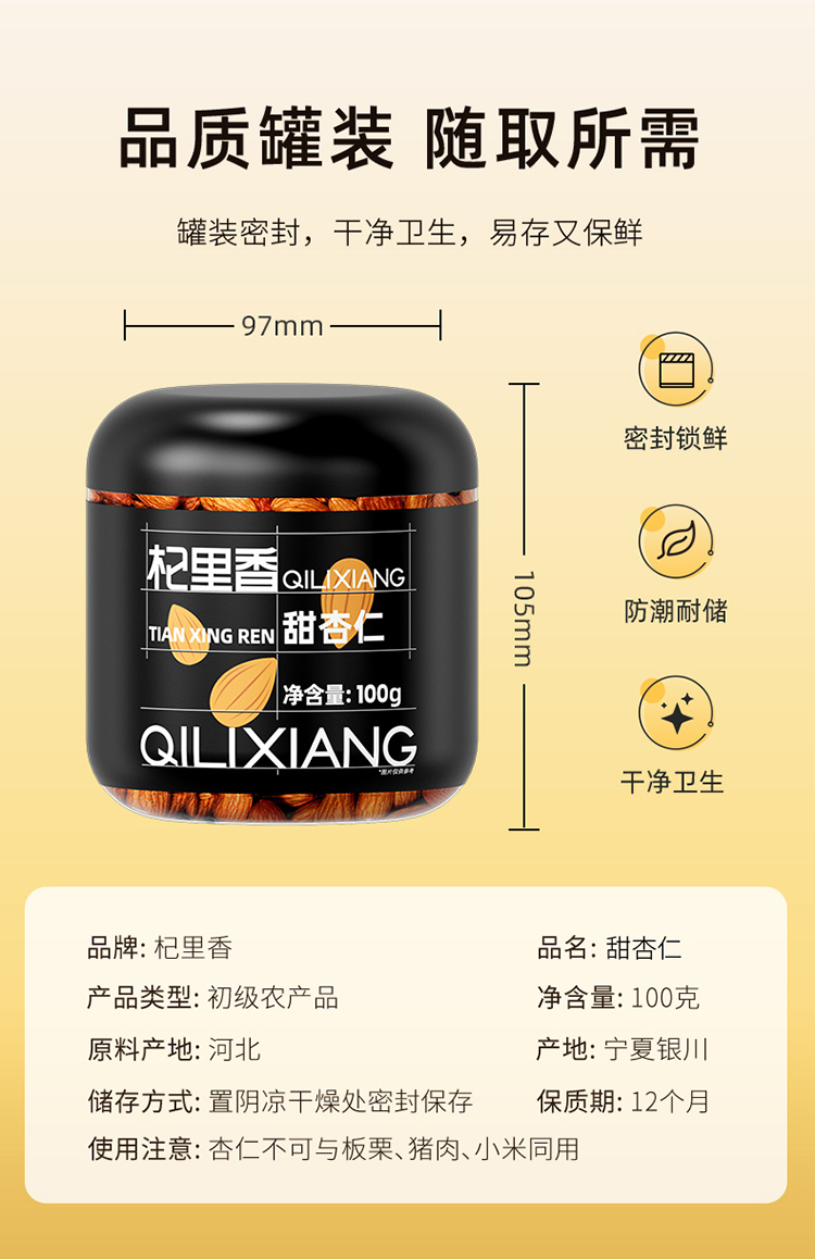杞里香100g罐装甜杏仁河北好杏仁甜杏仁,个头大,坚果香气足,不苦,日常生食,香脆可口,煮粥泡水皆可以