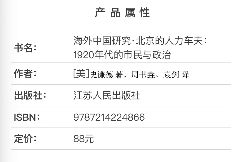 北京的人力车夫:1920年代的市民与政治 [美]史谦德 著,周书垚、袁剑 译,周育民 校 江苏人民出版社