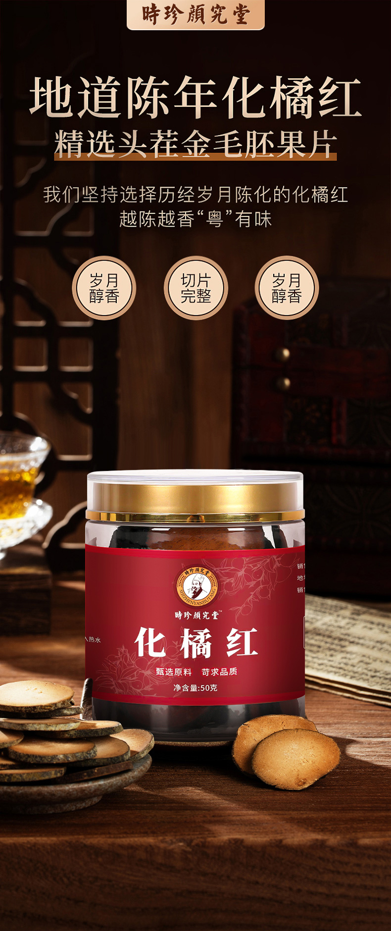 源自1921年时珍颜究堂 陈年化州陈橘红即冲即饮 匠心润喉秘方 百年古法传承工艺 减轻咽喉不适养护养生 咽肺好伴侣 50g/罐