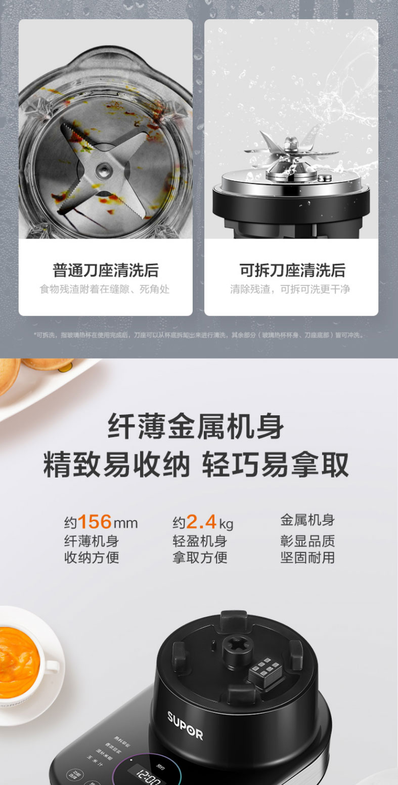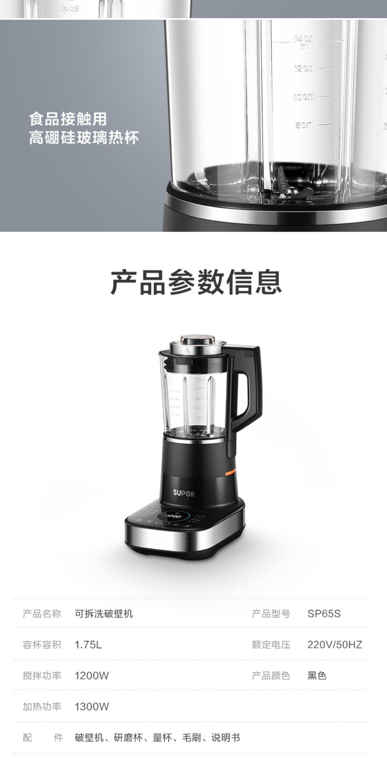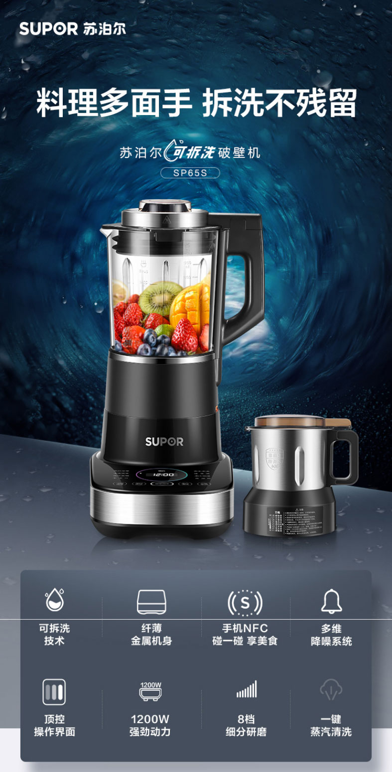 苏泊尔轻音可拆洗破壁机蒸汽清洗多功能加热破壁机超薄电机40000转速 一机双杯SP65S
