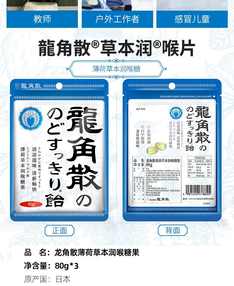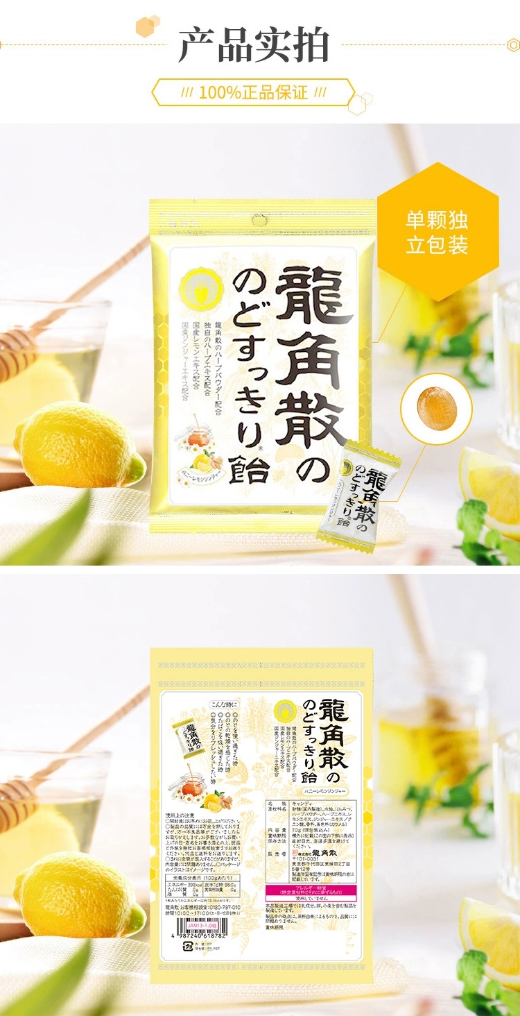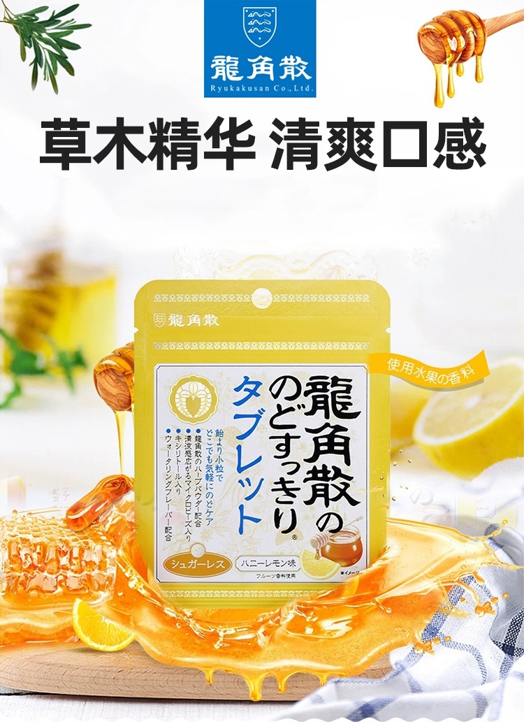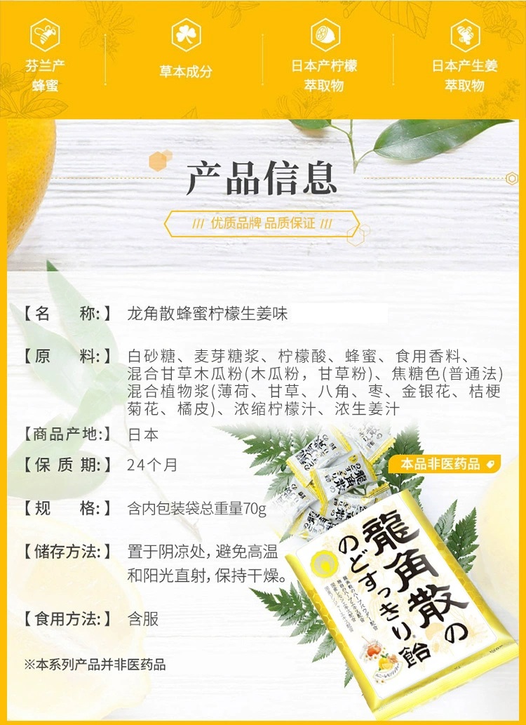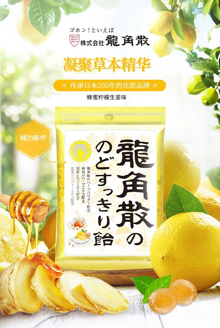 日本进口龙角散草本润喉含片 蜂蜜柠檬生姜味69.3g*2袋+薄荷草本80g*3袋
