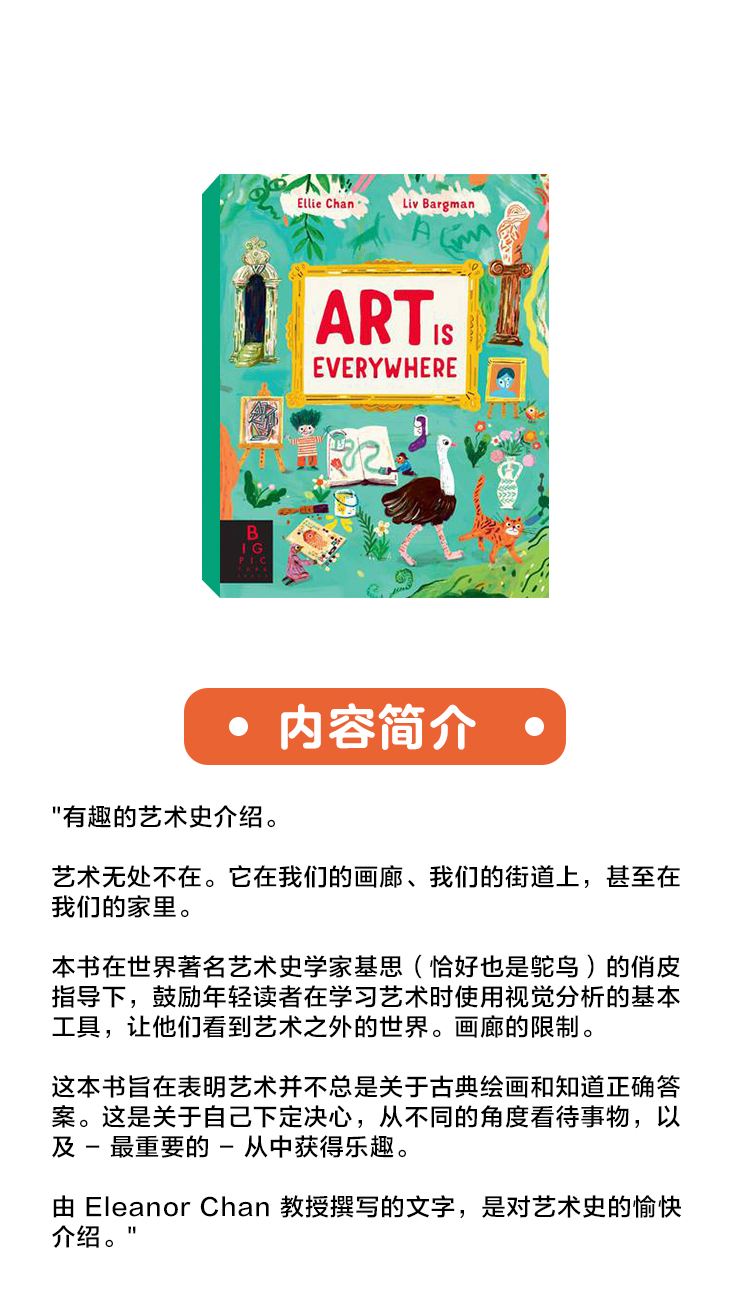 有趣的艺术史介绍。 艺术无处不在。它在我们的画廊、我们的街道上,甚至在我们的家里。 本书在世界著名艺术史学家基思(恰好也是鸵鸟)的俏皮指导下,鼓励年轻读者在学习艺术时使用视觉分析的基本工具,让他们看到艺术之外的世界。画廊的限制。 这本书旨在表明艺术并不总是关于古典绘画和知道正确答案。这是关于自己下定决心,从不同的角度看待事物,以及 - 最重要的 - 从中获得乐趣。 由 Eleanor Chan 教授撰写的文字,是对艺术史的愉快介绍。