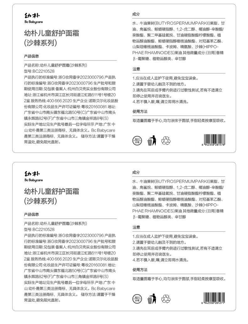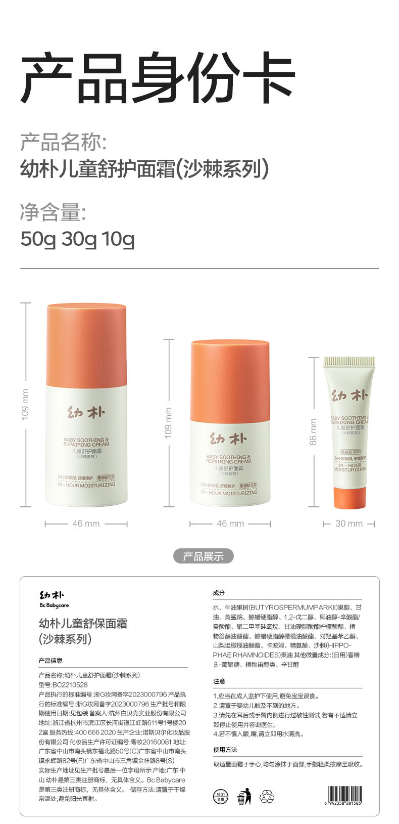 Babycare幼朴儿童舒护面霜30g(沙棘系列)宝宝婴儿身体乳舒缓