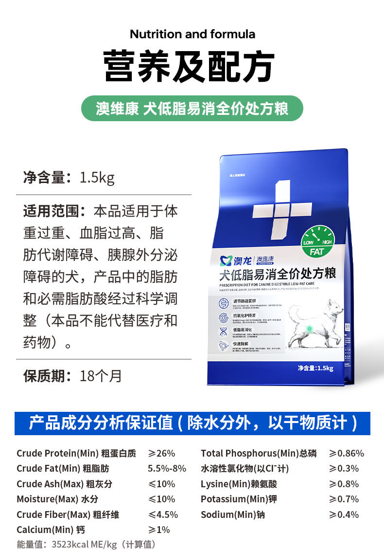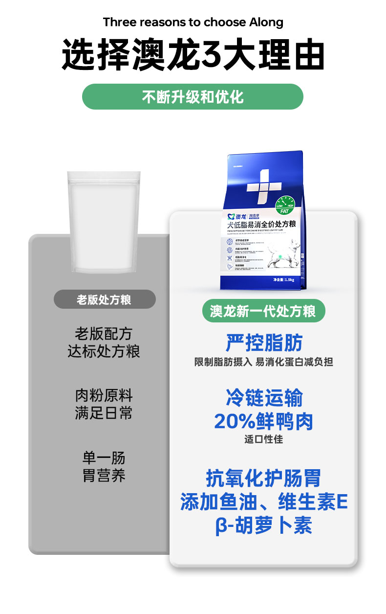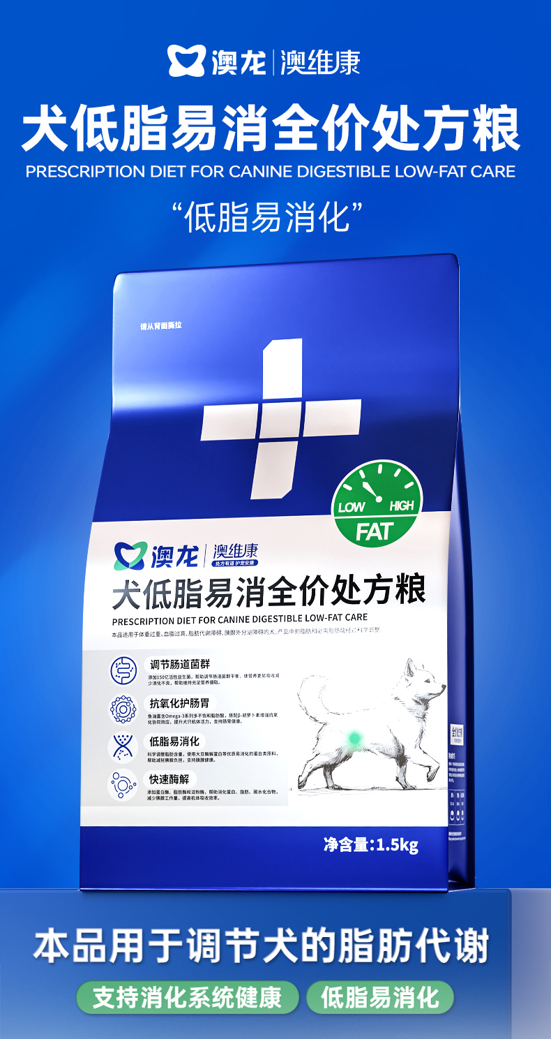 澳龙澳维康犬低脂易消全价处方粮1.5kg赠50g试吃