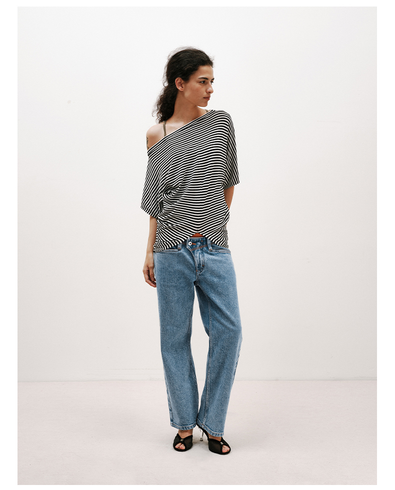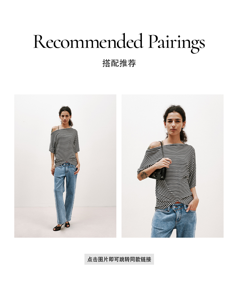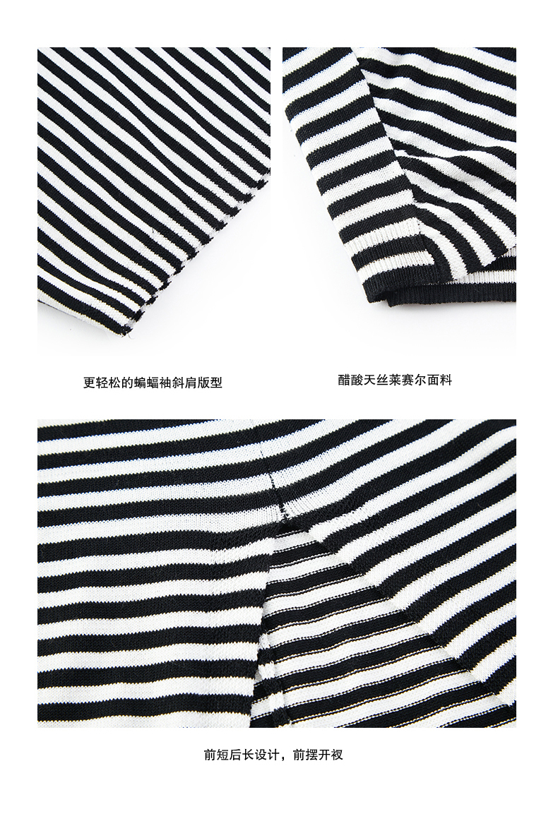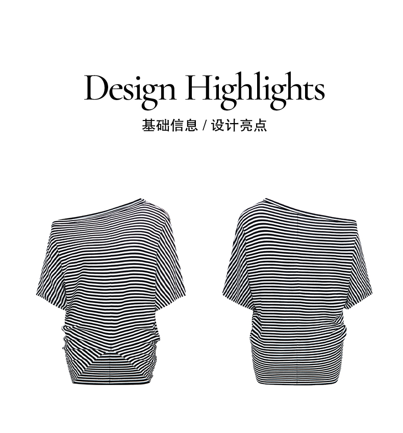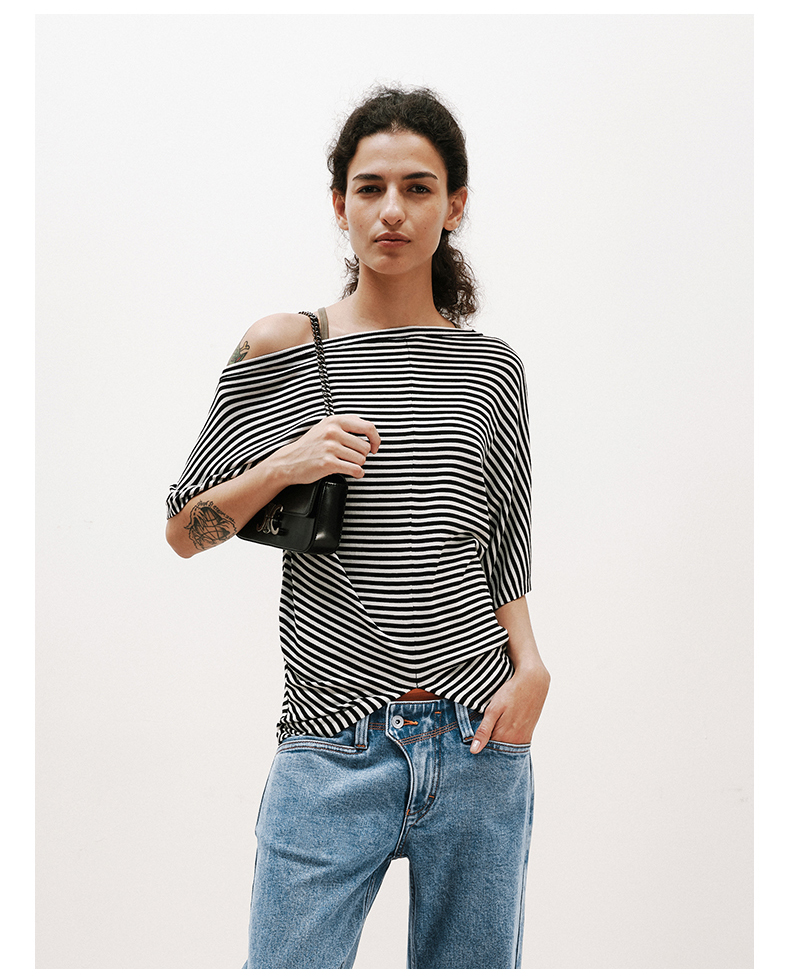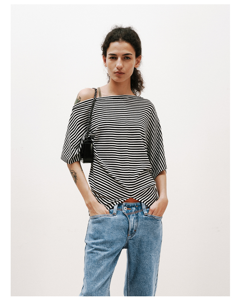 NUTH条纹斜肩宽松蝙蝠袖短袖T恤女 白色/黑白条纹