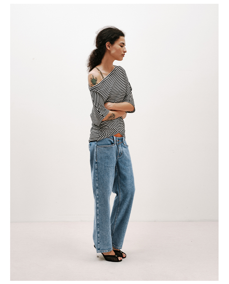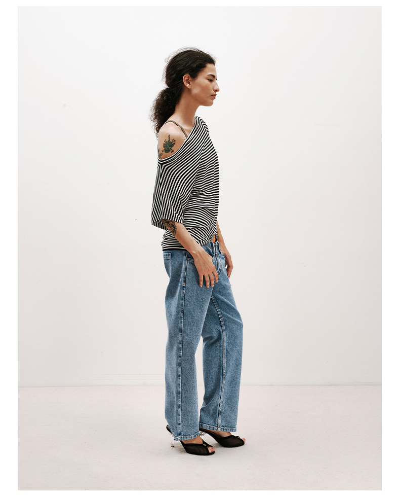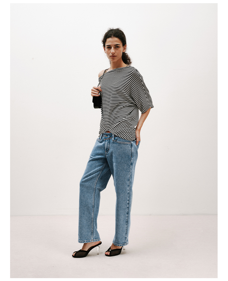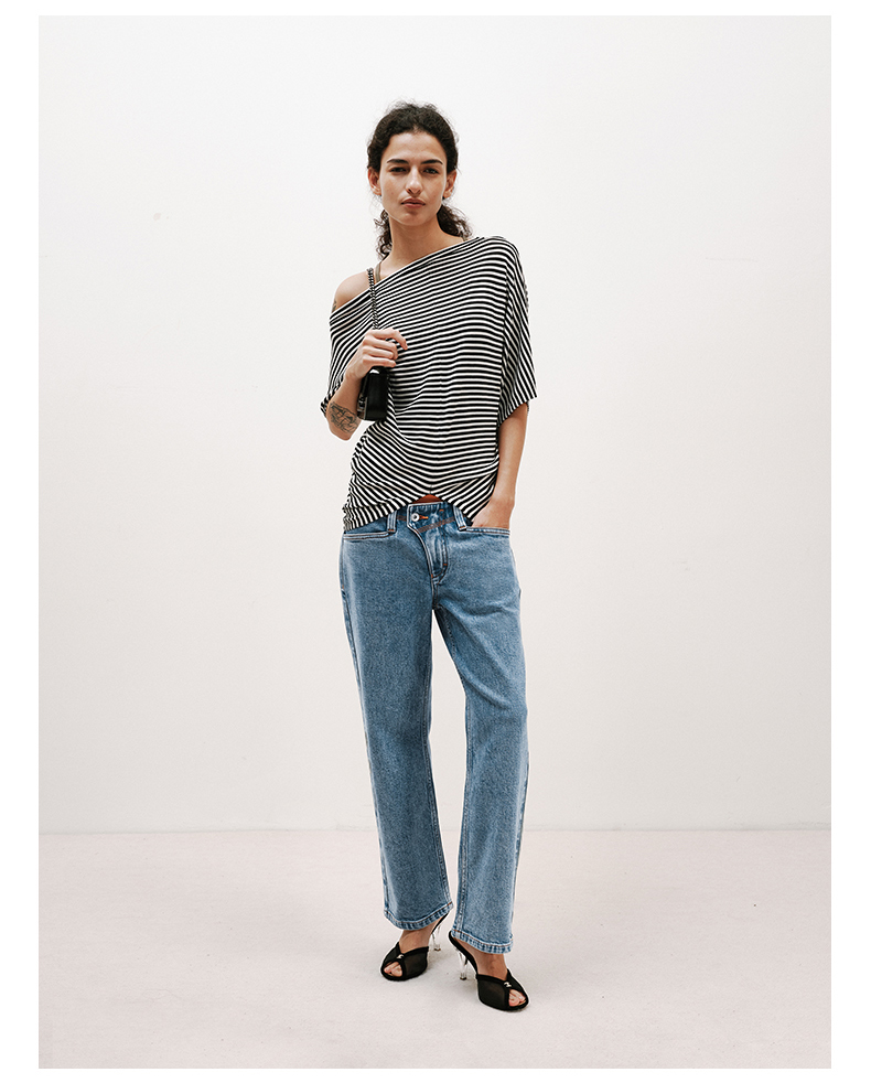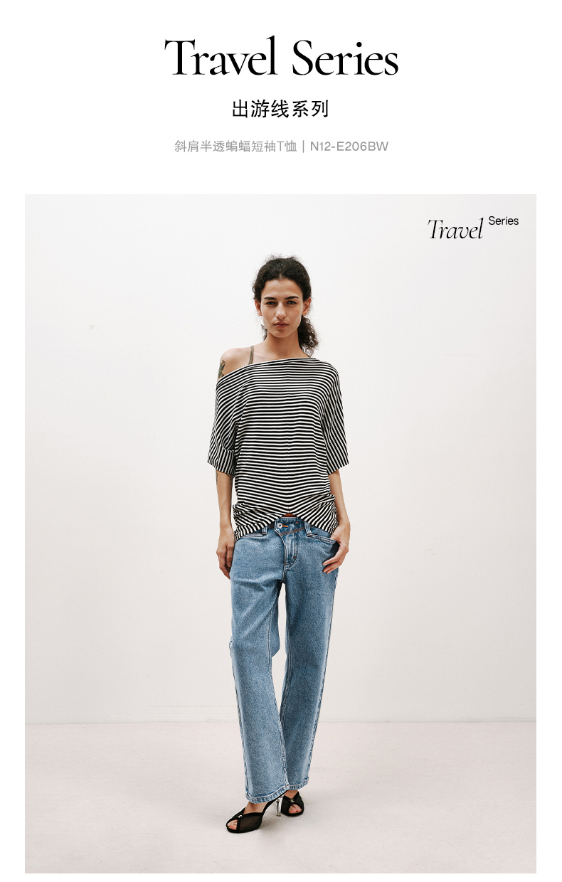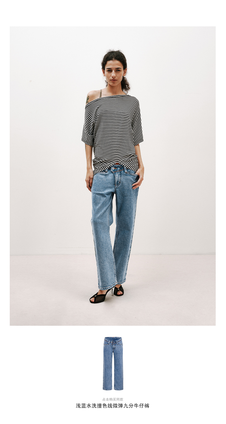 NUTH条纹斜肩宽松蝙蝠袖短袖T恤女 白色/黑白条纹