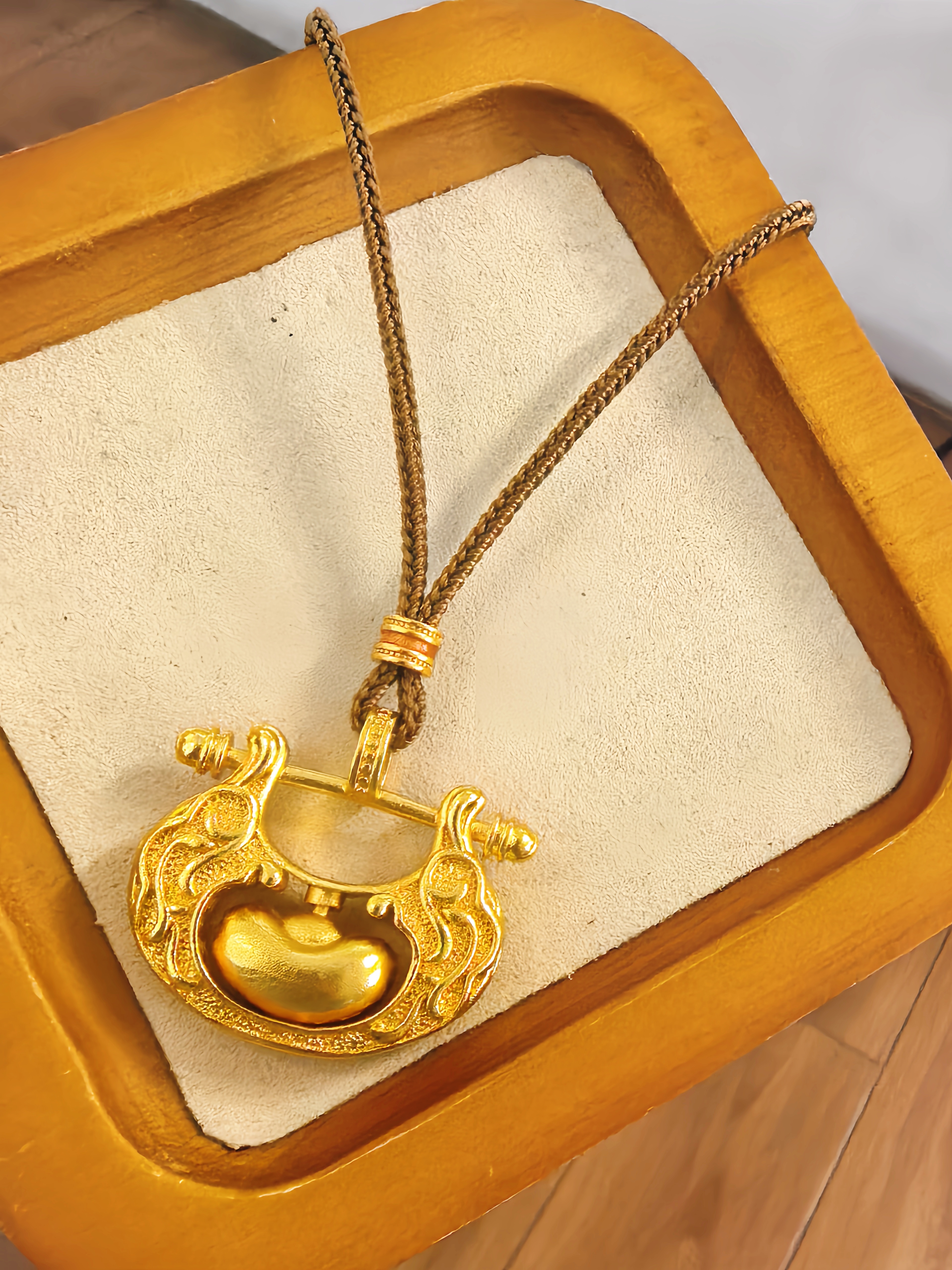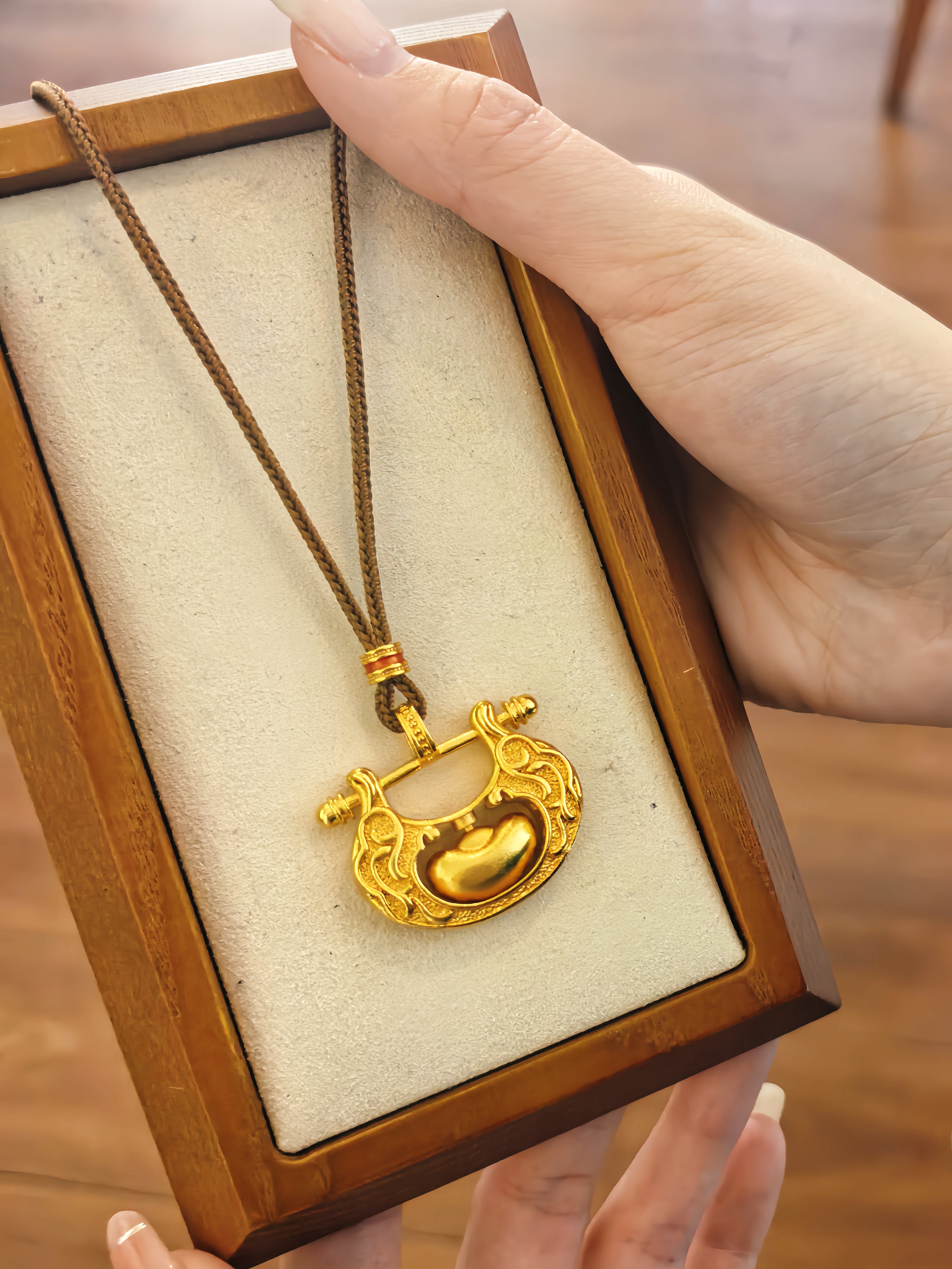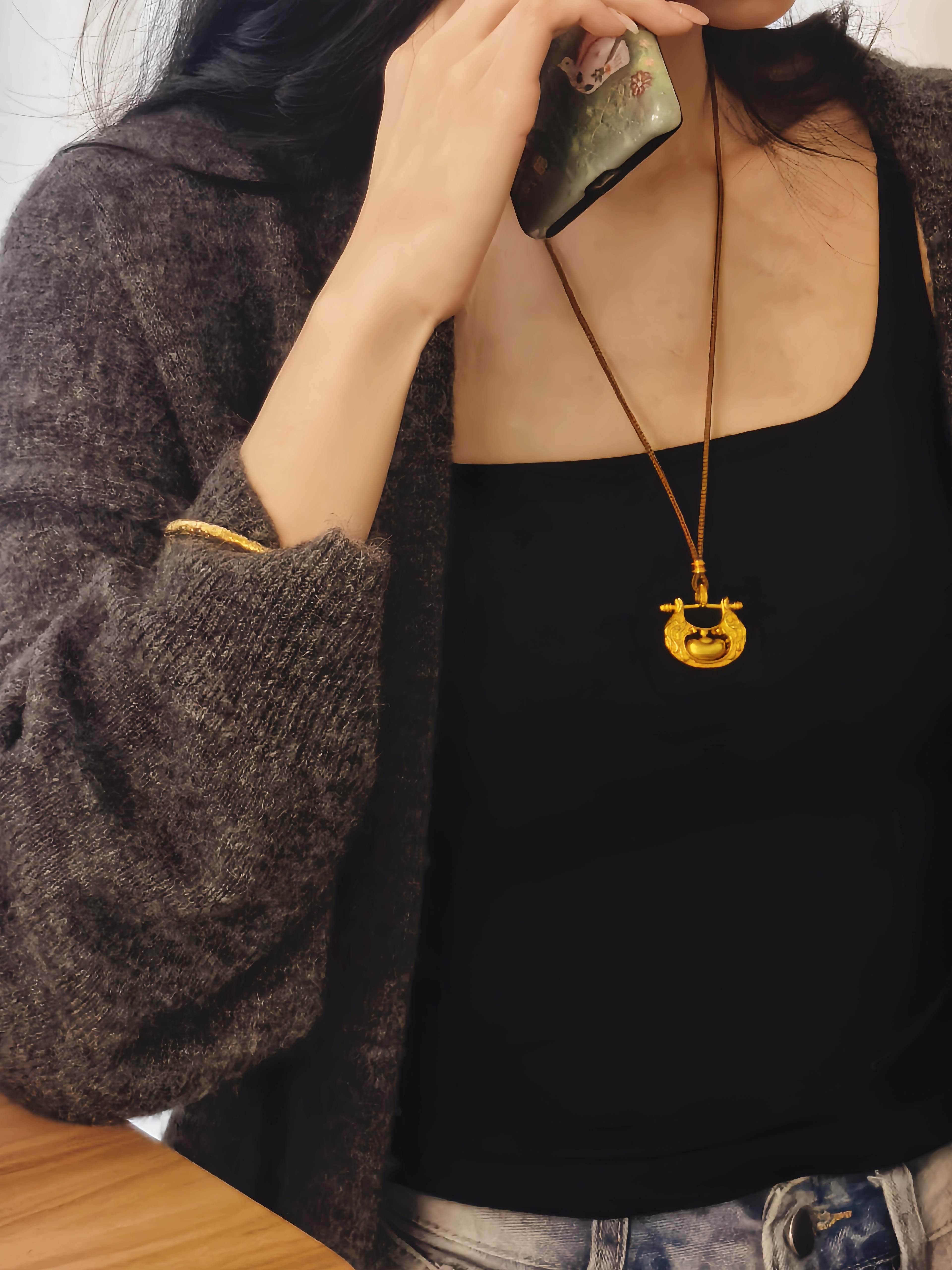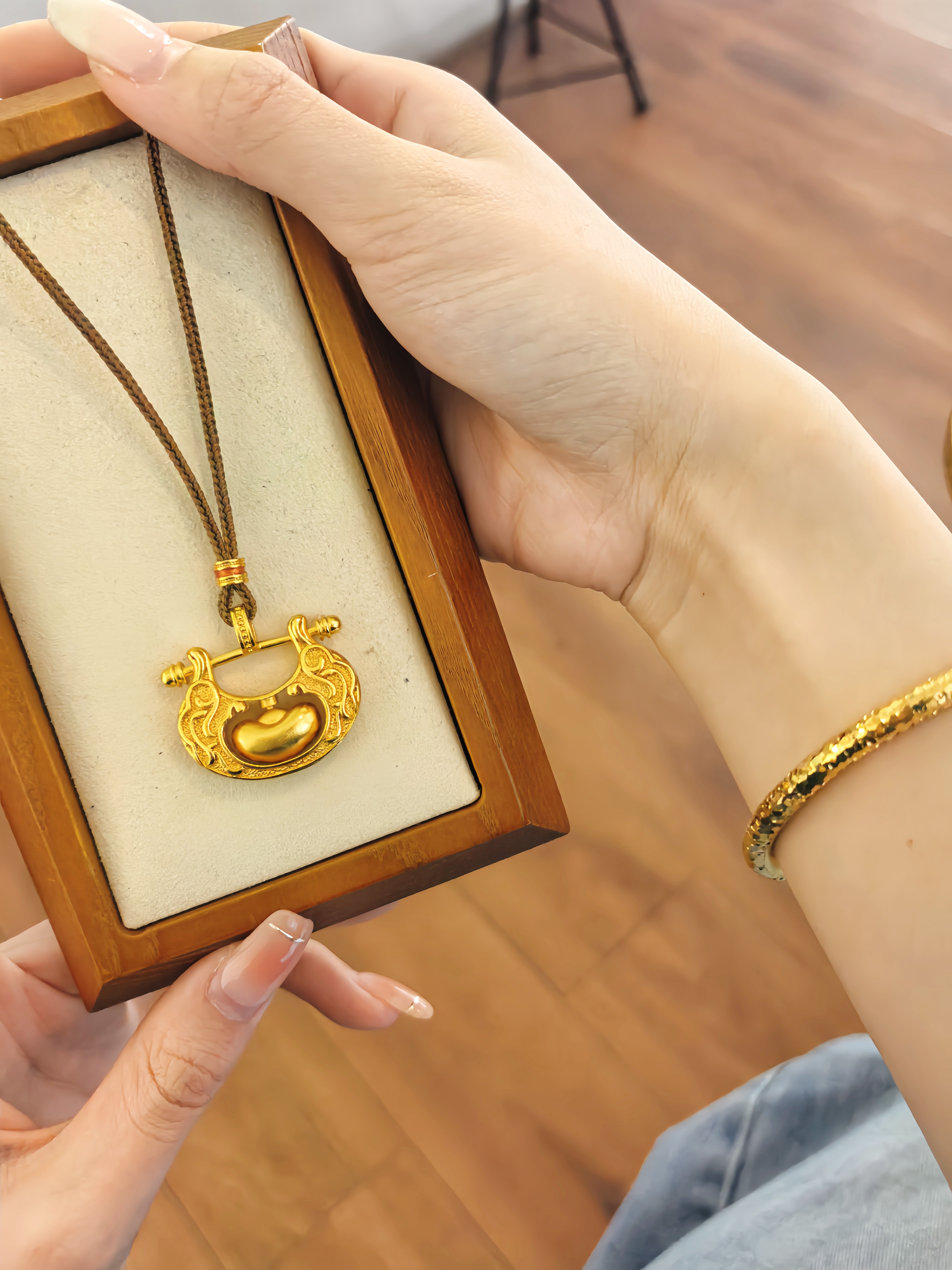 锁身雕刻传统纹样,中间嵌着饱满金元宝,既复刻了中式吉祥饰的经典形态,又通过精致小巧的尺寸,让传统元素跳出 “老气” 标签;
