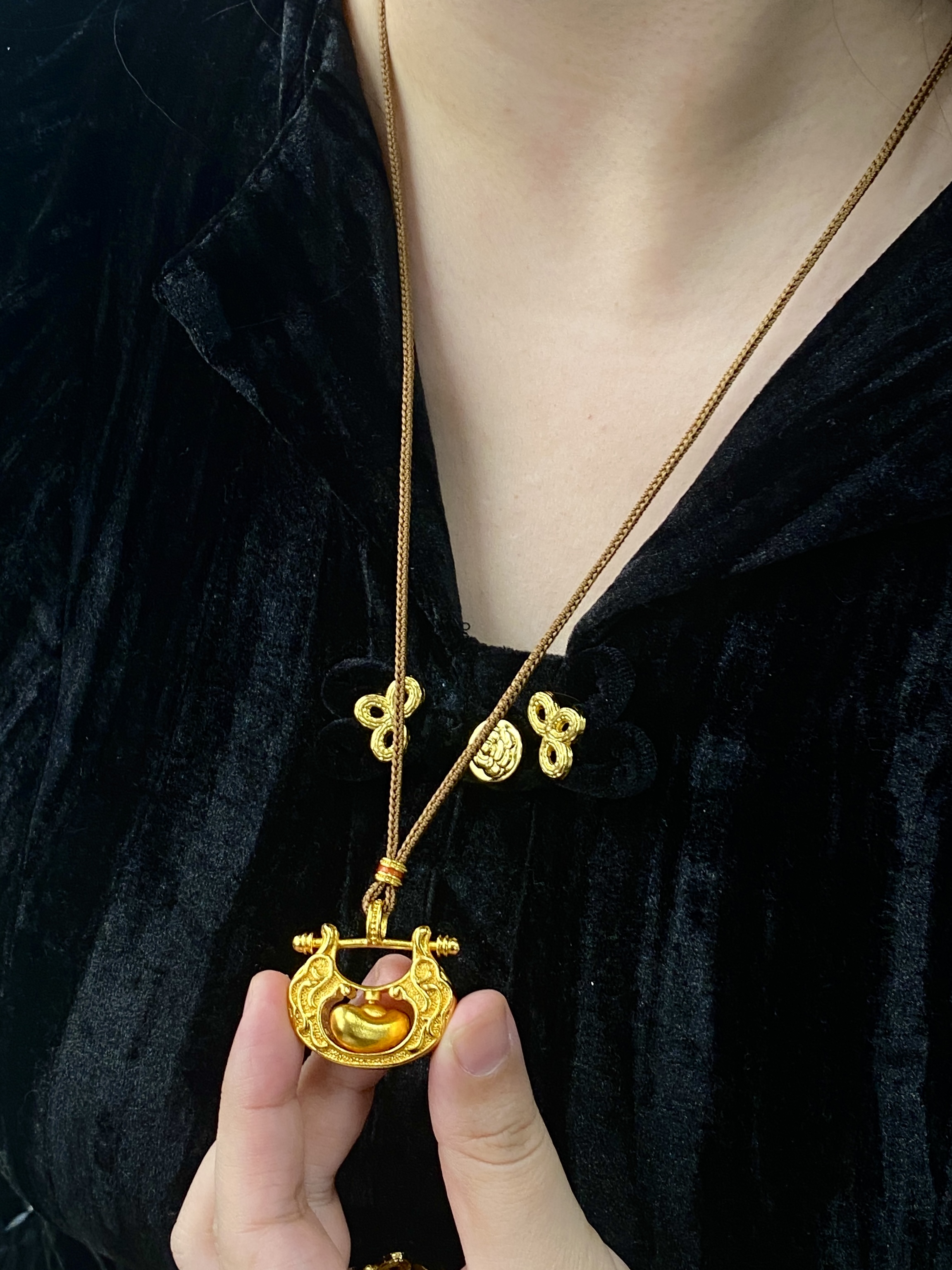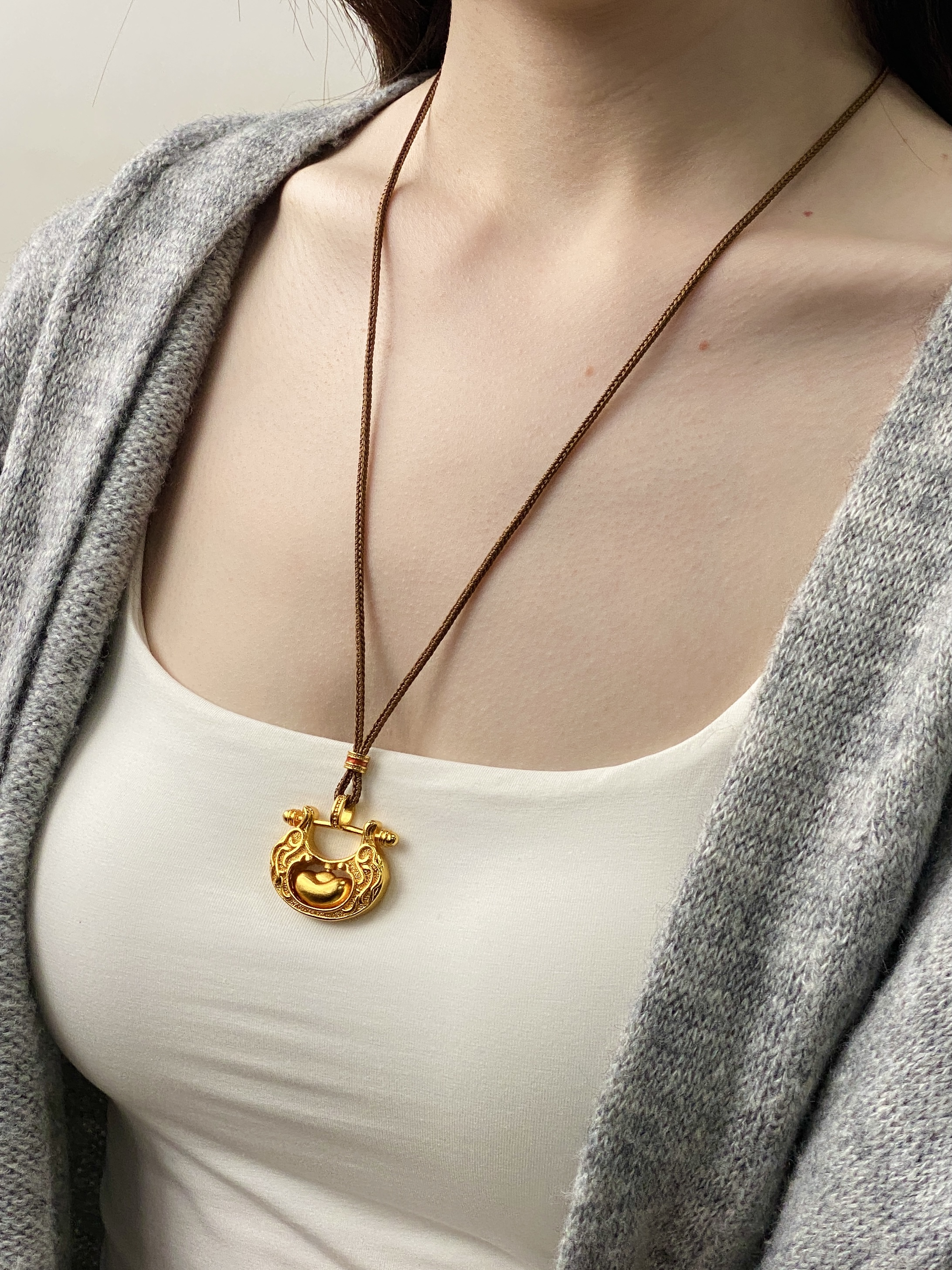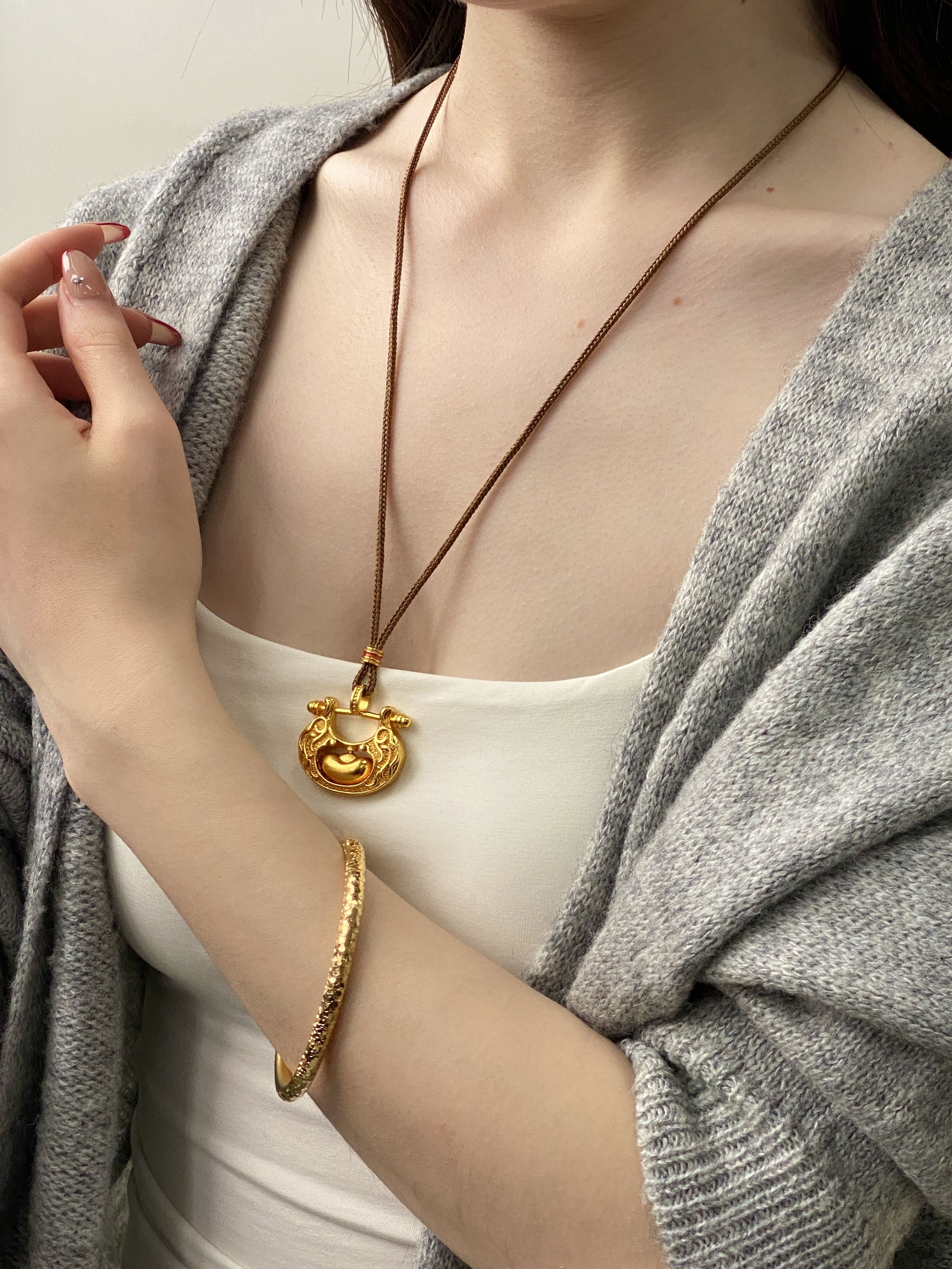 油蜡绳 + 镀金吊坠的组合,中和了金属的厚重,让国风配饰跳出 “老气” 标签,年轻感与复古感并存