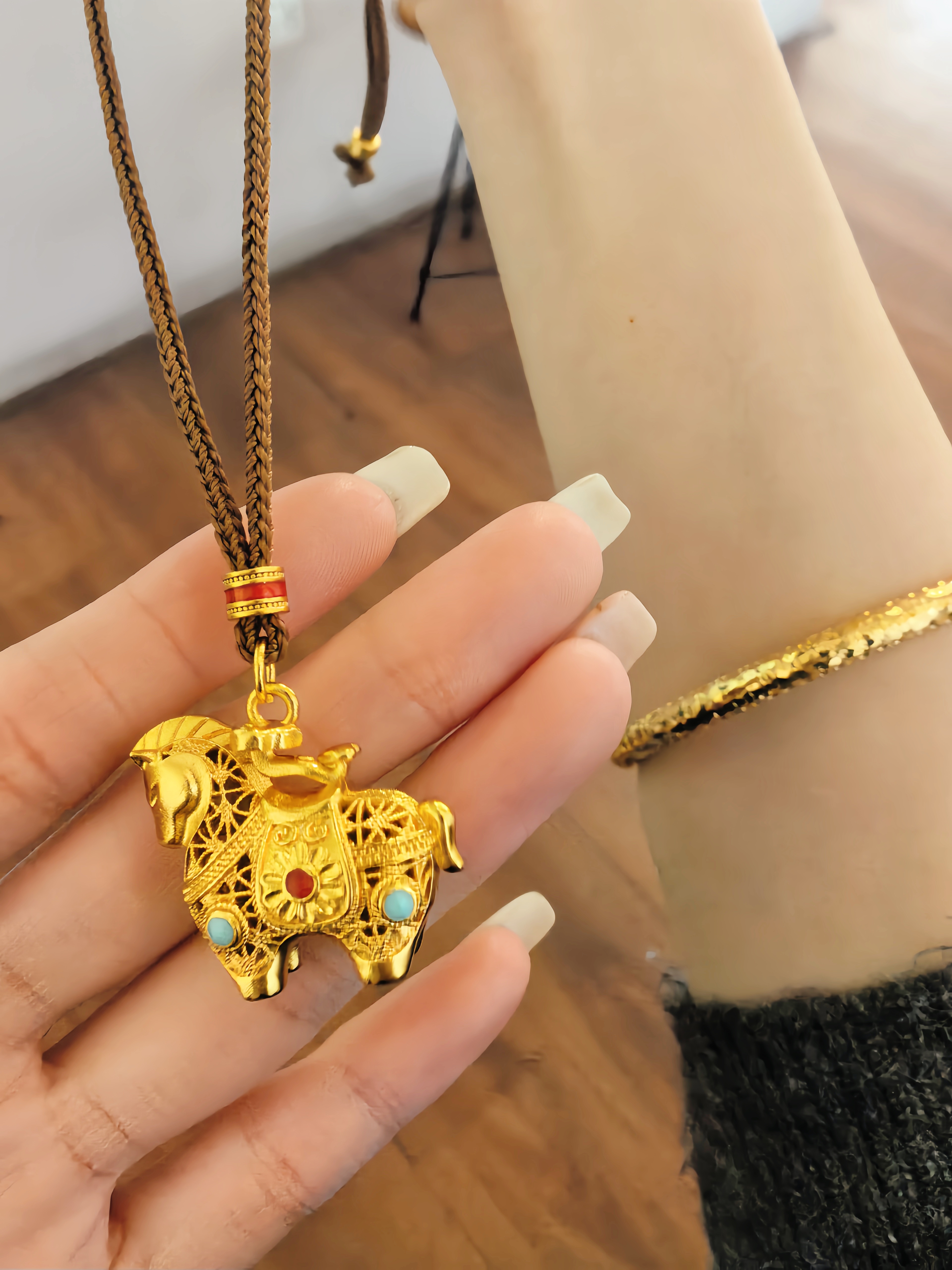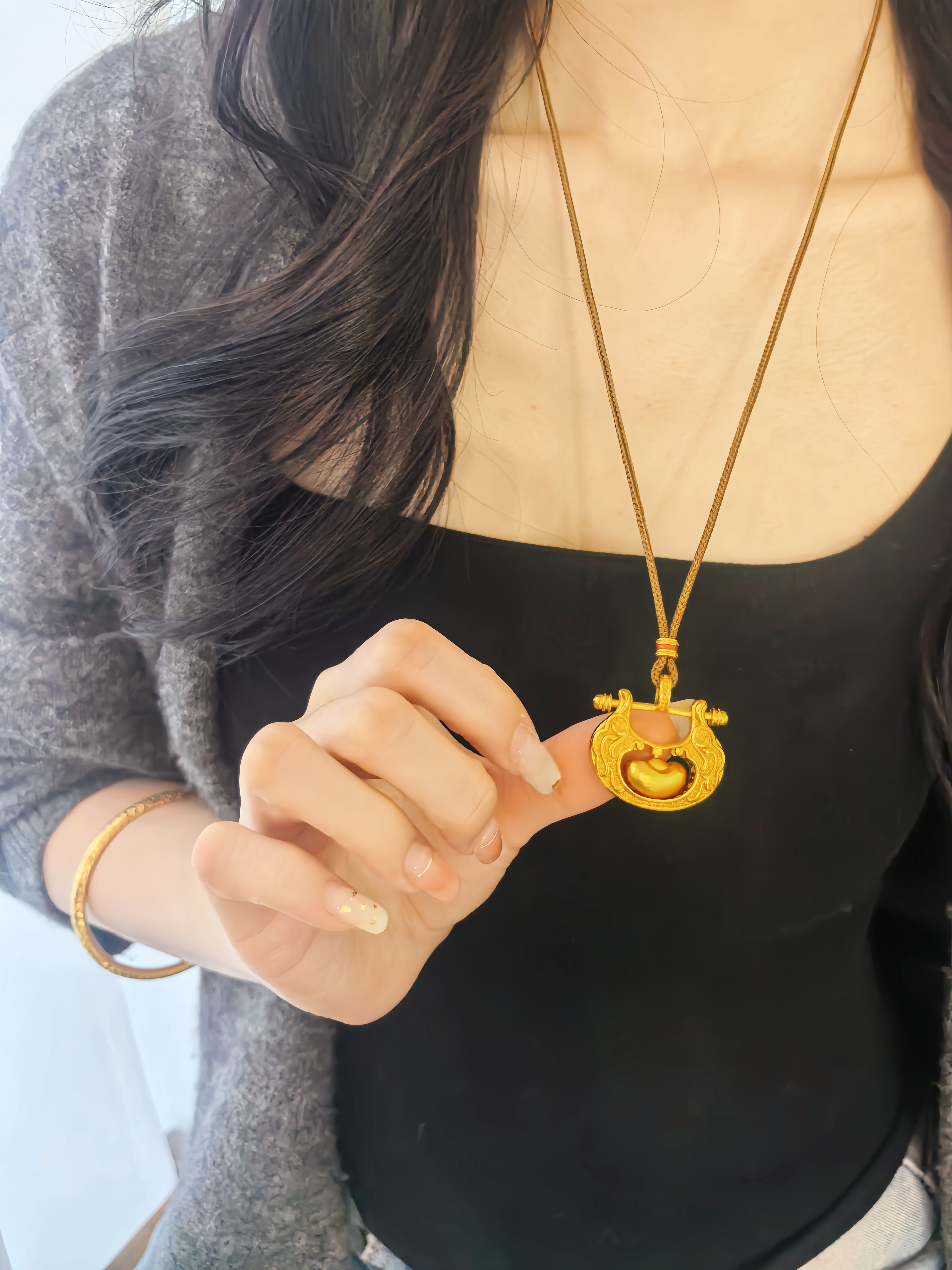 采用铜镀金 + 古法工艺,色泽温润如传统金器,表面肌理细腻有质感,不易氧化褪色;